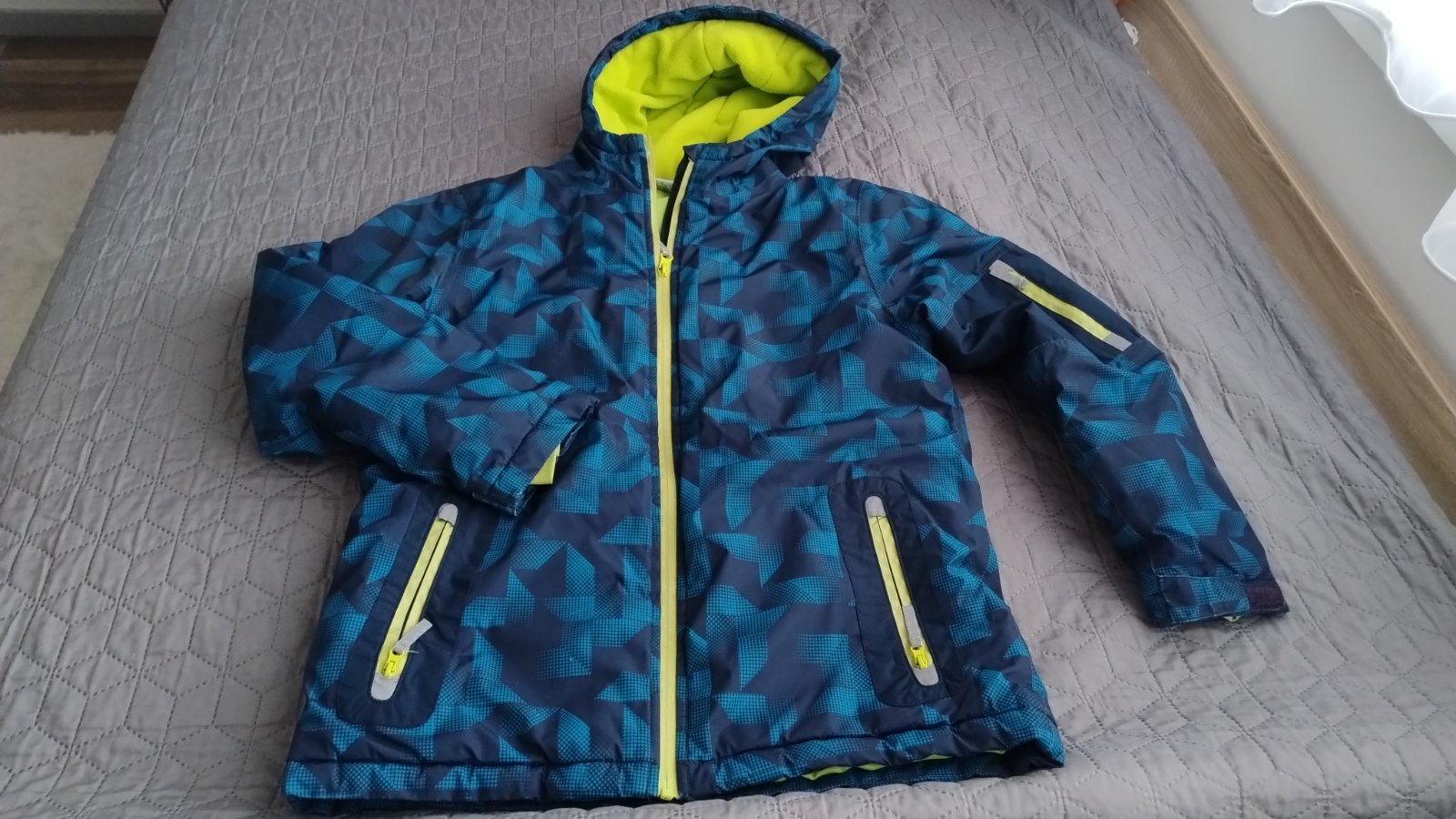 Zimná bunda veľkosť 146/152. Dĺžka zipsu 59 cm, šírka meraná pod rukávmi 46 cm.