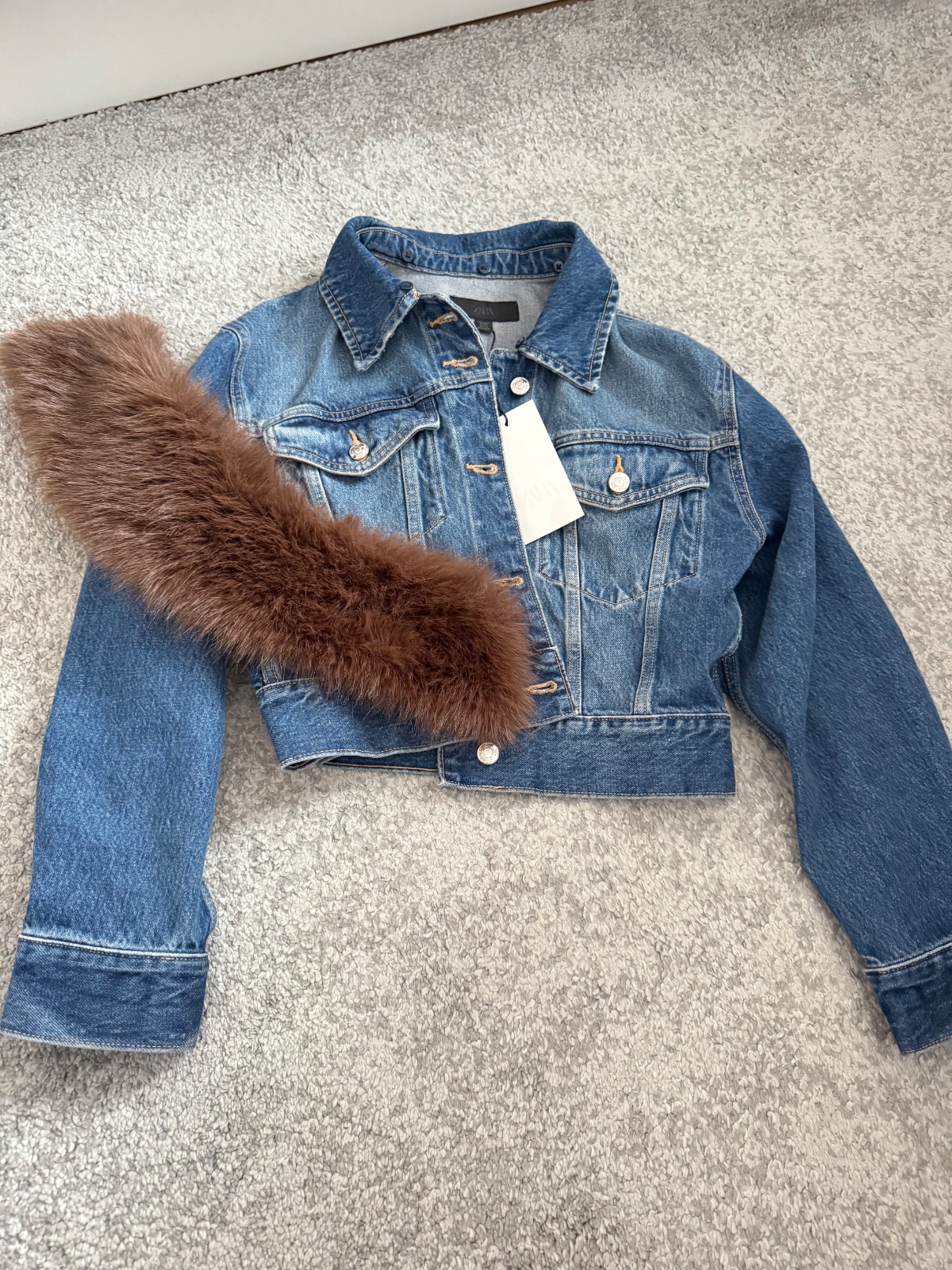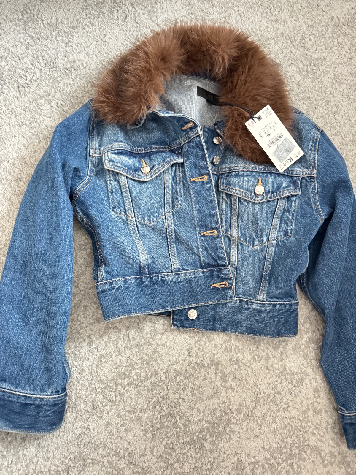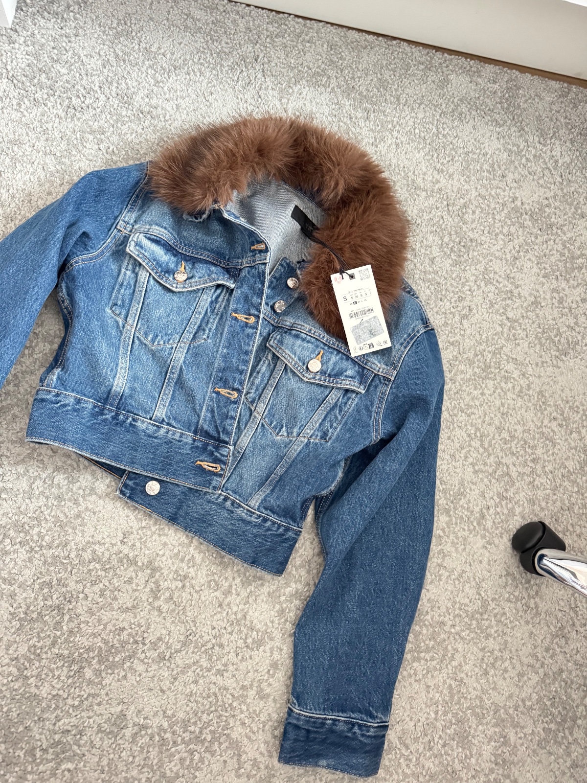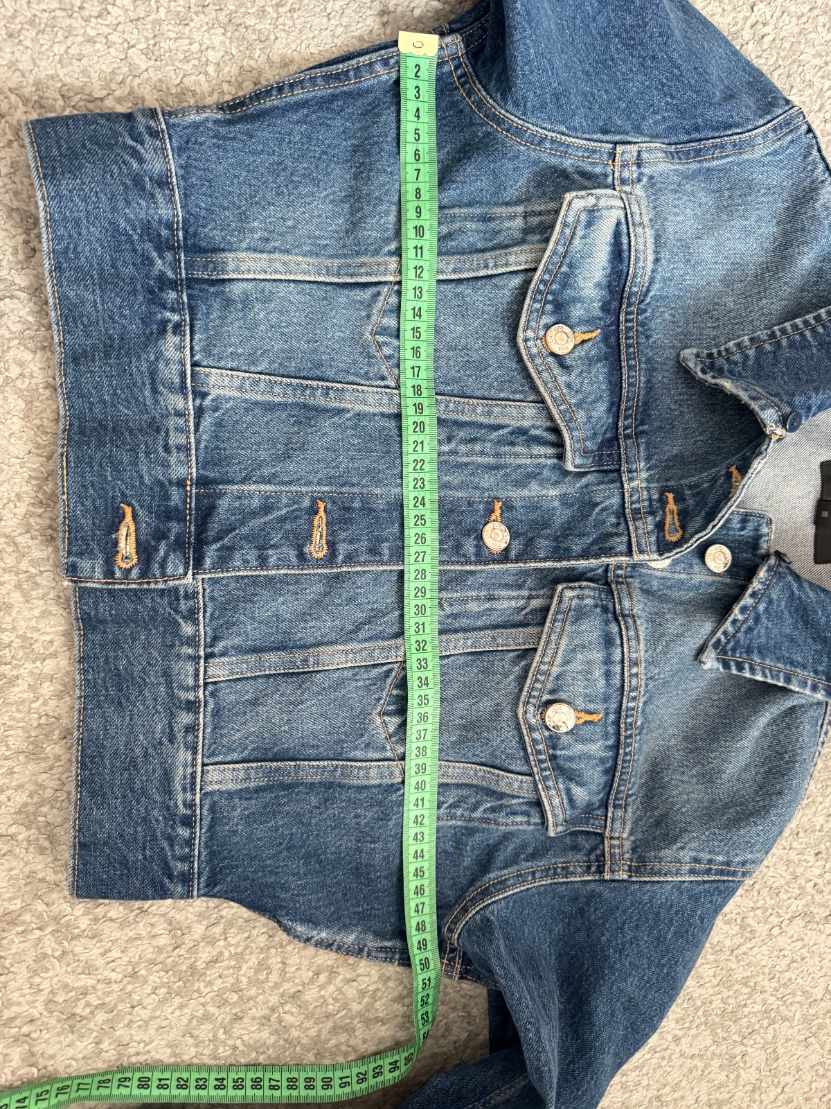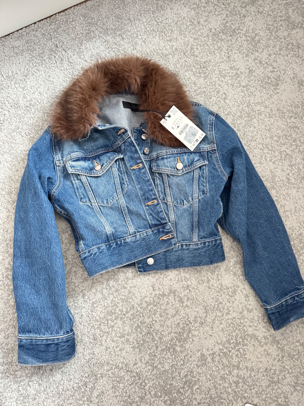 Prechodná semišová bunda na viacero spôsobov nosenia. Veľkosť S. Dĺžka 56 cm a prsia 41 cm.