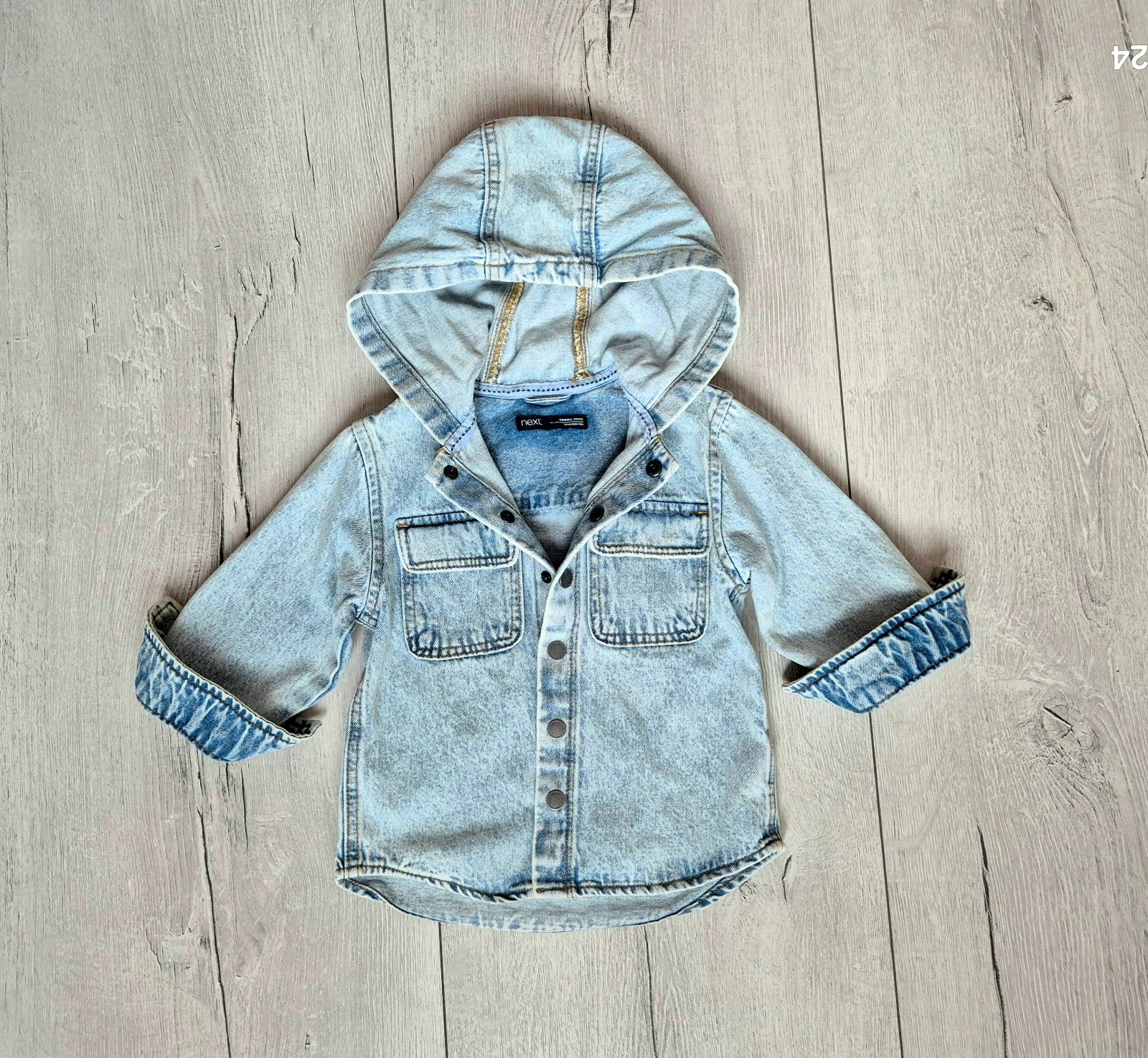 Stylova riflovka pre chlapčeka s kapucňou na cvoky v super stave bez poškodenia