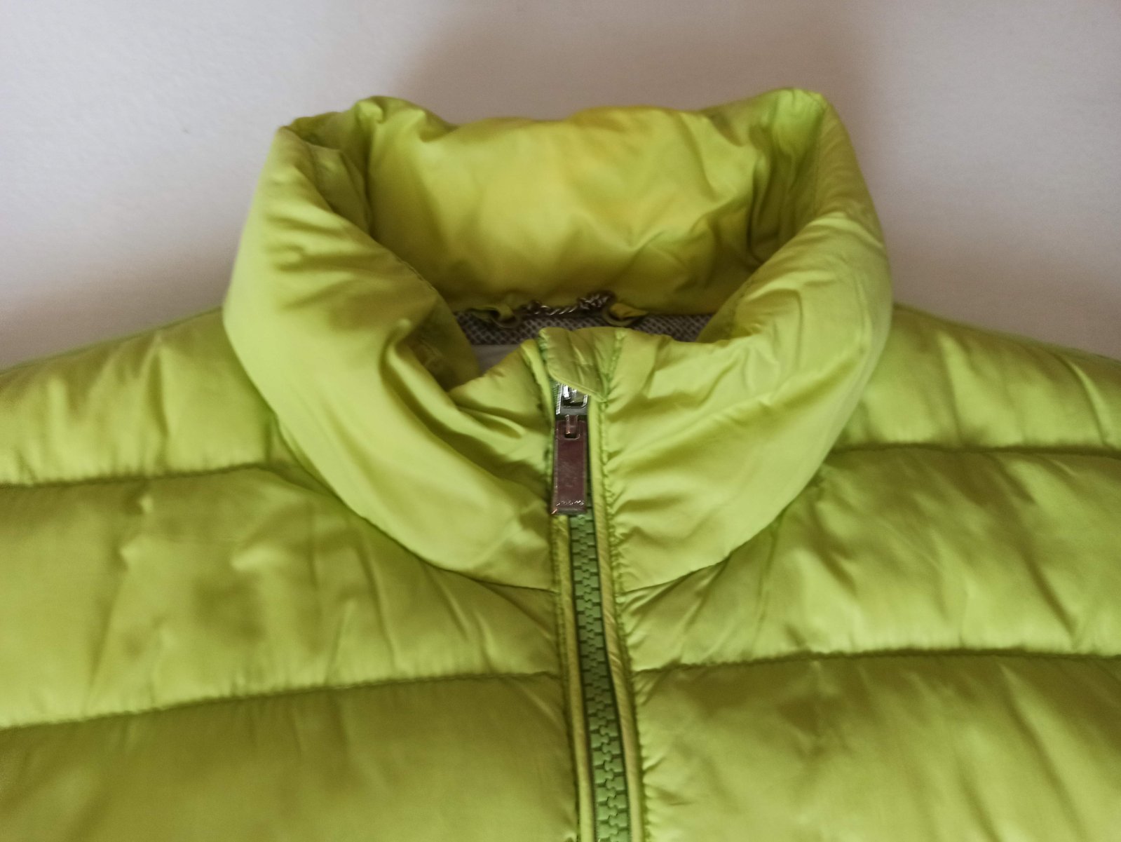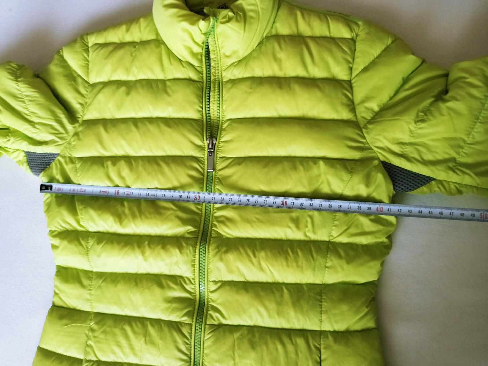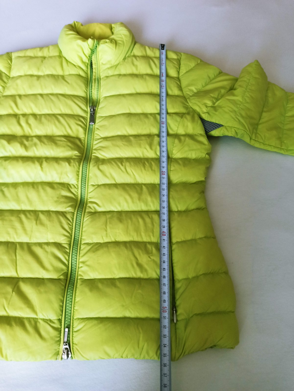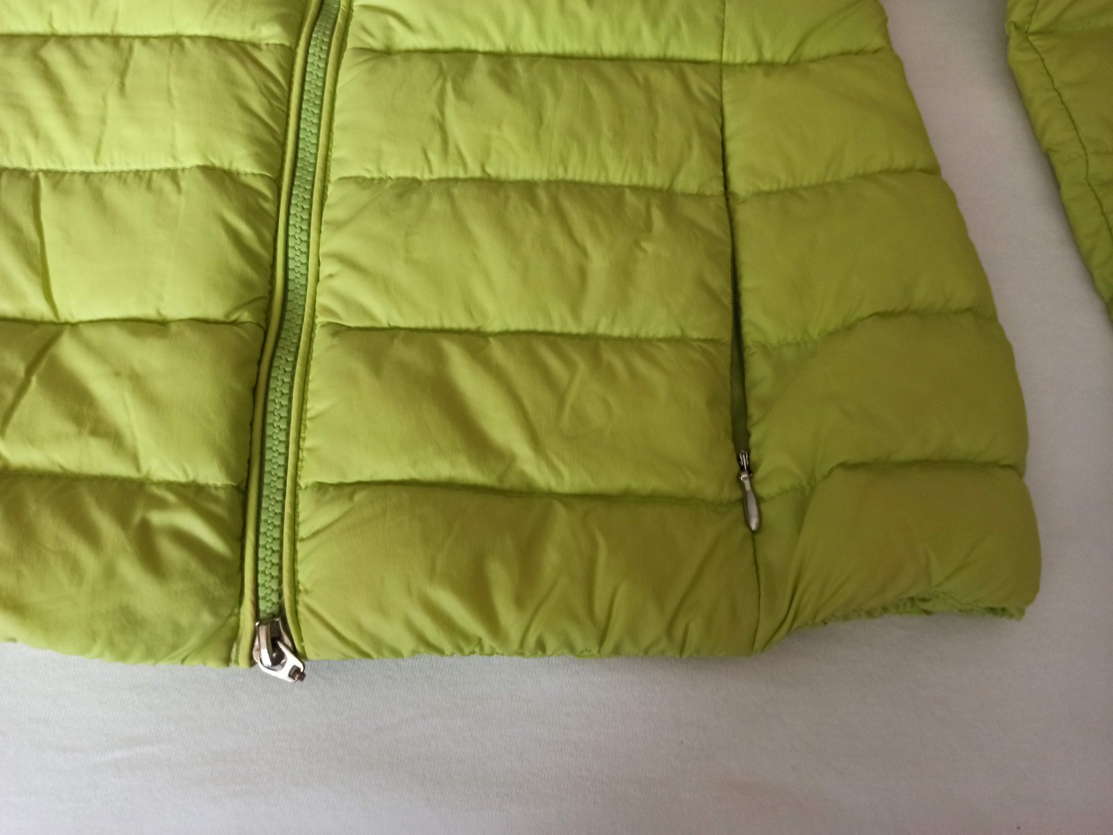Tenšia, ľahučká páperová bunda, zopár fliačikov na rukáve, mierne zafarbenie límca zvnútra, na foto, rozmery a zloženie na foto , neonová farba žlto zelená