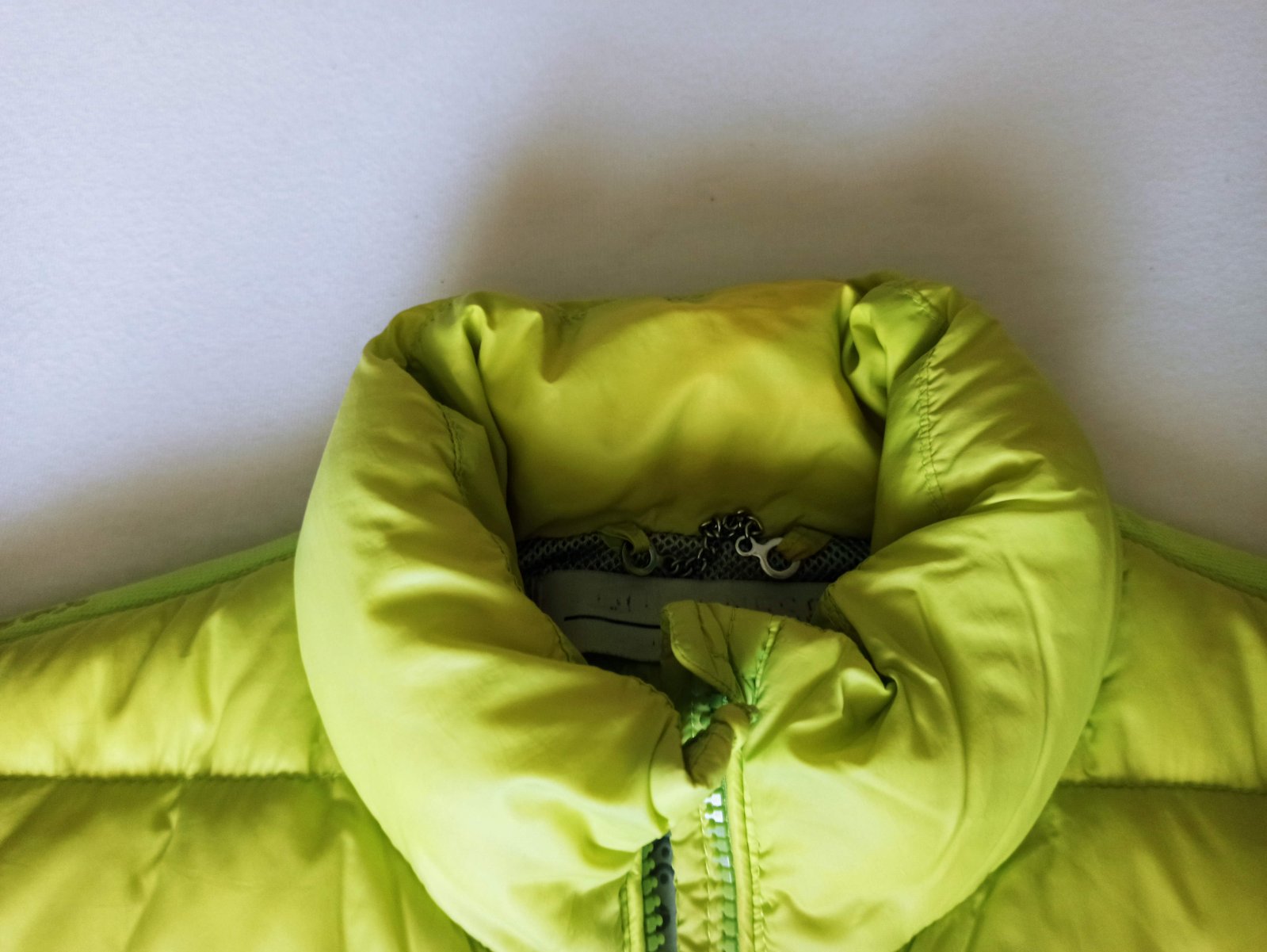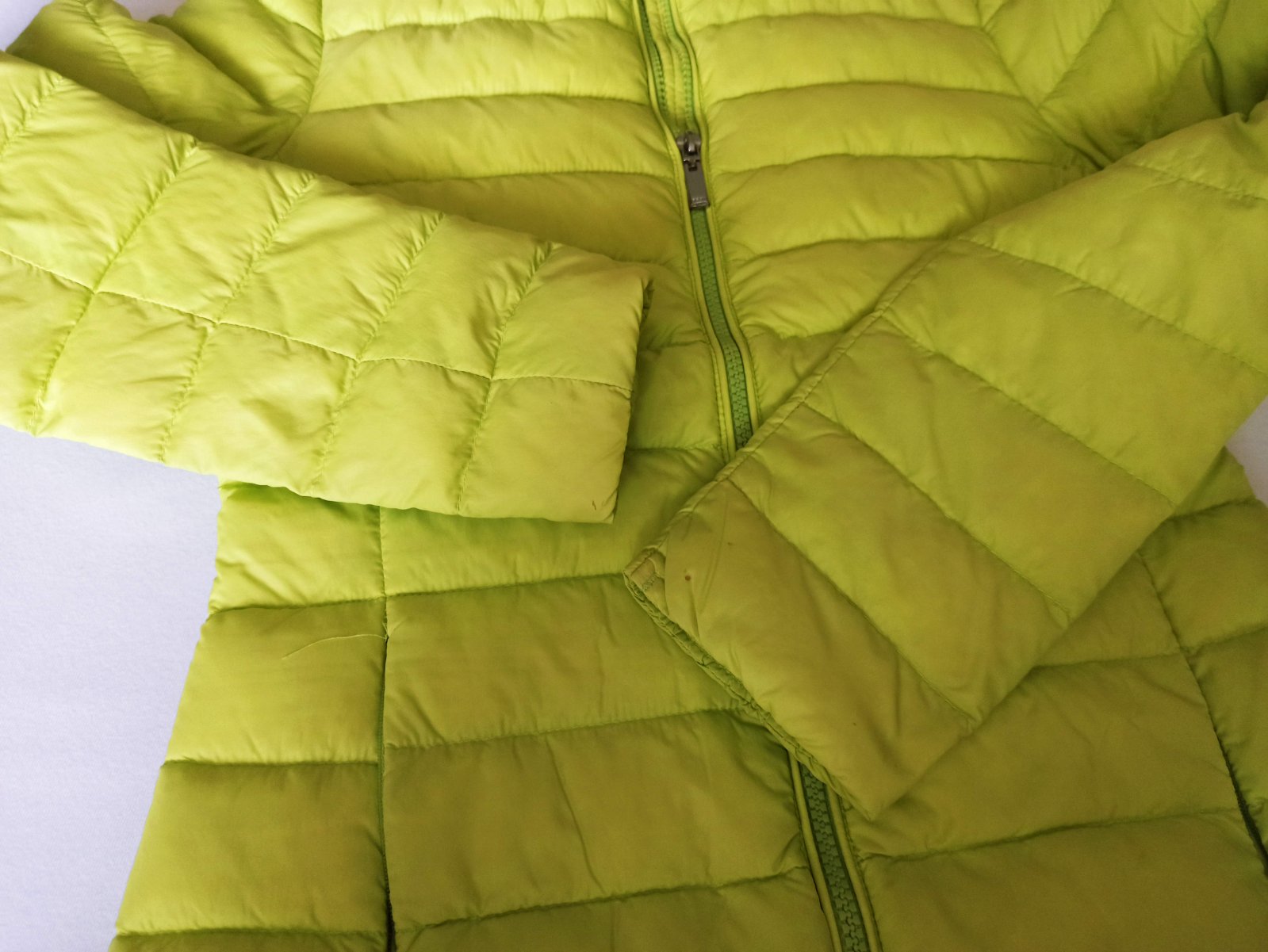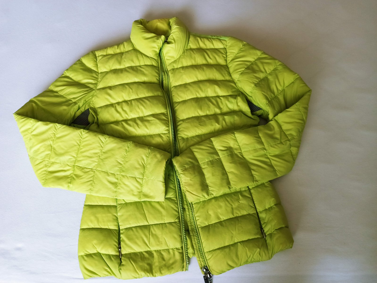 Tenšia, ľahučká páperová bunda, zopár fliačikov na rukáve, mierne zafarbenie límca zvnútra, na foto, rozmery a zloženie na foto , neonová farba žlto zelená