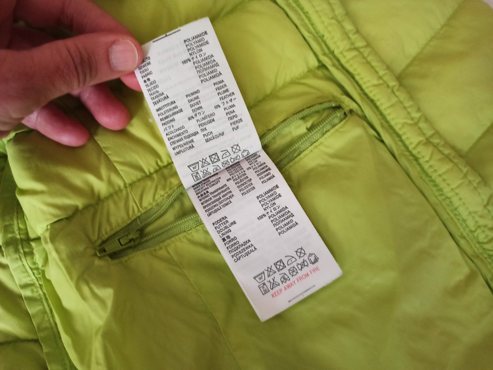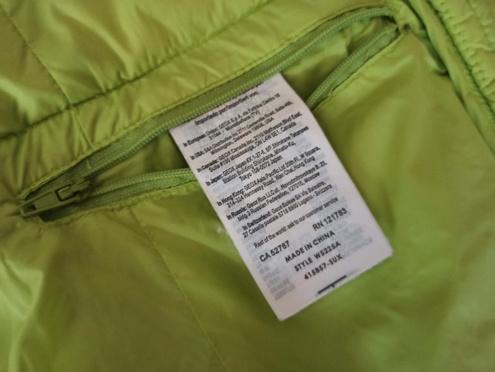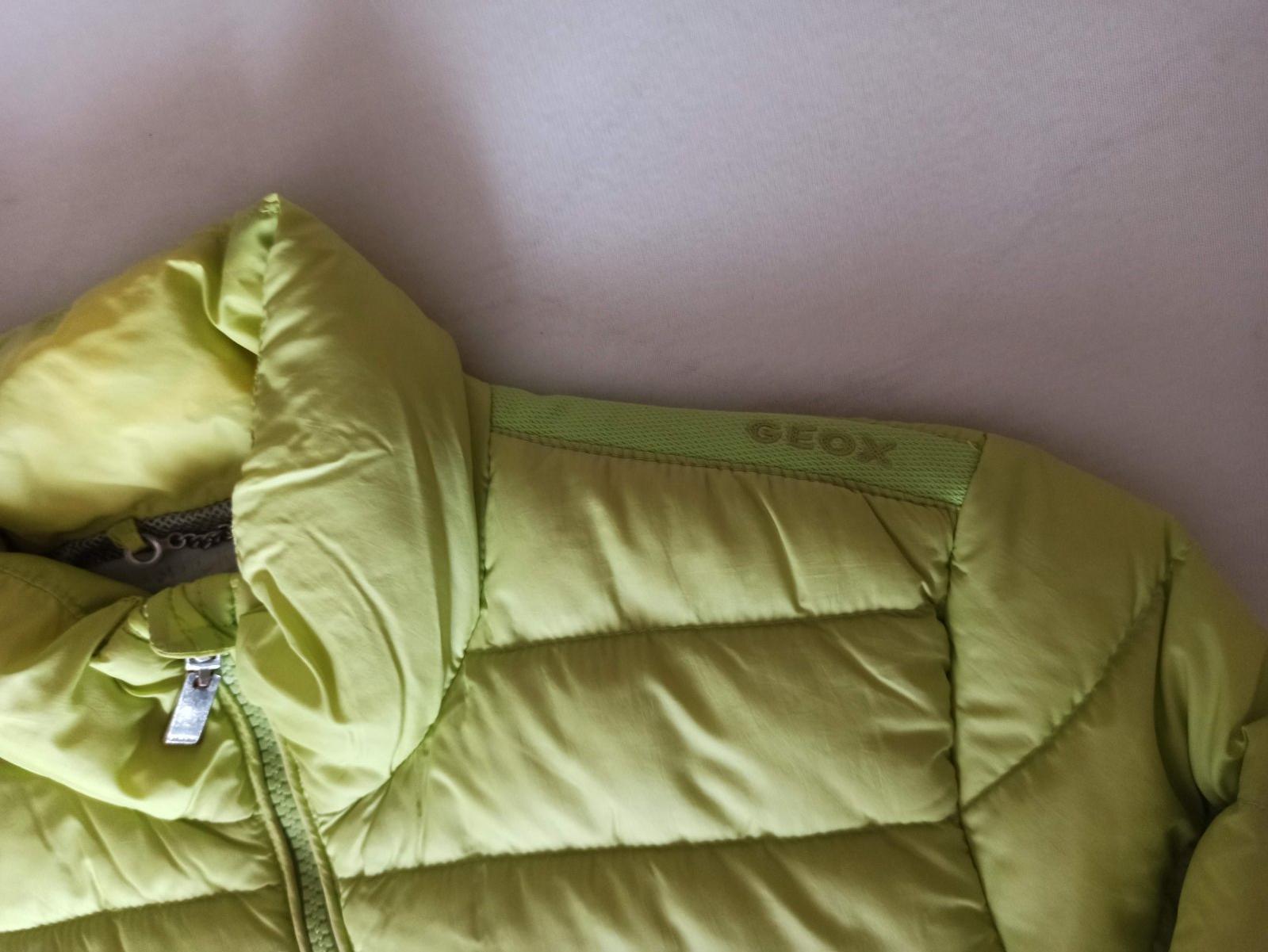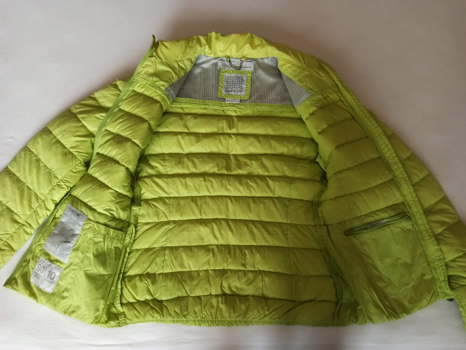 Tenšia, ľahučká páperová bunda, zopár fliačikov na rukáve, mierne zafarbenie límca zvnútra, na foto, rozmery a zloženie na foto , neonová farba žlto zelená