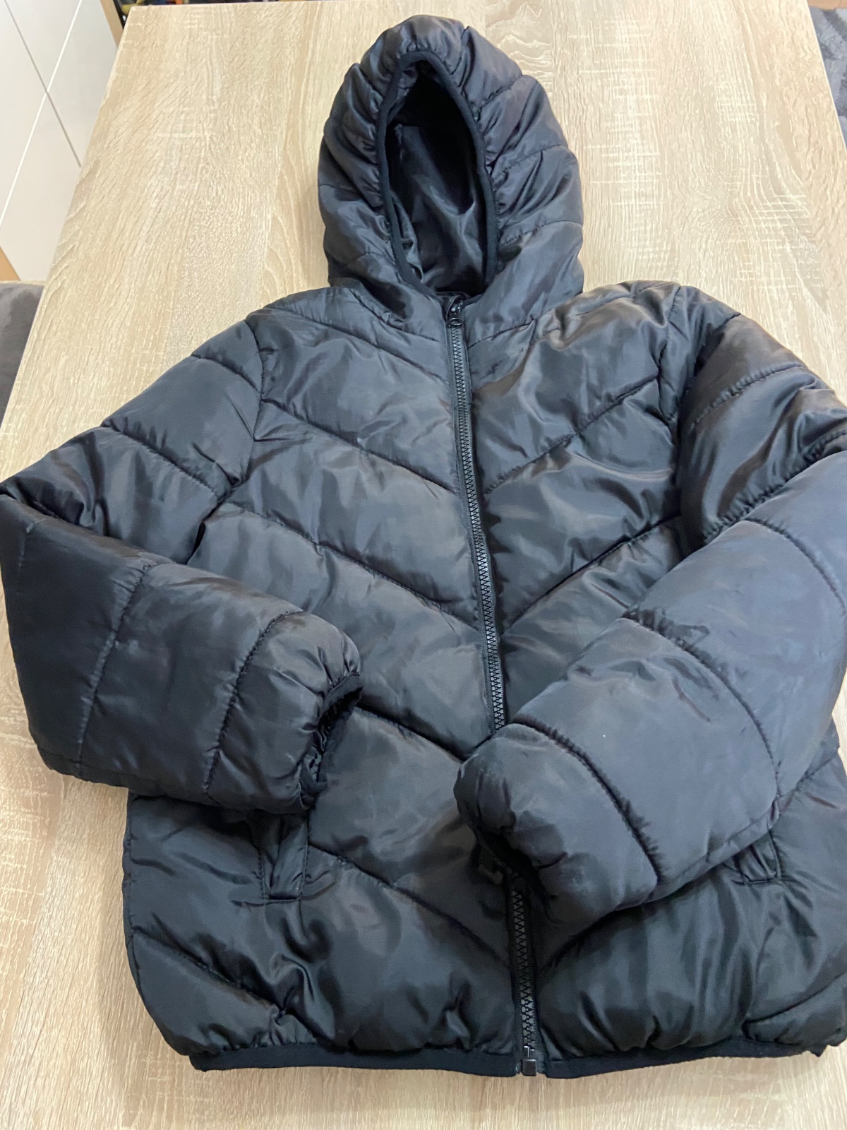 Predám tenšiu zimnú bundu vo vel.146 zo Sinsay,vhodnú na prechod resp.miernejšiu zimu.Rozmery:šírka-44cm,dĺžka-53cm,rukáv od krku-61cm.Malé zatrhnutie- na poslednej fotke.V skutočnosti nevidno