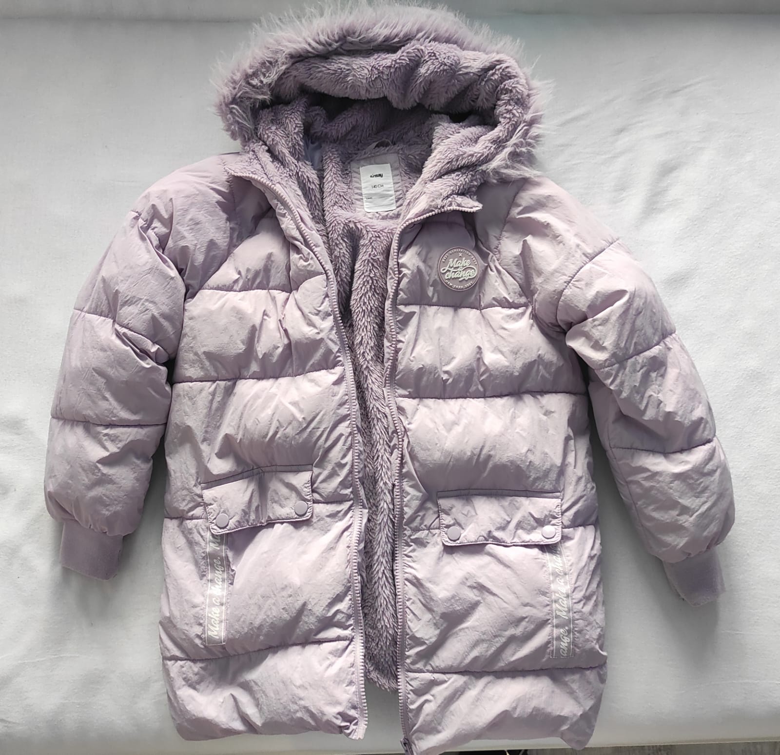 Zimná zateplená bunda s kapucňou (neodnímateľnou), použitá jednu a pol zimy, veľkosť 140. Cena 8€.