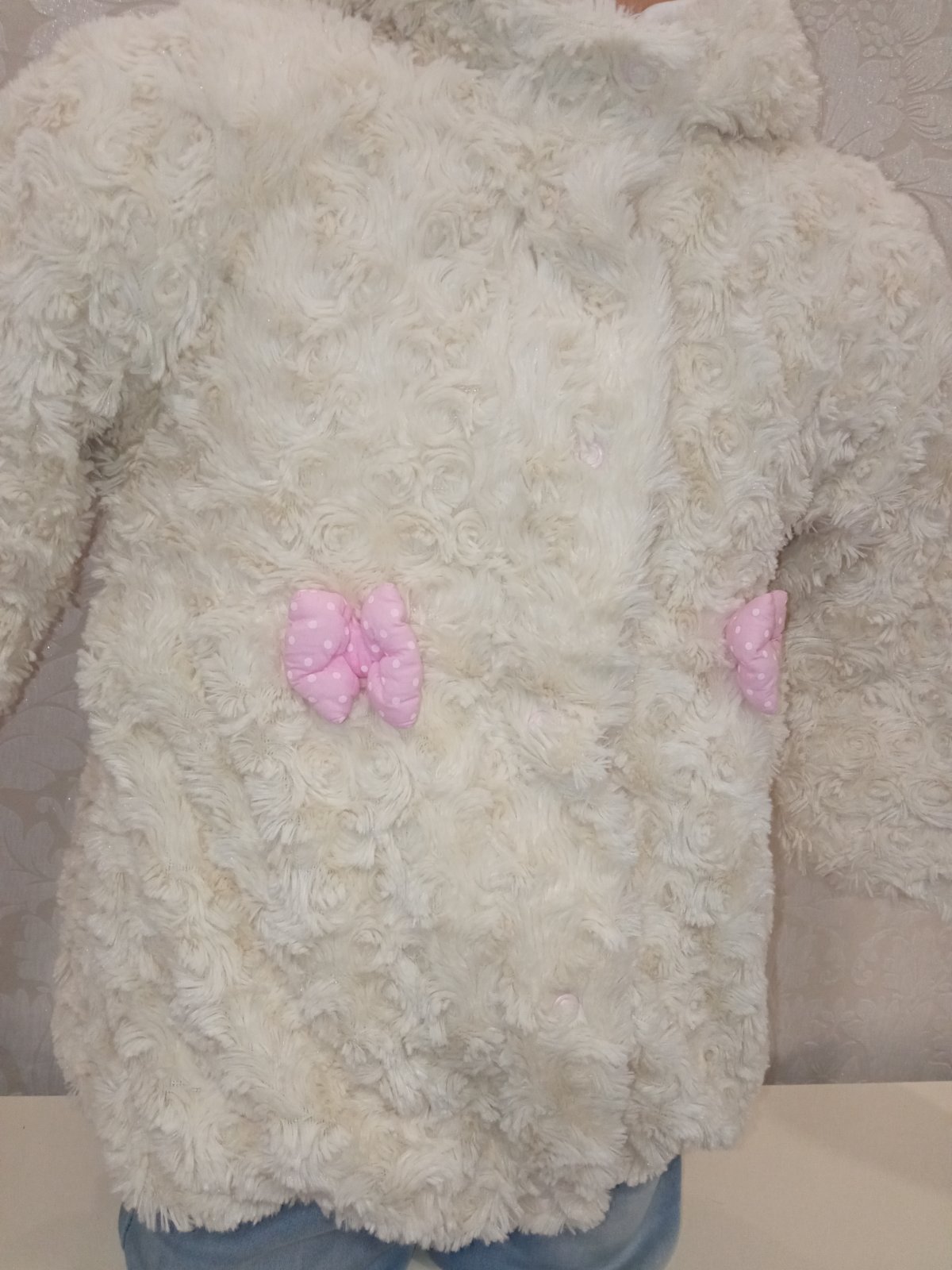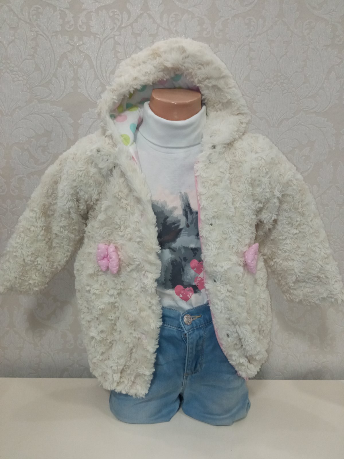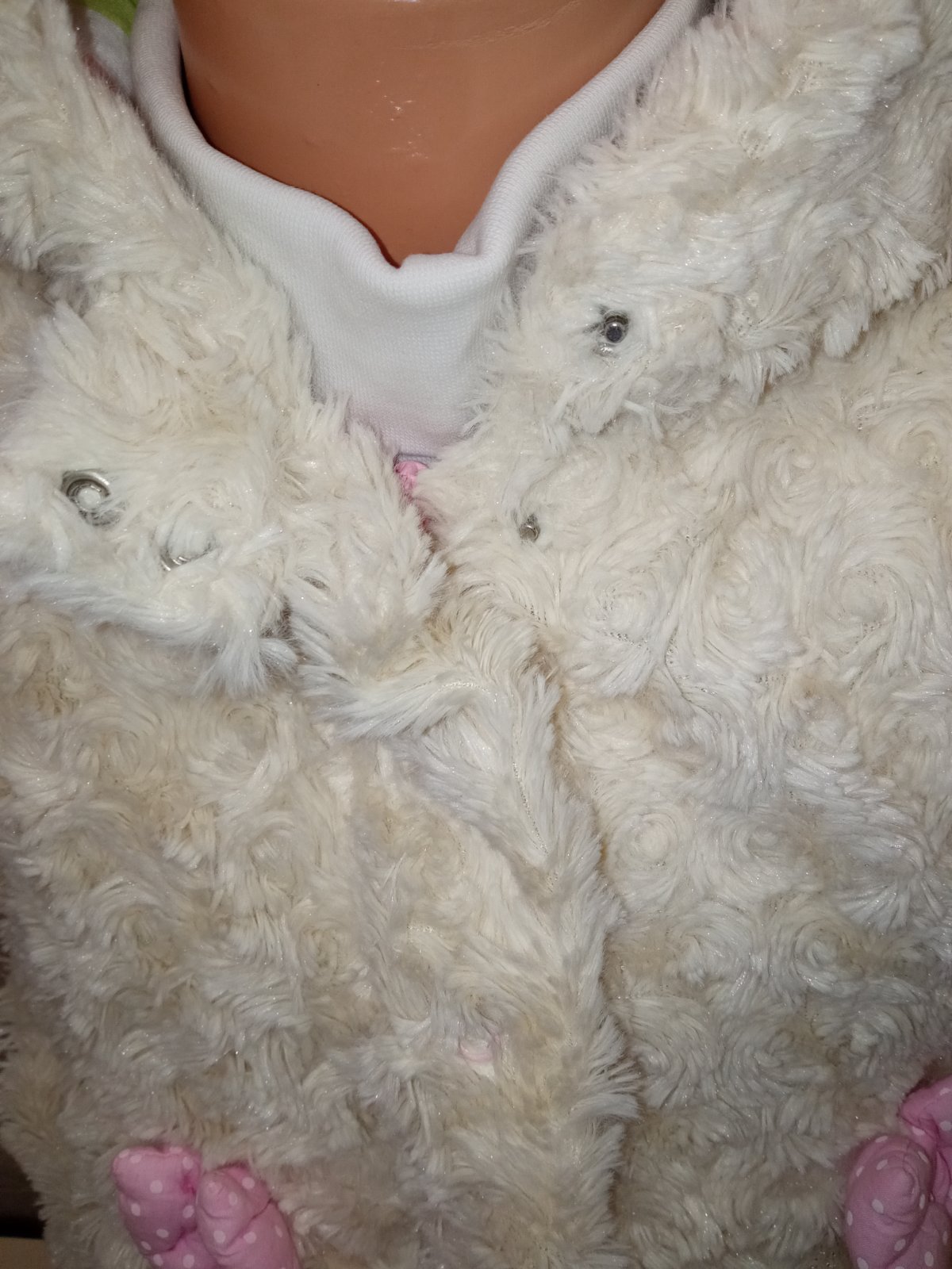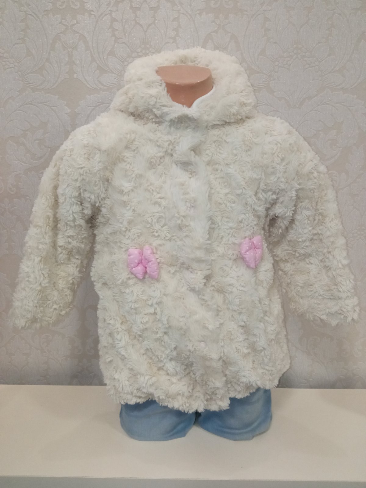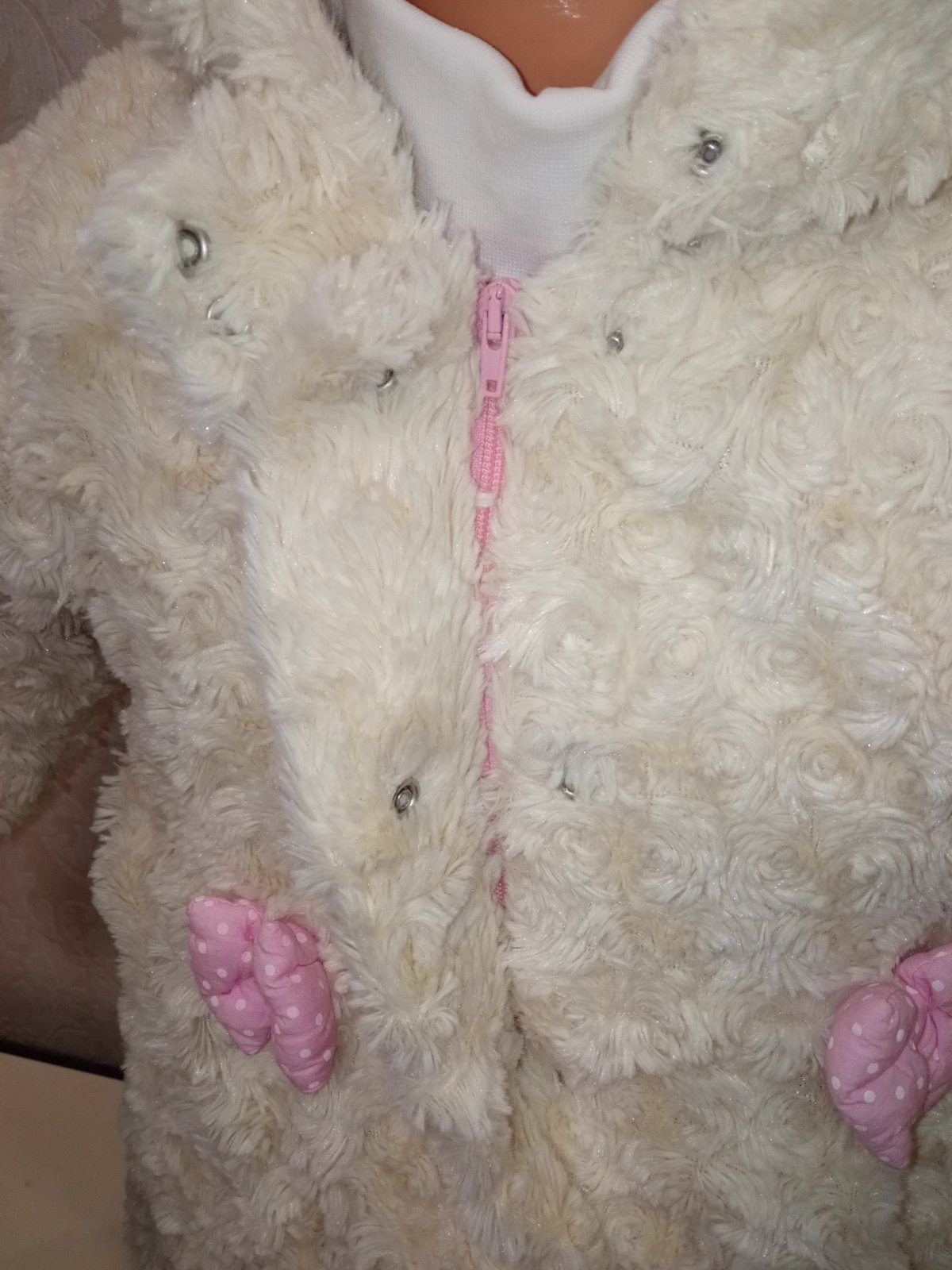 Dievčenská huňatá zimná bunda s kapucňou, zapínanie na zips a na cvoky, kapucňa nie je odnímateľná, nemá vrecká, spodok na gumu, materiál 100%polyester,vnútorná časť 100%bavlna.