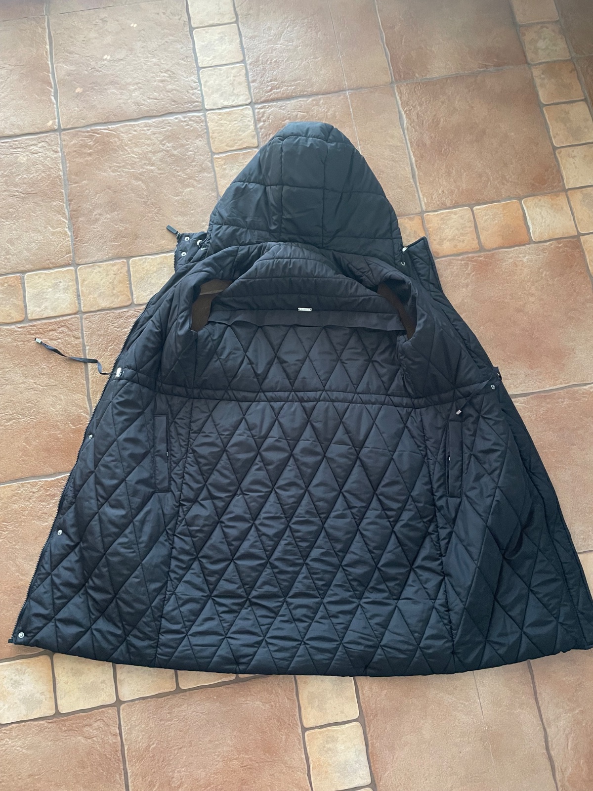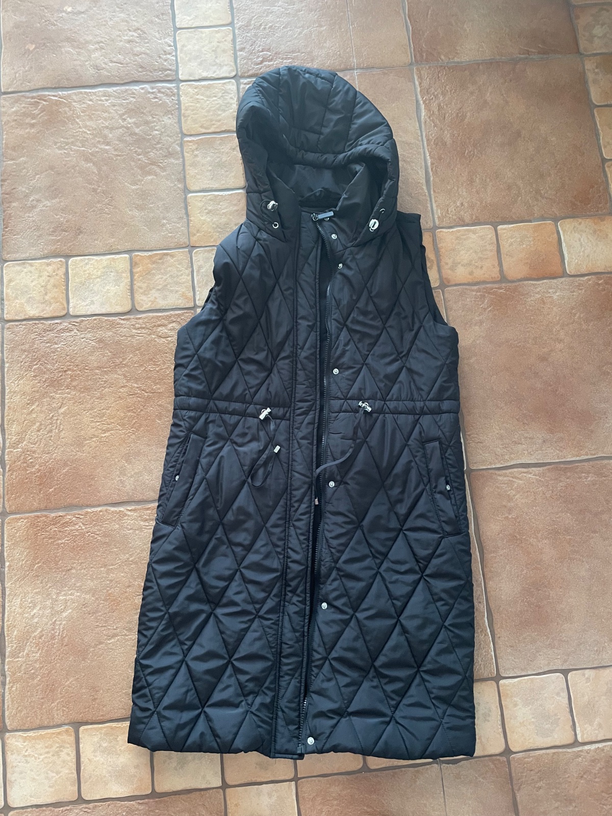 Veľmi pekny nosený stav. Bez poškodení. Kapucna je na pevno, v pase sa dá stiahnuť. Dĺžka 90cm, sirka 2x50cm.