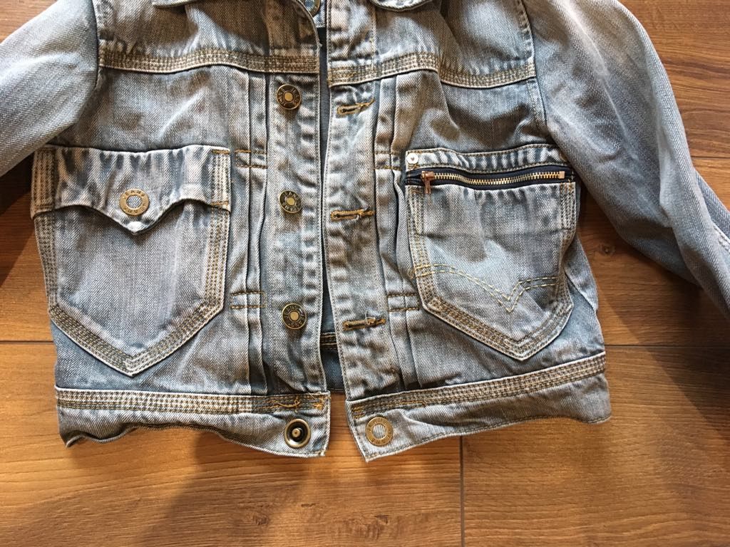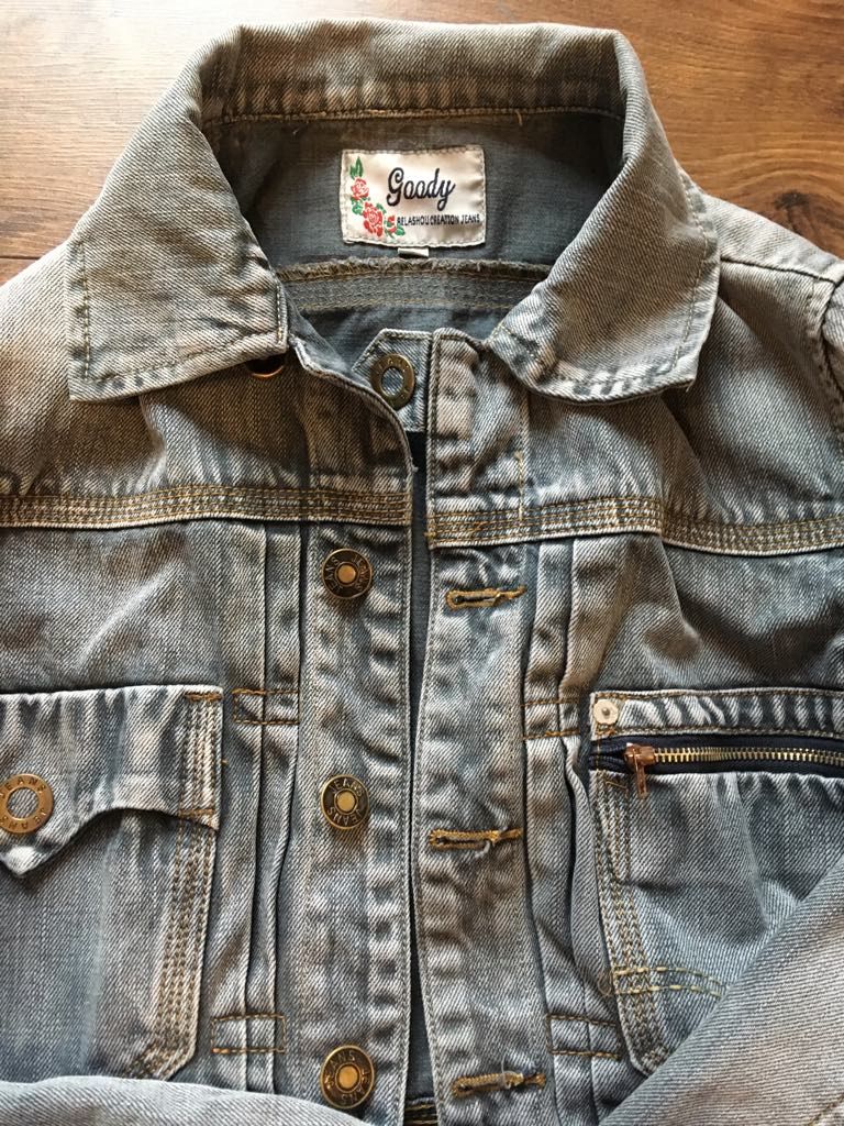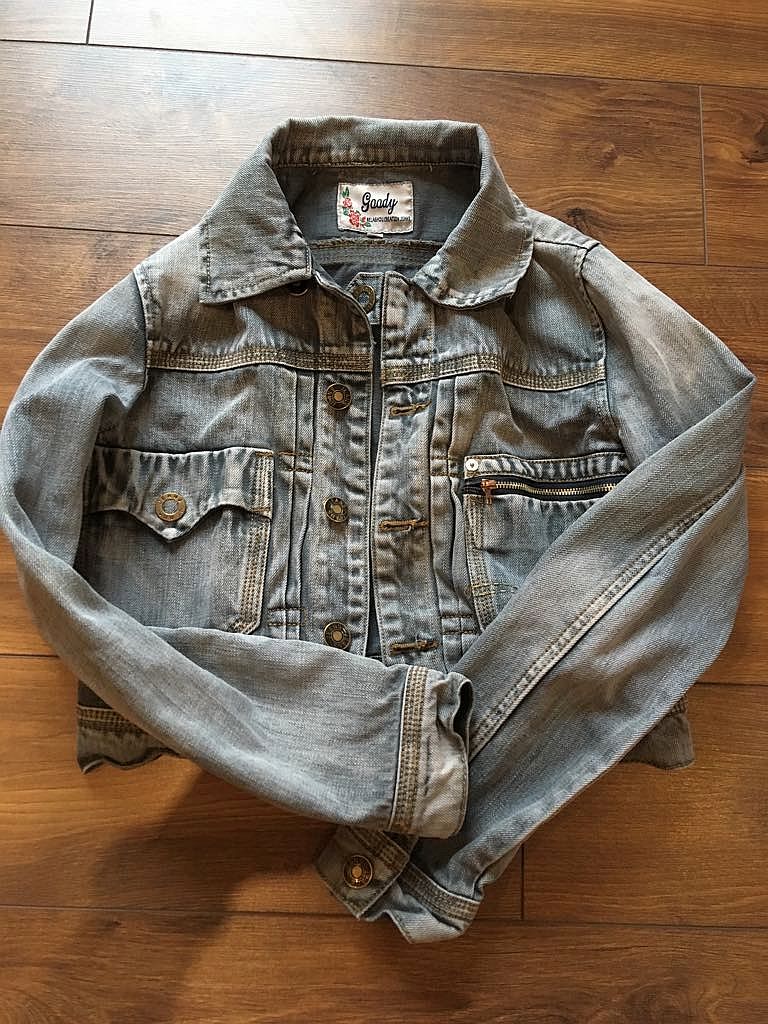 Rifľová bunda vyšuchaného vzhľadu, písaná veľkosť M, ale určite len XS-S!!, bez chyby