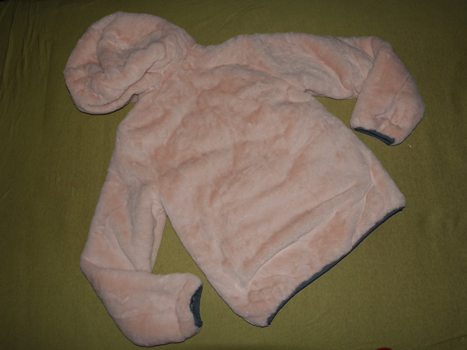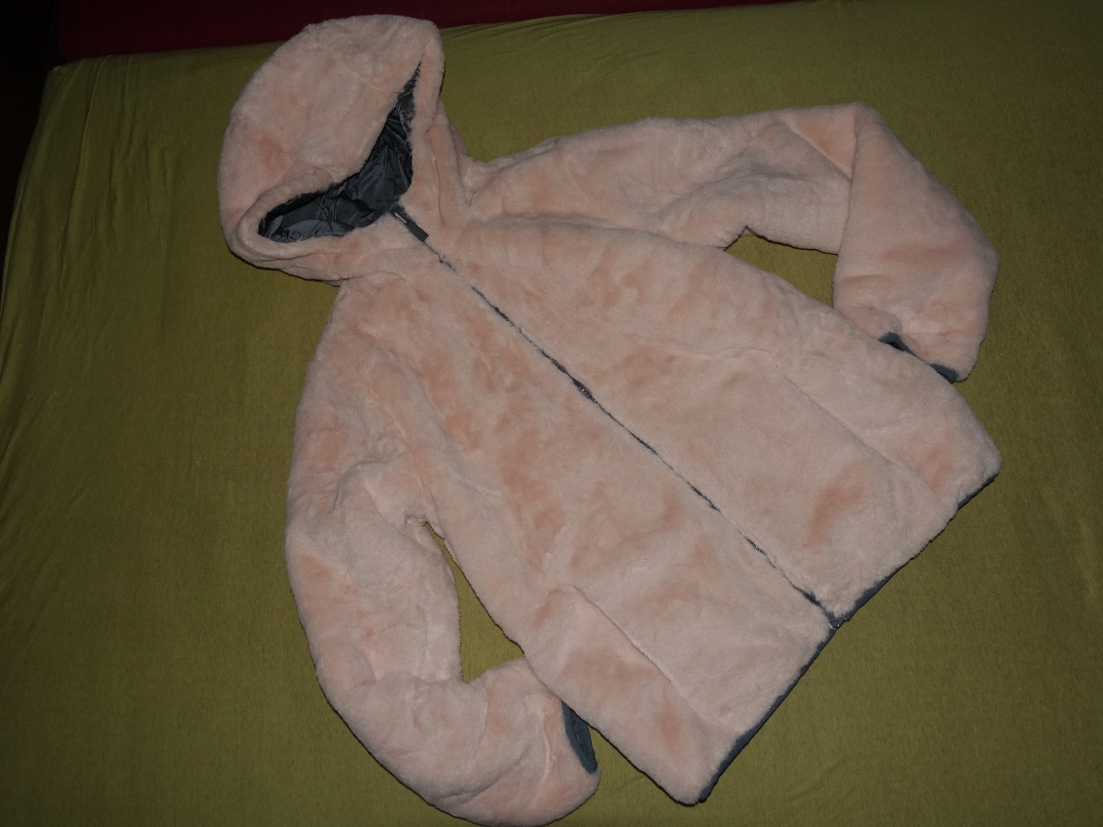 Nadherna zimna bundicka- nova, bez visaciek. Je obojstranna- z jednej strany je svetlosedy sustiak, z druhej ruzovy plys. Velkost je uvedena na 11/12rokov, ale moze byt aj dlhsie.