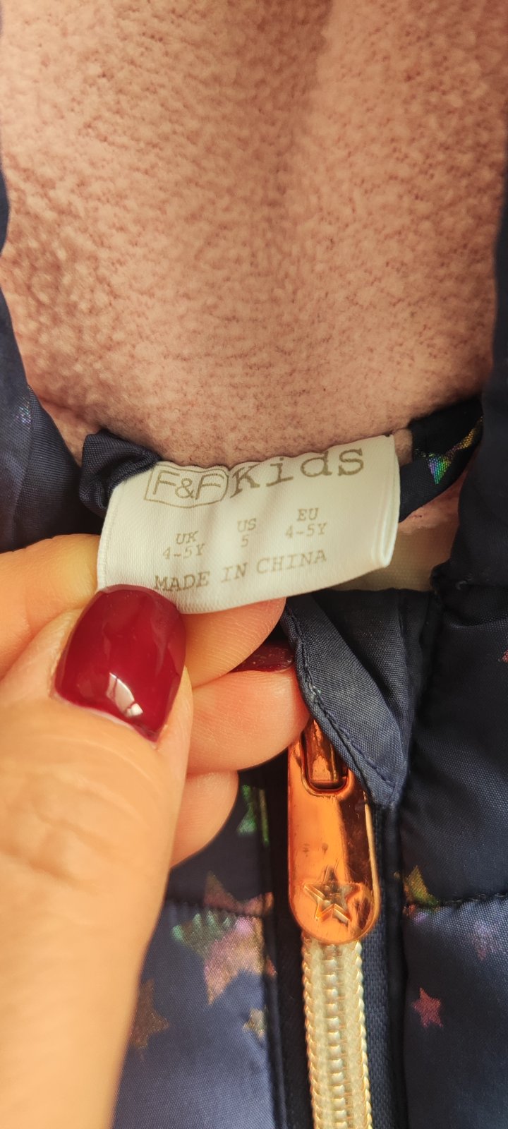 Teplá prešívaná bunda s kapucňou a dúhovými srdiečkami. Párkrát vzatá, bez poškodení. Na vnútornom štítku je napísané meno. Rozmery: - celková dĺžka: 37cm, - hrudník: cca 33cm.