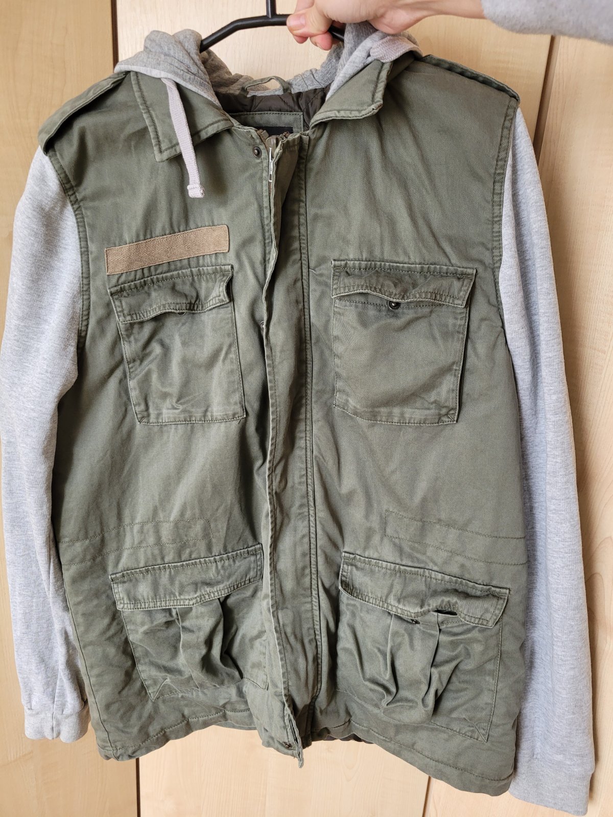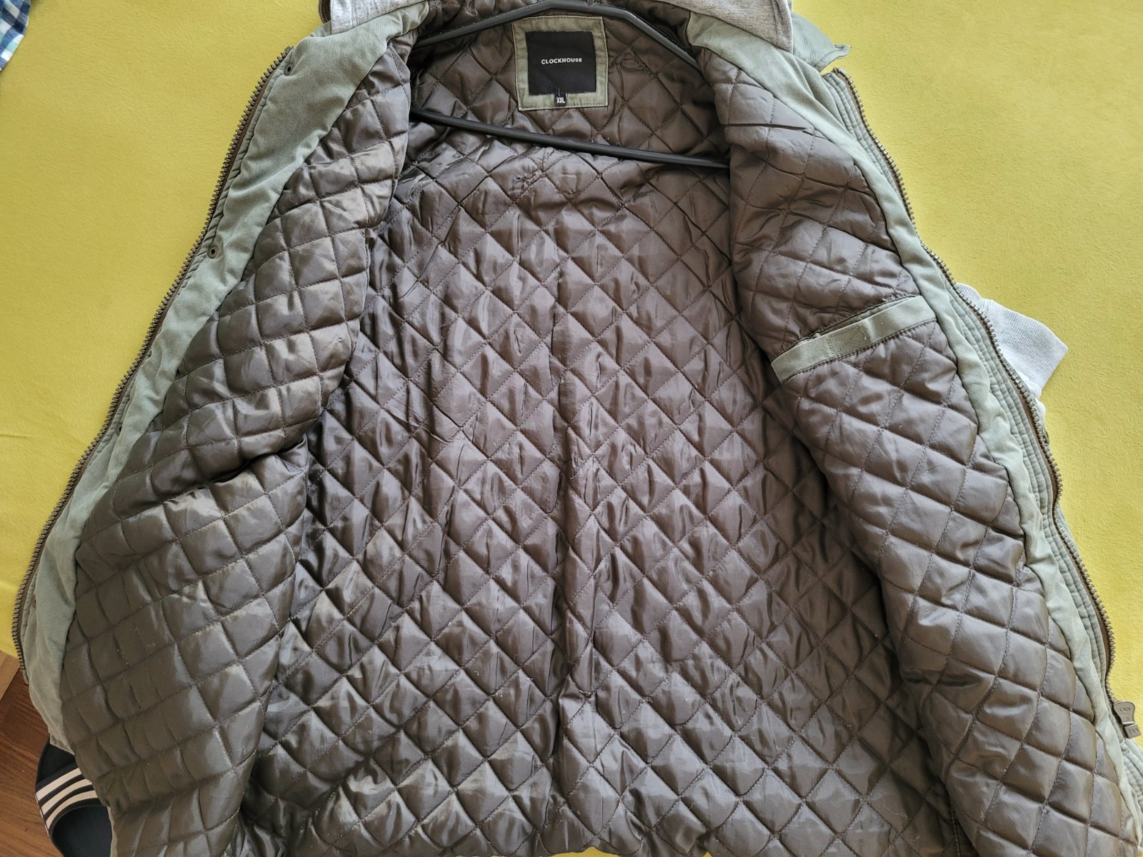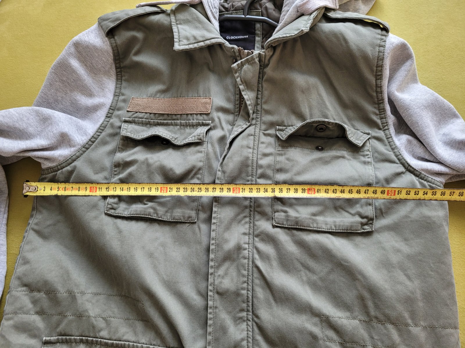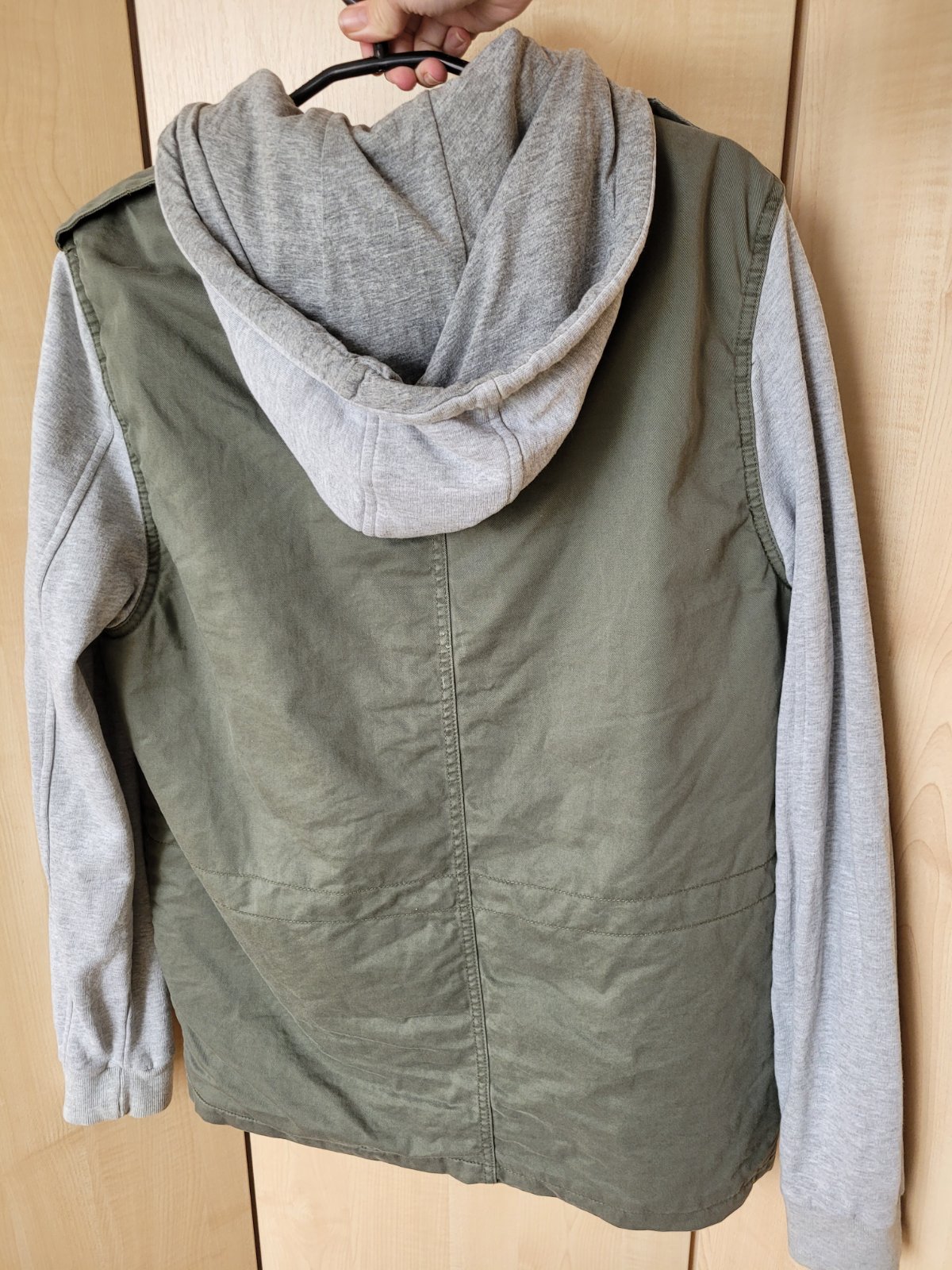 tenká bunda olivovej farby, veľ. XXL kapuca sa dá odopnúť výborný stav, len hnedá ozdoba sa lúpe (viď foto) šírka pod pažami 2x 66 cm rukáv 66,5 cm dĺžka 81 cm