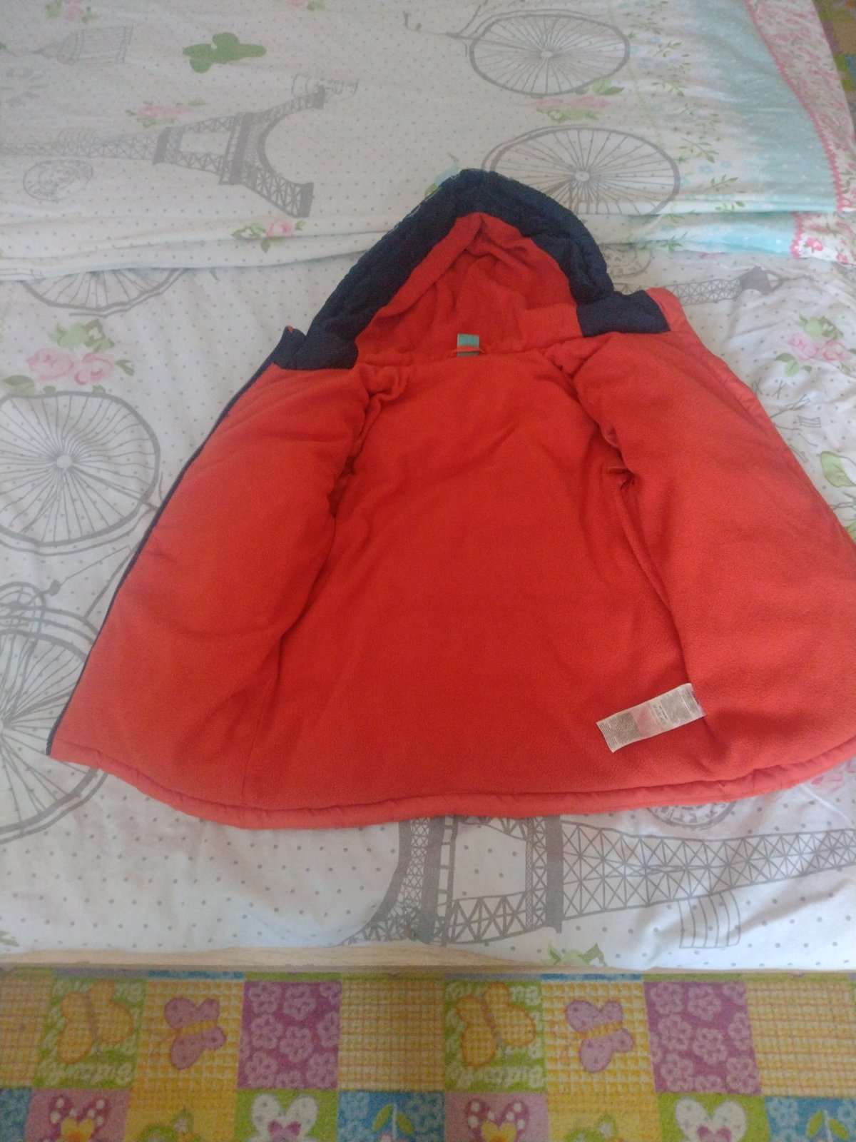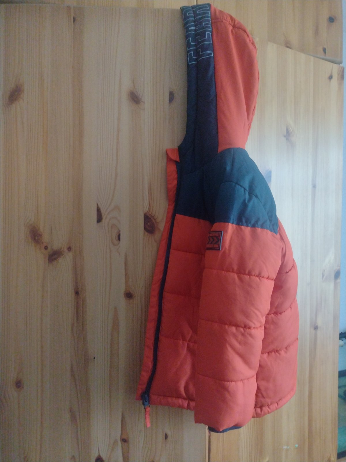 Kapucňa sa dá odzipsovat, nosenie vidno hlavne na flíse okolo rukávov, nasla som po detailnom skúmaní aj nejaké hnedé bodky v dolnej časti bundy, voľným okom nevidno. Je to dvojcislo 104/110