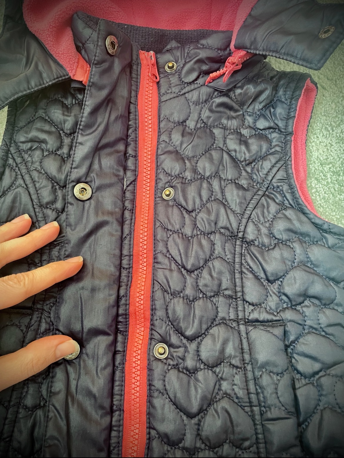 Tmavomodrá zateplená vesta so srdiečkovou výšivkou a ružovou podšívkou. Minimálne nosená, bez poškodení. S odnímateľnou kapucňou. Veľkosť 98/104.
