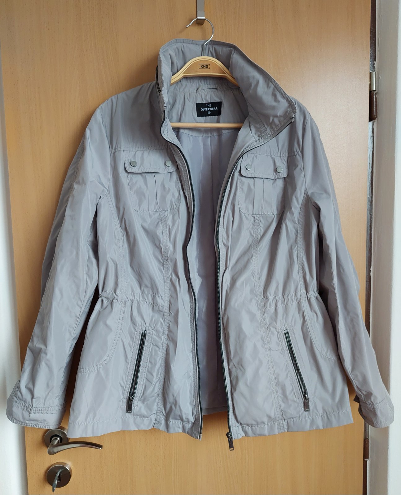 Sivá vrchná bunda, veľkosť 44, so sťahovacou šnúrkou v páse.