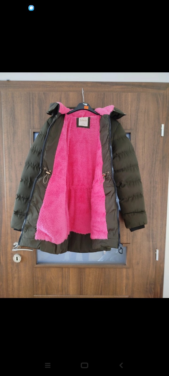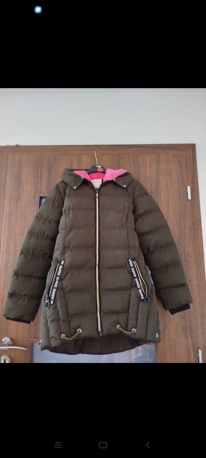 Pekná zimná bundička. Farba krajšia ako na foto. Skoro nová. Oblečená asi iba raz kôli farbe vnútra. Veľkosť písaná 16rokov.