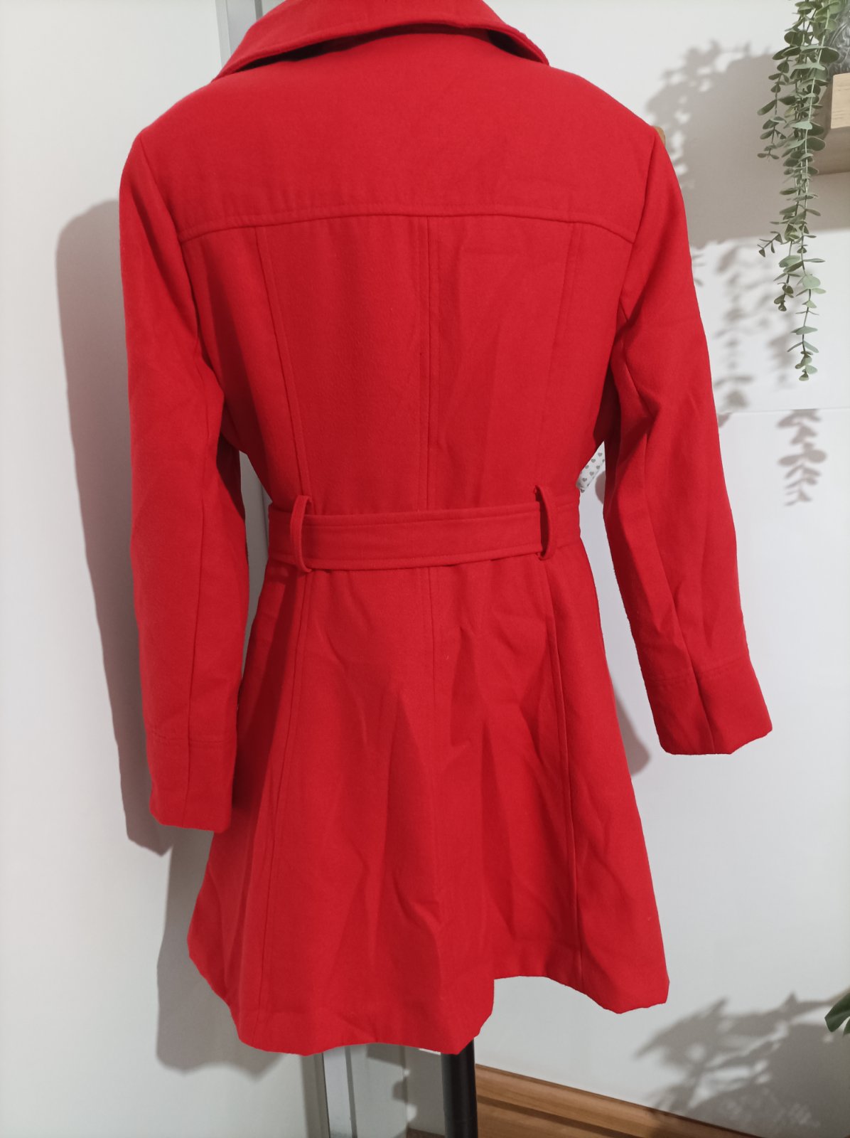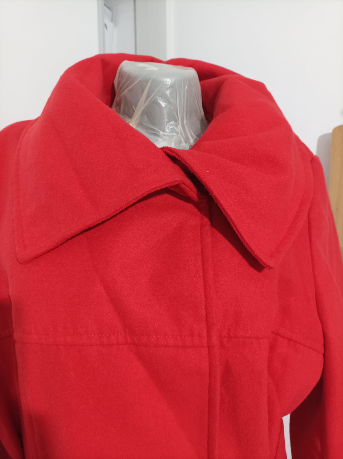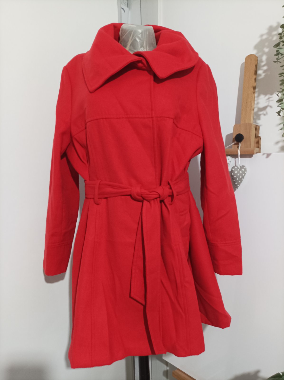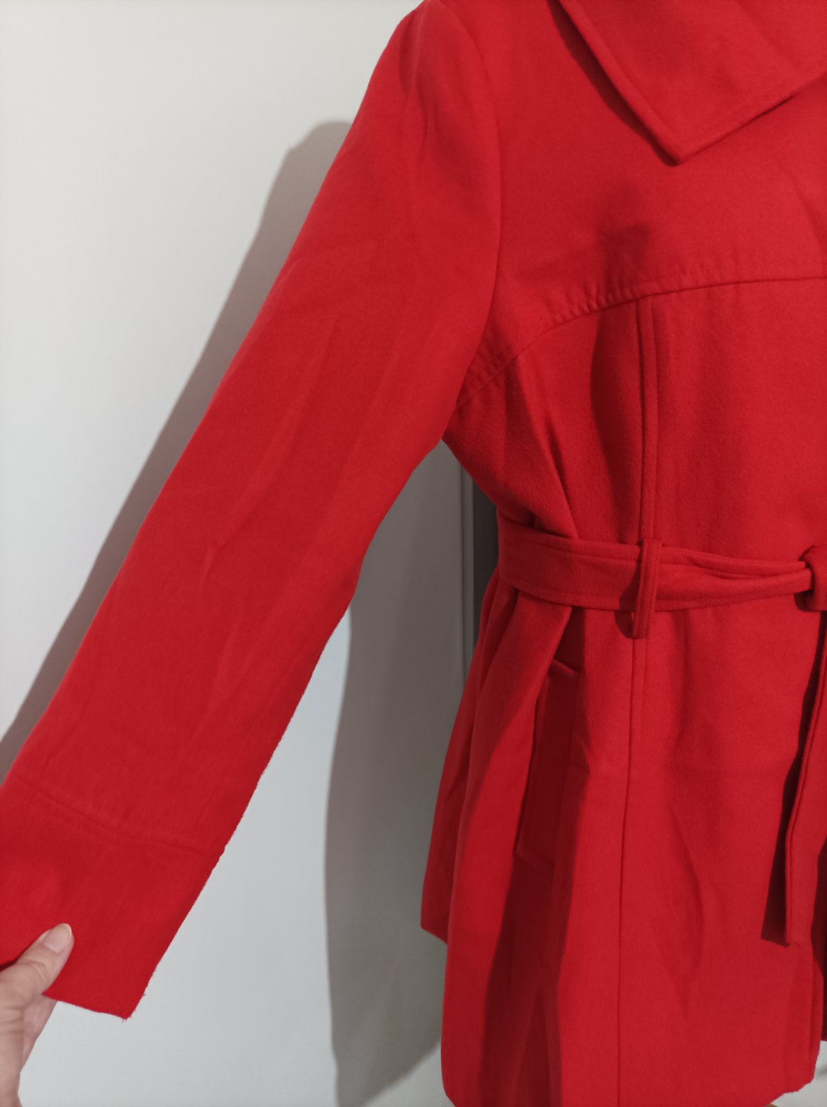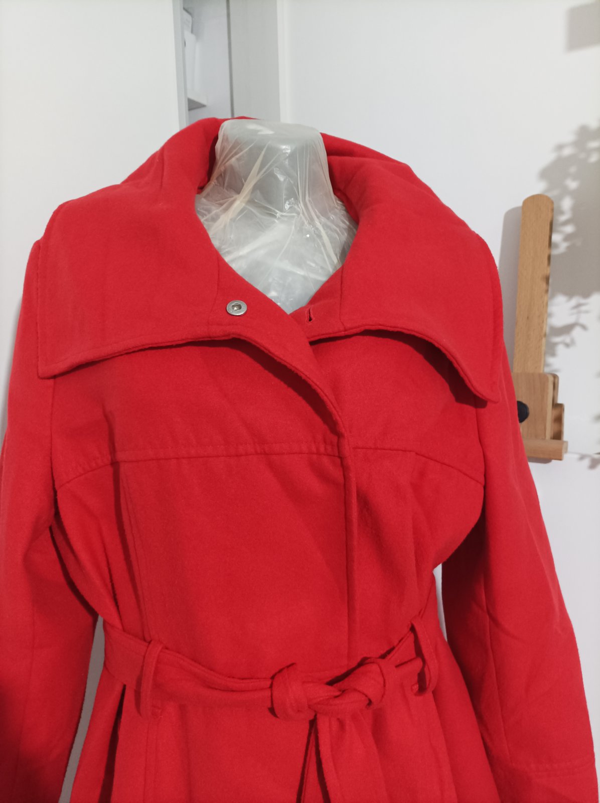 Červený kabát, je taký na jeseň a zimu, je teplý. Zapínanie na cvockove patenty, plus poistný gombík vnútorný. Noseny veľmi striedmo jednu sezonu s viacerými kabatmi, stav je veľmi dobrý. Po sezóne bol v čistiarni ale musela som ho z dovodu priestoroveho obmedzenia uskladniť vo vakuovom vreci a je pokrceny. Stačí ho napariť obyc žehličkou a nechať voľne vyschnúť ( tak som to robila aj ja ) . Veľkosť je udana 48 a presne tak ak sedí, nieje strecovy ale pevný , klasický kabatovy akoby fleecovy materiál takže ten nepovolí. Strih je úžasný, do Áčka , čiže pekne tvaruje postavu. Bez fľakov, zatrhnuti a podobne.