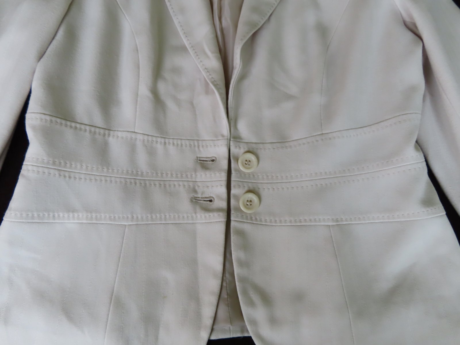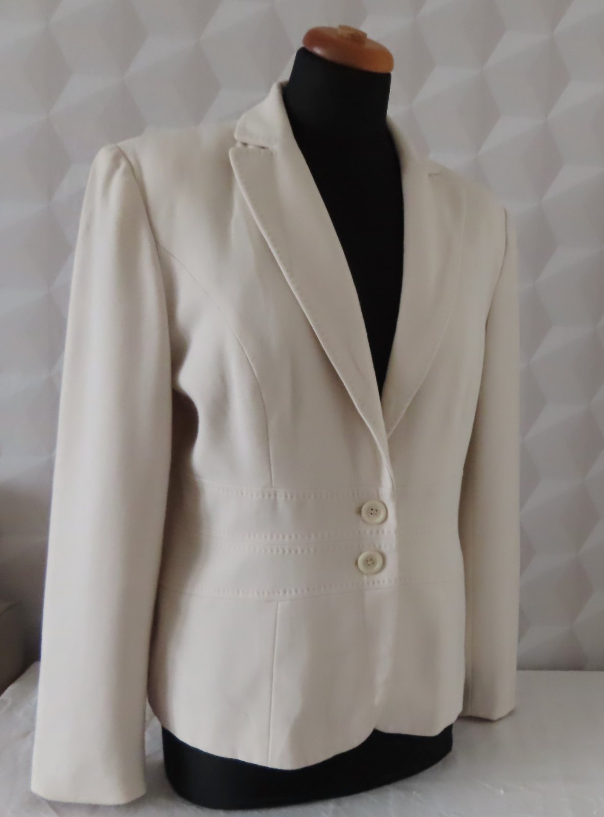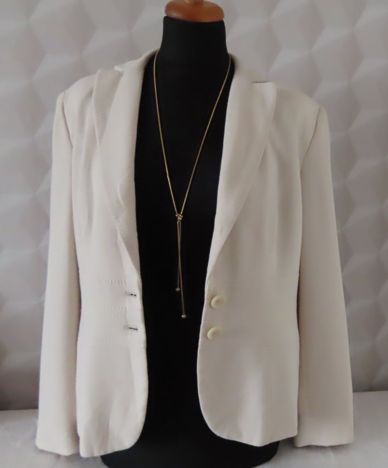 Dámske elegantné sako zn. Jurgen Michaelsen, veľ. L - rozmery: dĺžka 60cm, pod pazuchami 2x53cm, rukáv 62/43cm. Farba je úplne svetlučko krémová - skoro biela.