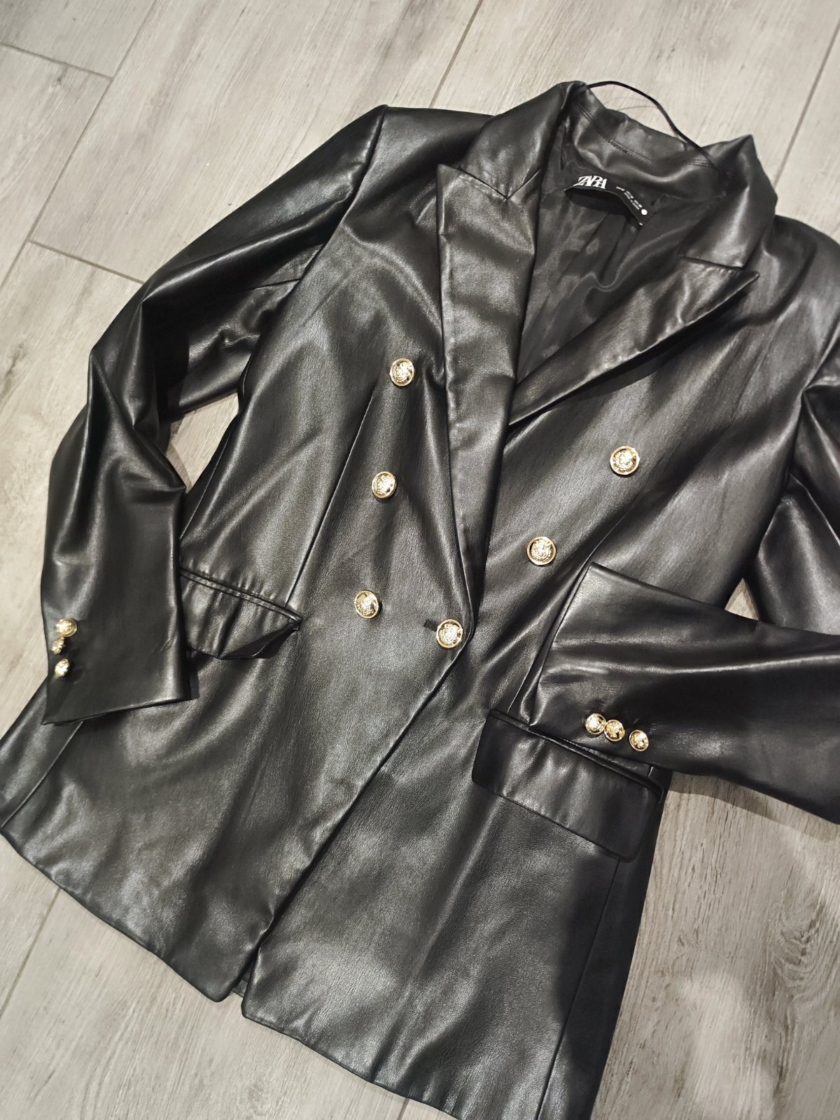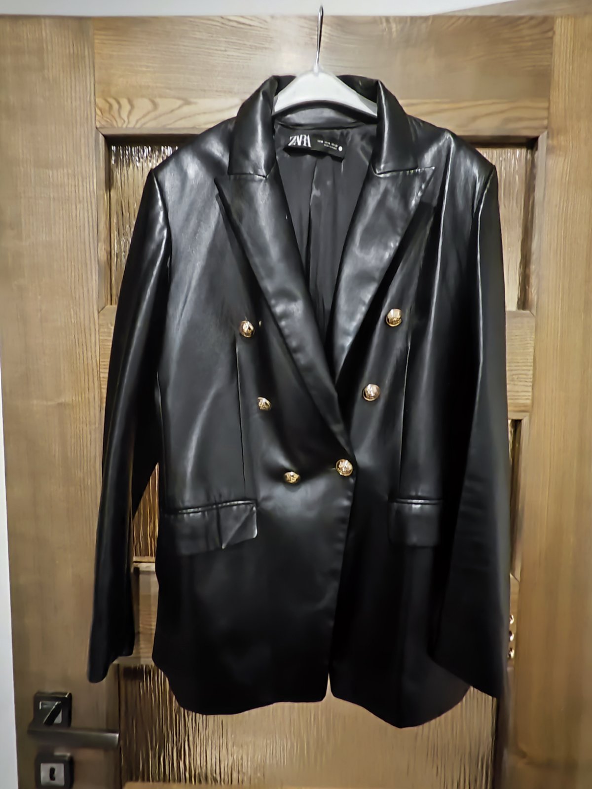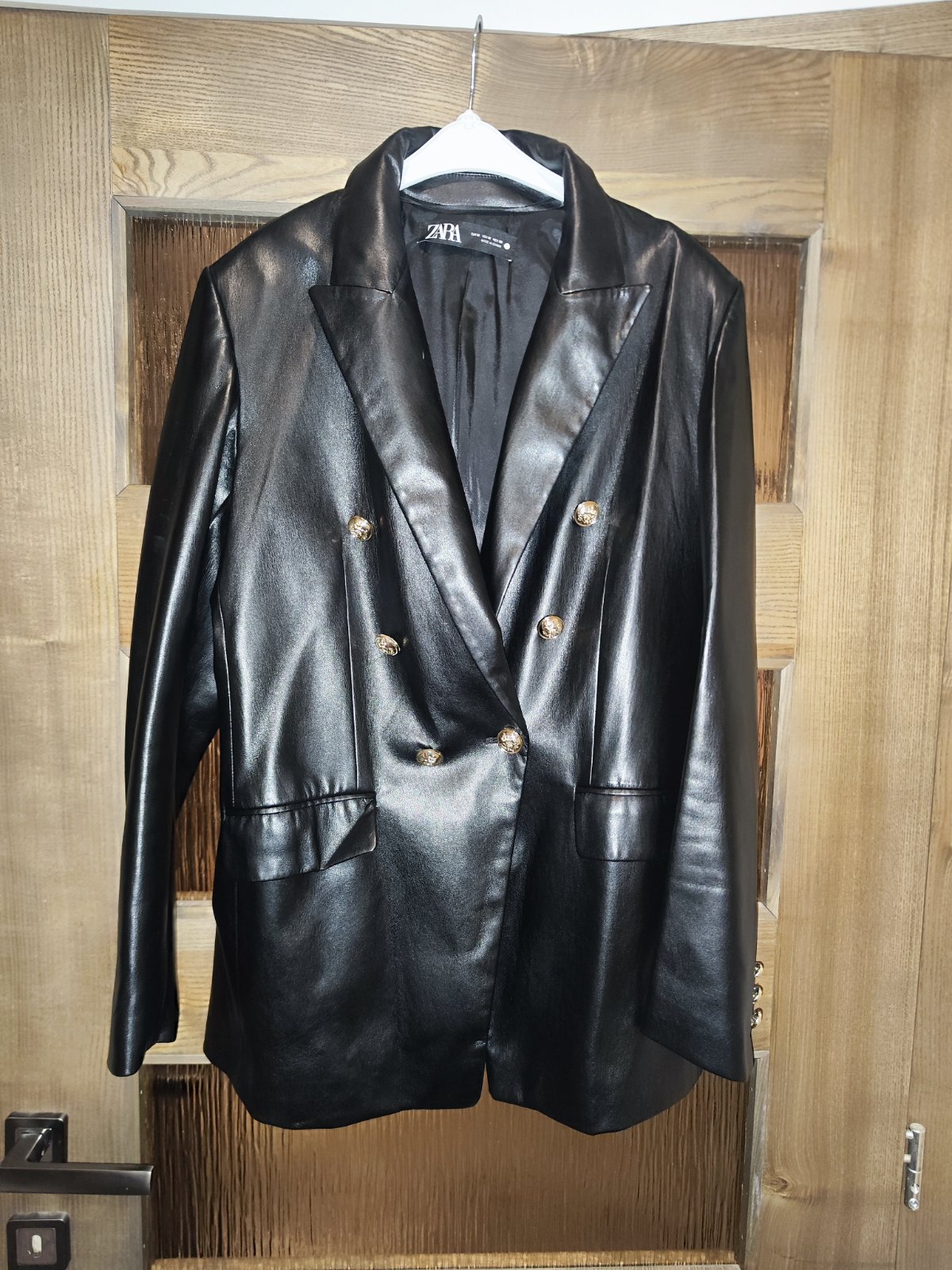 Nádherné koženkové Sako Zara. Veľkosť M. Sedí jemne oversize. Oblečie ho aj L. Strih nie je rovný skôr kopíruje postavu. Zlaté gombíky. Jemne predĺžené k bokom. Bez poškodeni. Noseny stav