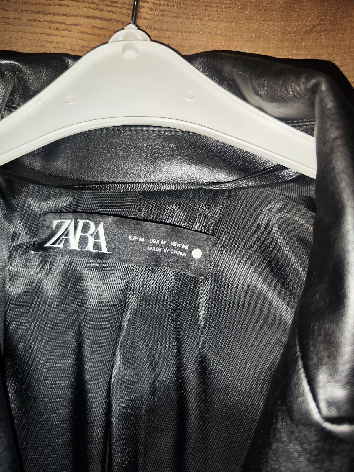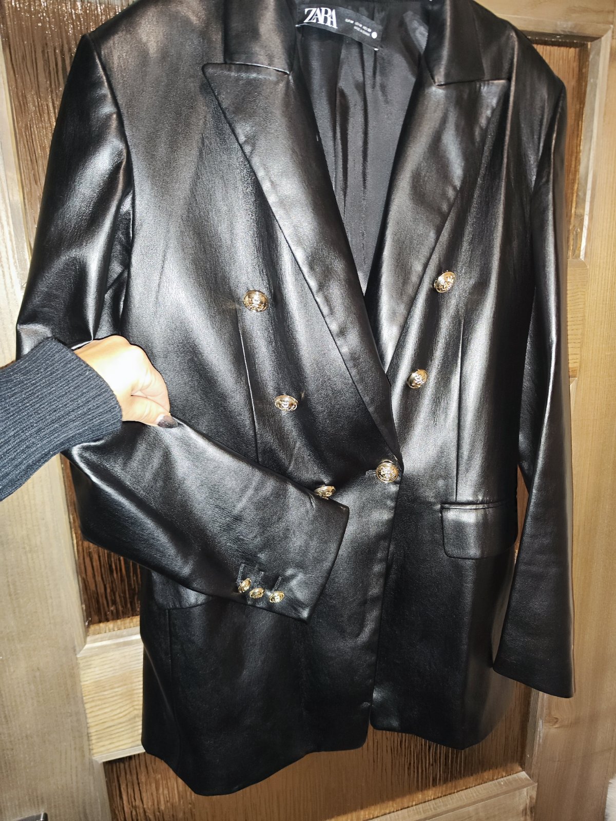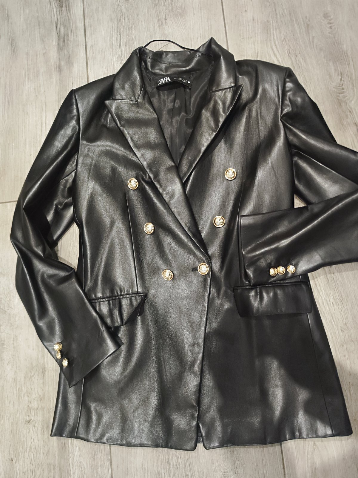 Nádherné koženkové Sako Zara. Veľkosť M. Sedí jemne oversize. Oblečie ho aj L. Strih nie je rovný skôr kopíruje postavu. Zlaté gombíky. Jemne predĺžené k bokom. Bez poškodeni. Noseny stav