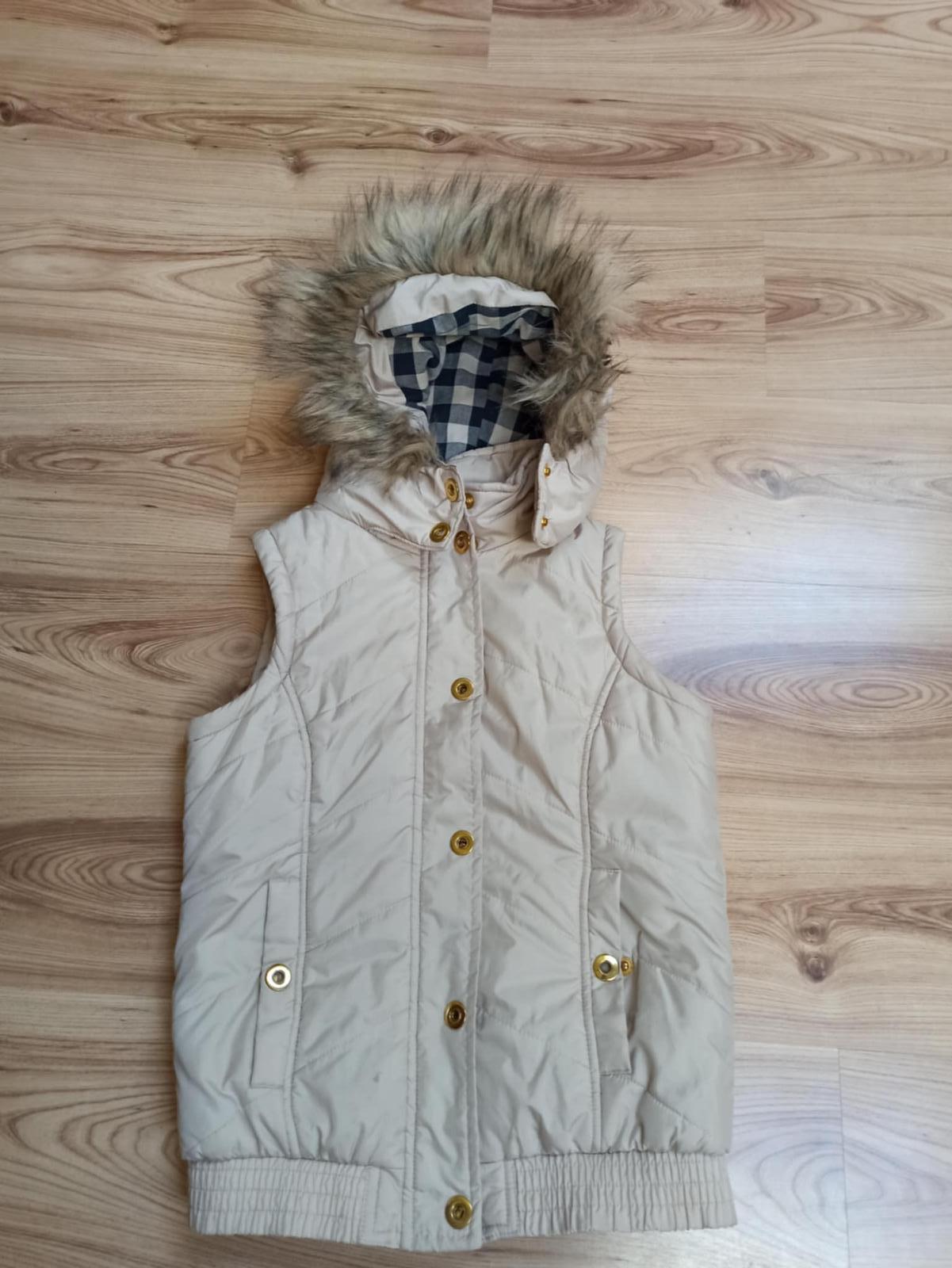 Predám vestu Kenvelo, veľkosť je písaná M, ale skôr je to S (dĺžka 53 cm, šírka cez prsia 94 cm). Umelá kožušina na golieri sa dá odopnúť. Cena 8 € + poštovné