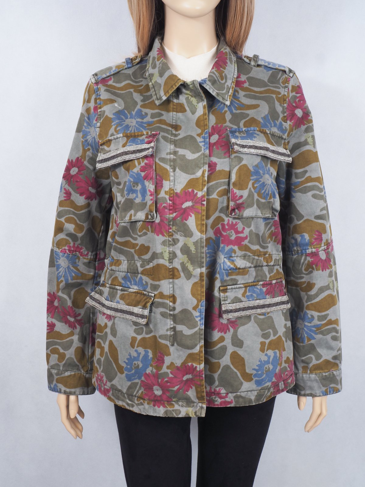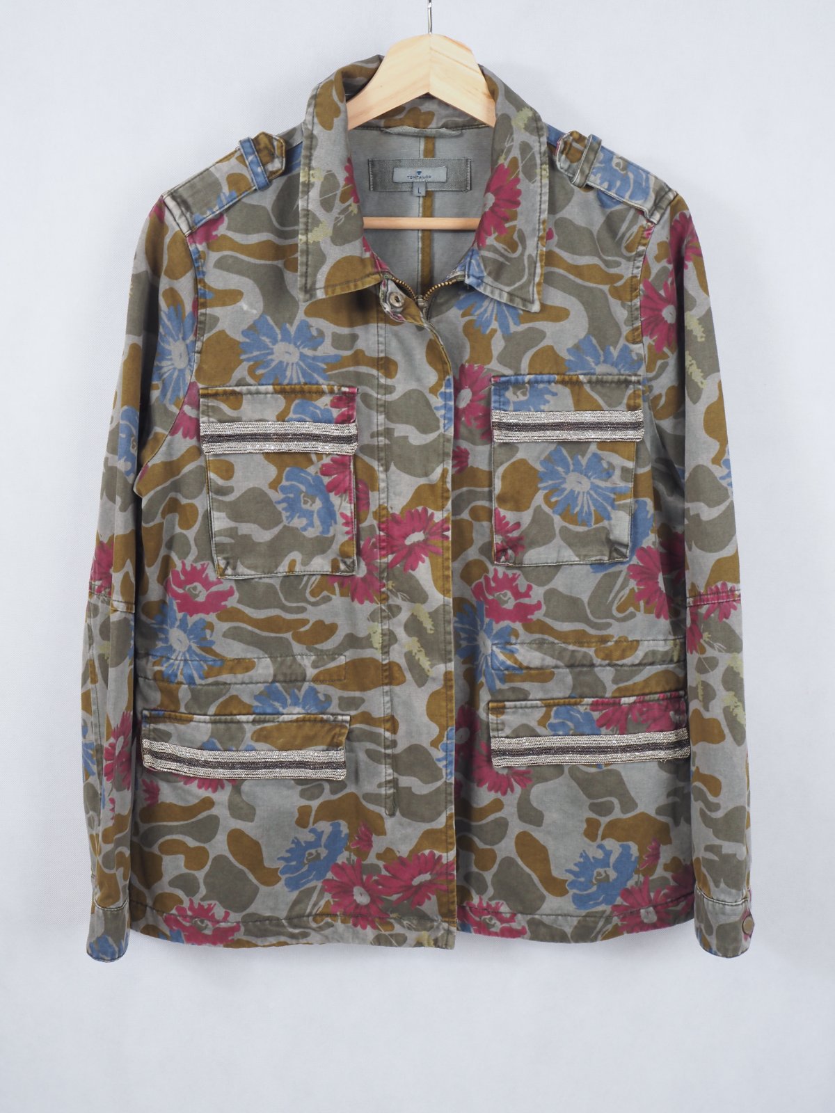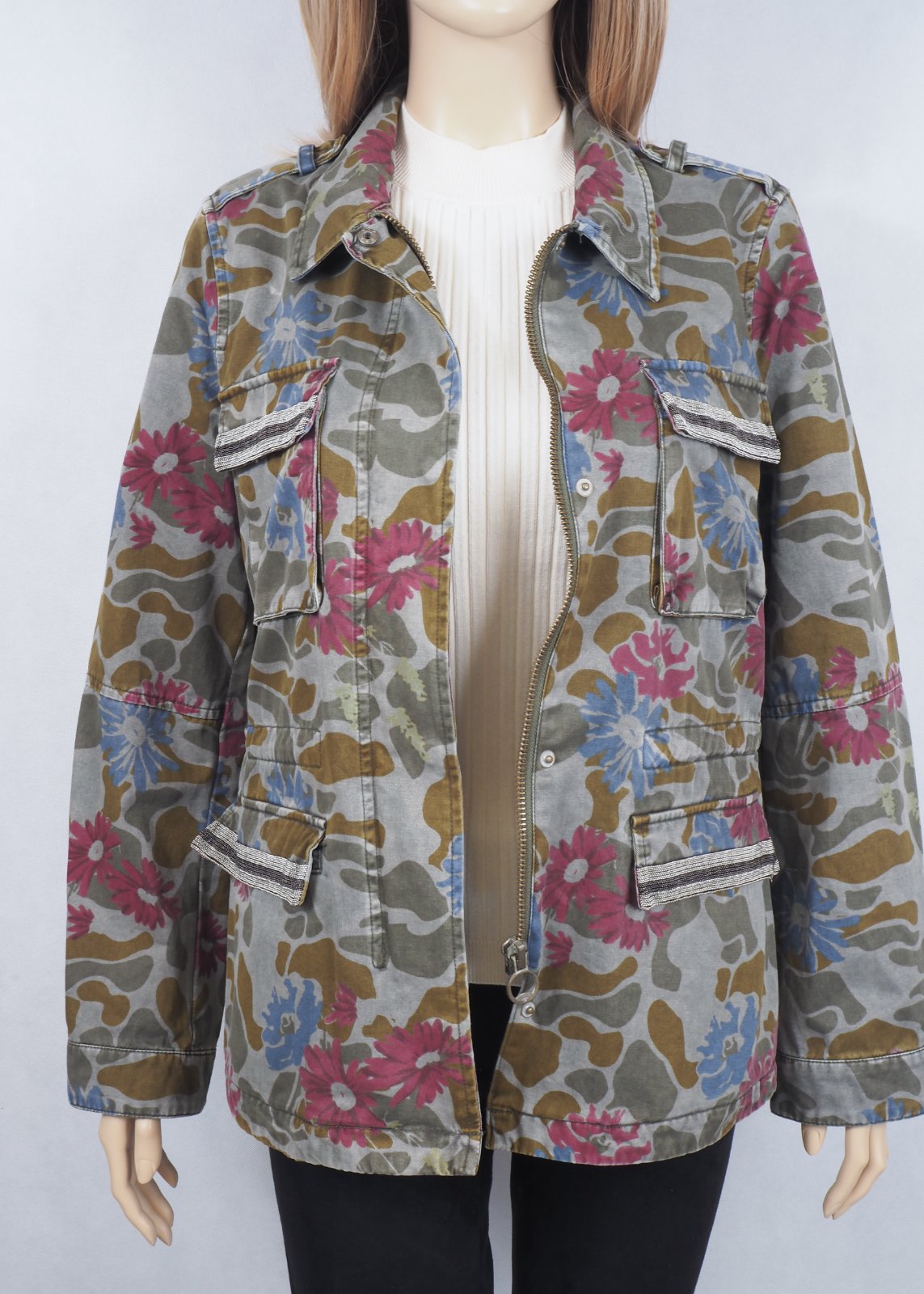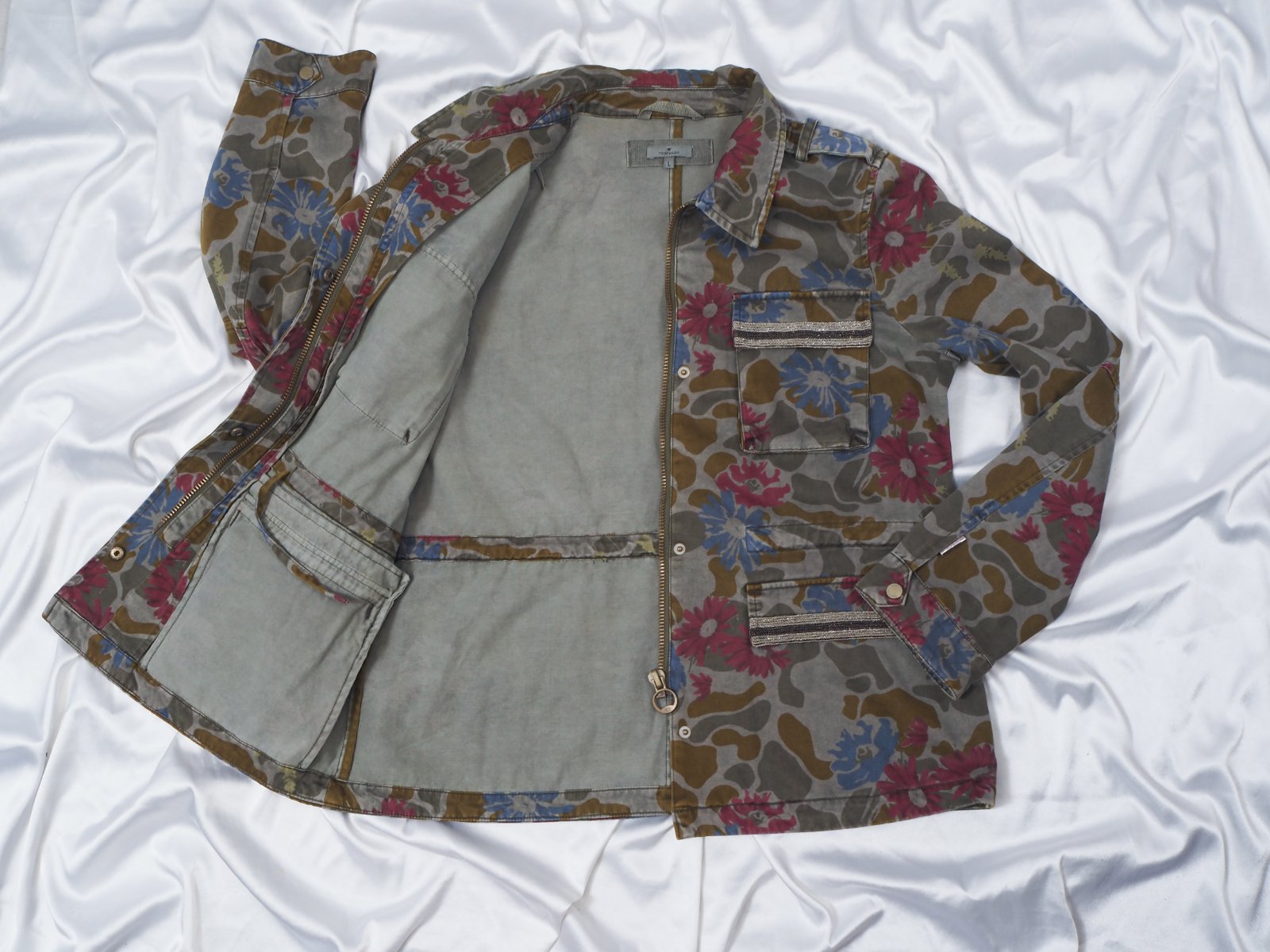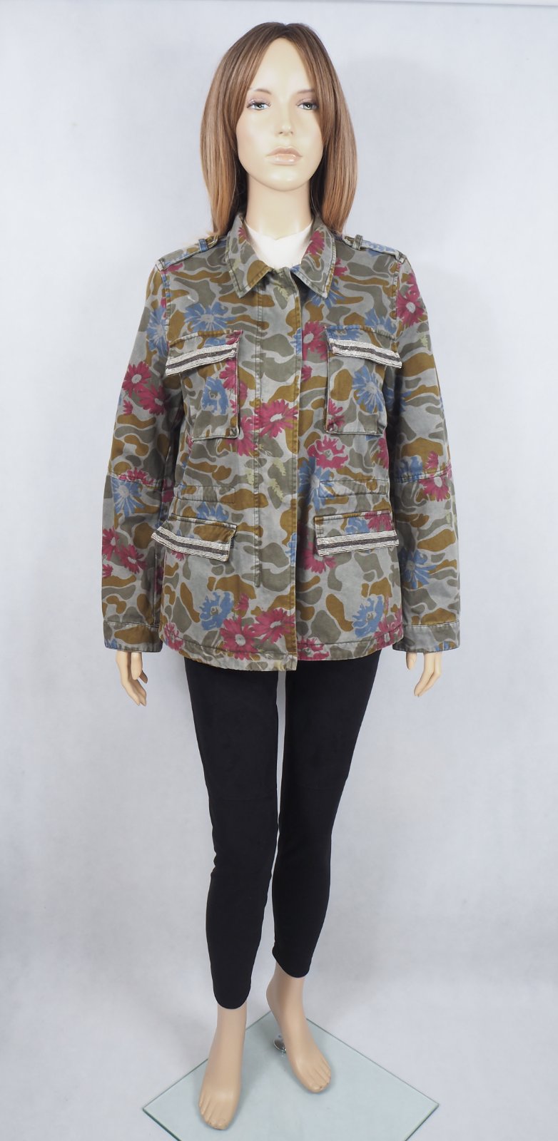 Kvalitná prechodná bunda khaki farby, army vzor, zdobené vrecká, v páse šnúrka na reguláciu z vnútornej stany, materiál 100% bavlna, bez podšívky, super stav.