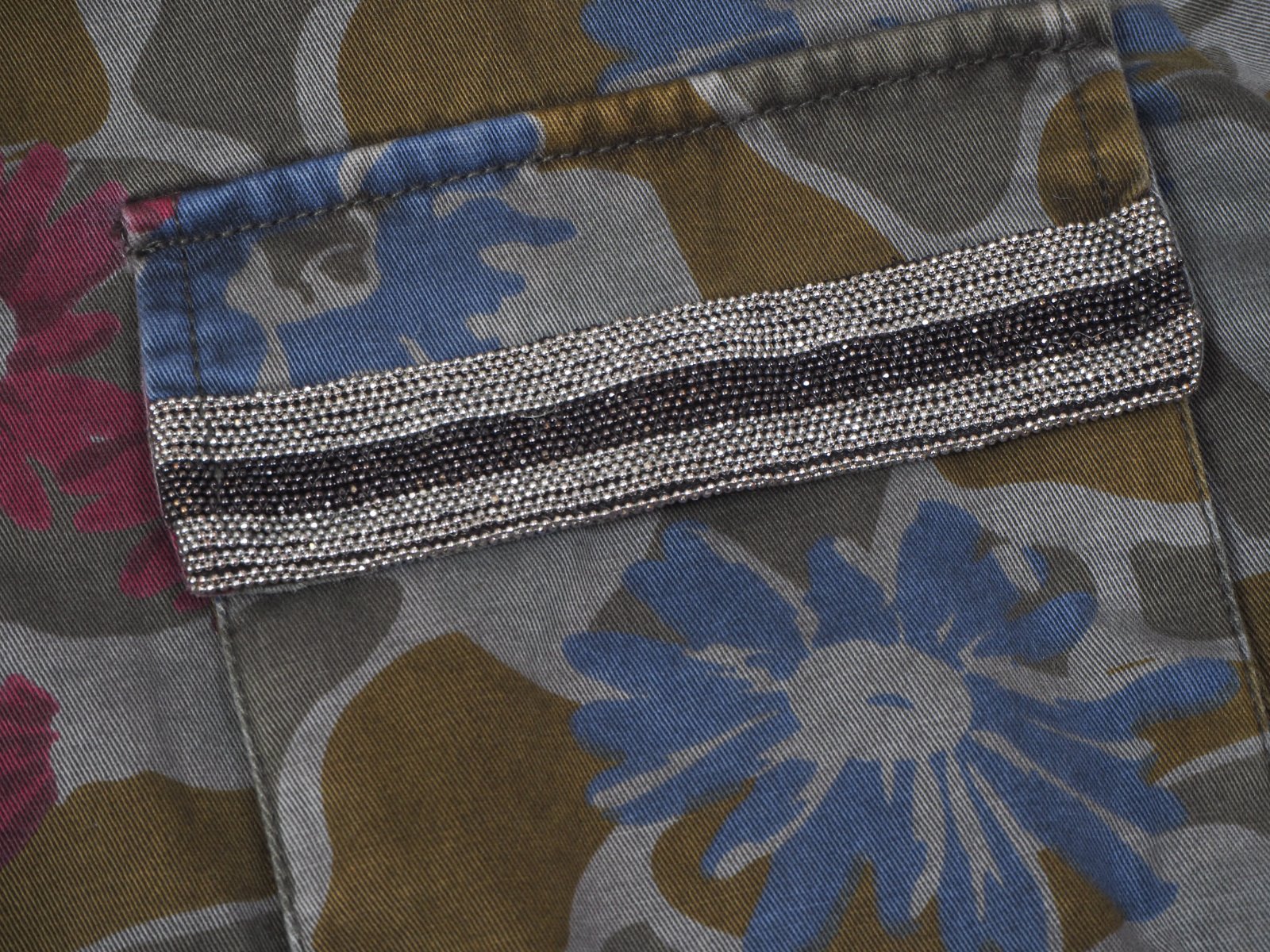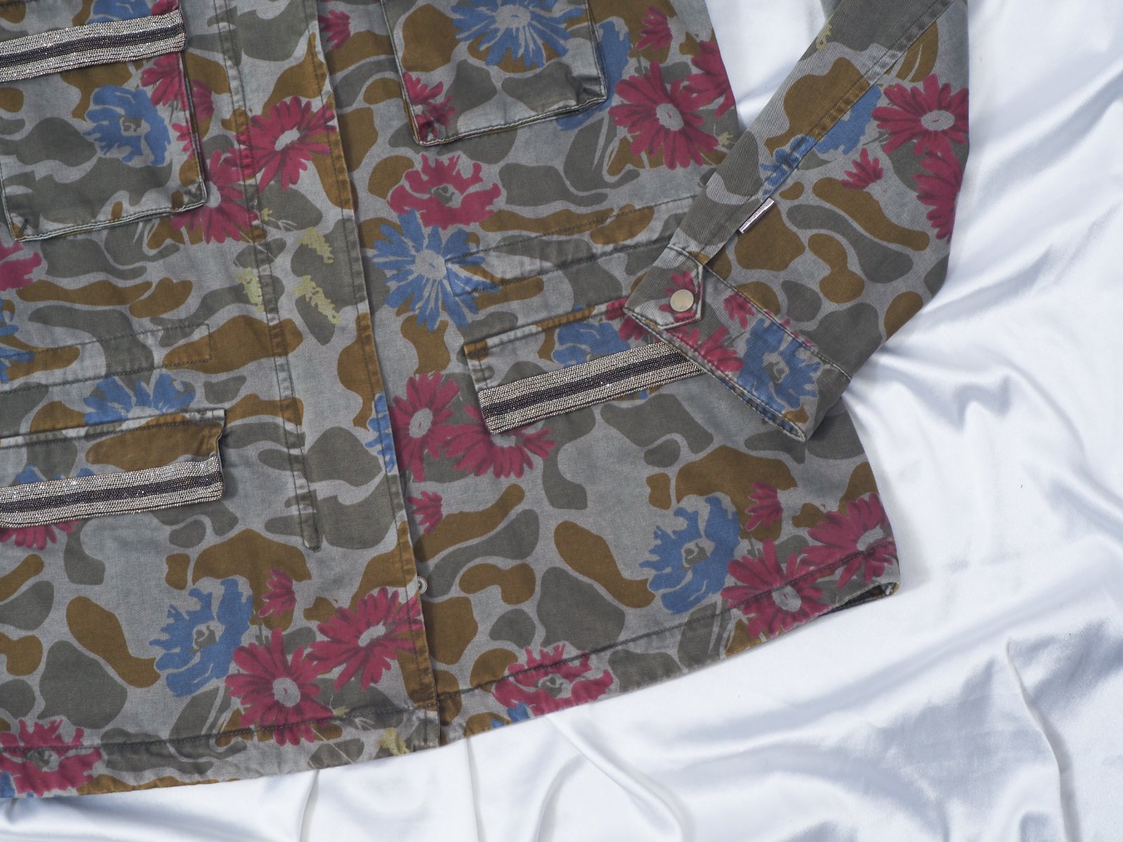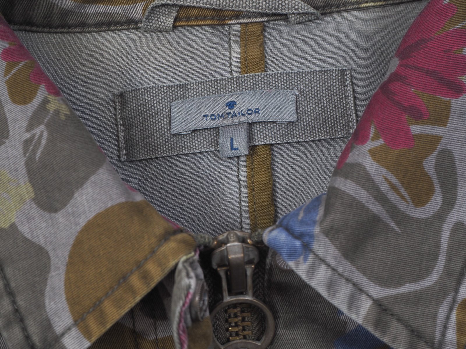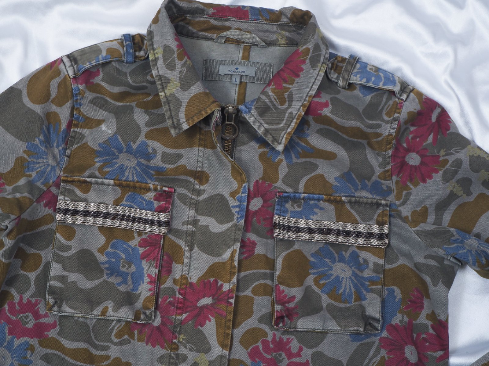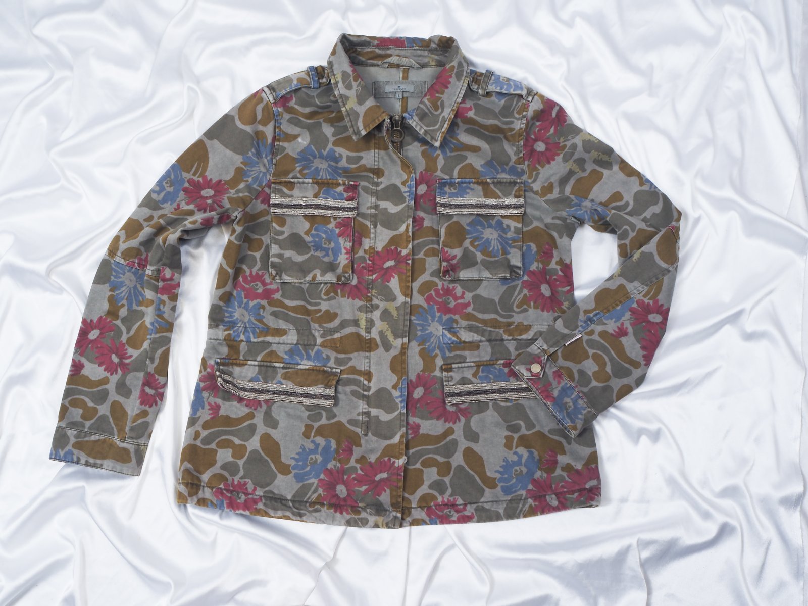 Kvalitná prechodná bunda khaki farby, army vzor, zdobené vrecká, v páse šnúrka na reguláciu z vnútornej stany, materiál 100% bavlna, bez podšívky, super stav.