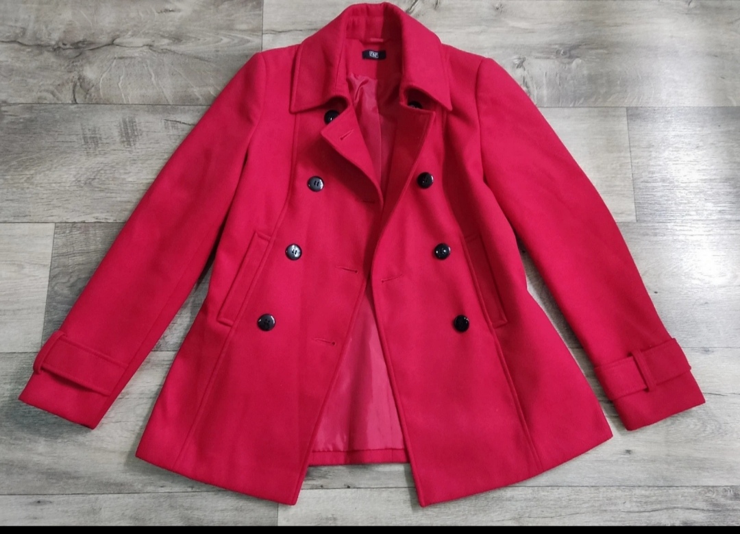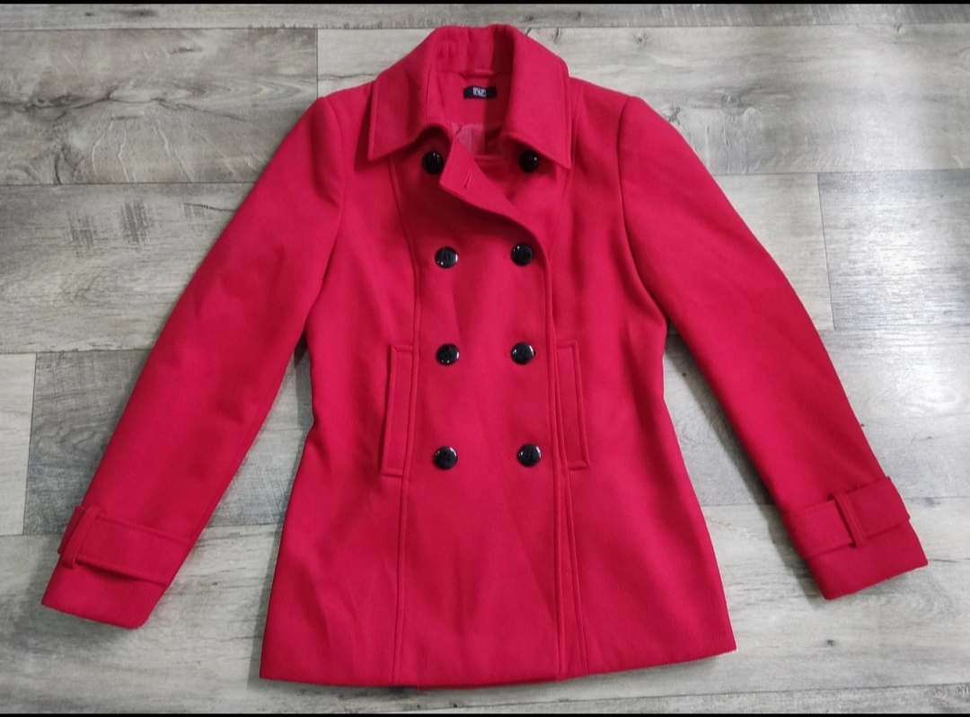 pekný červený kabát, veľkosť uvedená 38, ale odporúčam skôr pre 36 alebo štíhlu 38 rozmery su: sirka pod pazuchami 2x45cm, dlzka rukava od ramenneho sviku 63cm, rukav od krku 75cm, dlzka kabata cez...