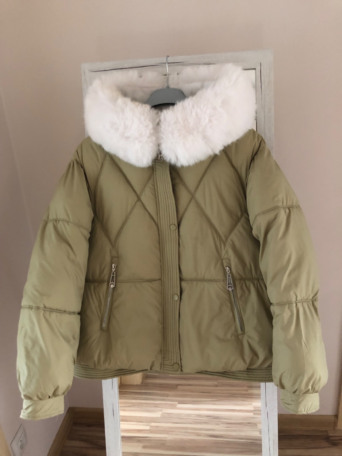 Nenosená nová s vysačkami , veľkosť UNI, olivová farba , s bielou odopinateľnou kožušinou
