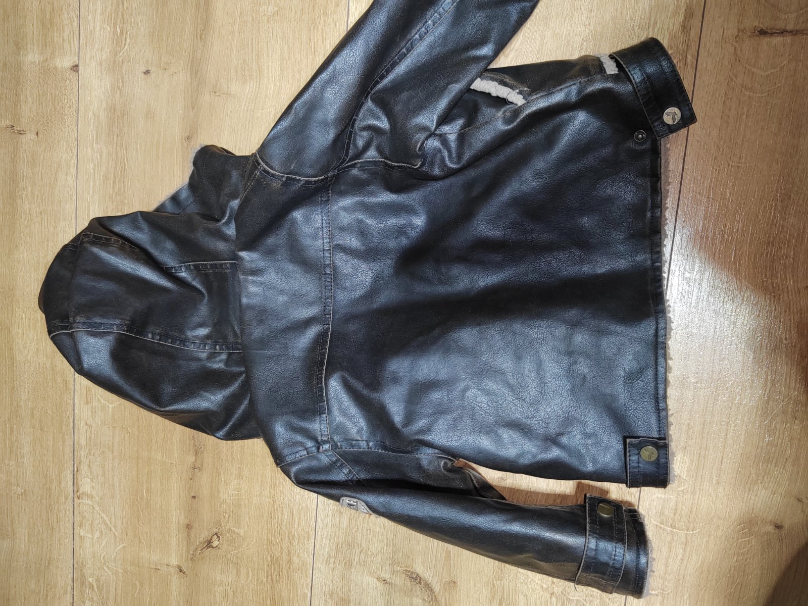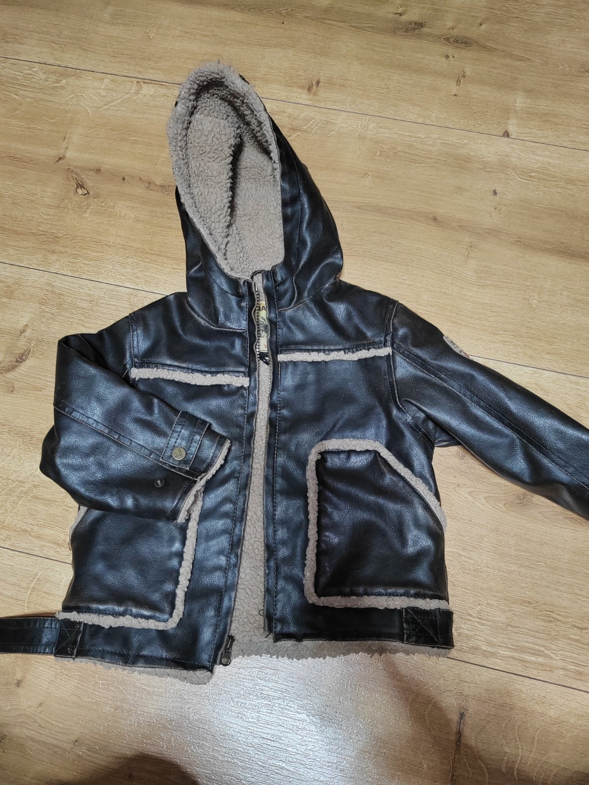 Pekná štýlová kožená bunda pre malého frajera, vo veľmi dobrom stave, farba tmavo - tmavohnedá, zateplena kozusinkou