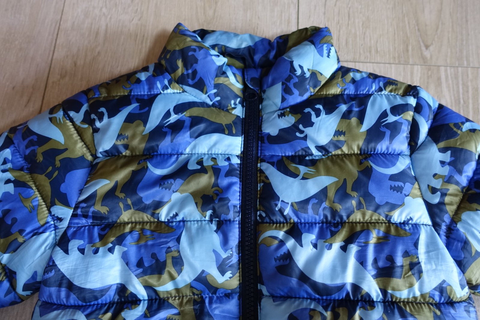 Predám krásnu bundičku s dinosaurami. Je ideálna na prechod, alebo miernu zimu. Sú na nej svetlo modré, tmavo modré a zlaté dinosaury. Je síce veľkosť 98, ale určite sedí na veľkosť 92. Riaďte sa prosím rozmermi. Bola použitá iba 1x, ale je top stav. Nemá žiadne poškodenia. Zips je plne funkčný. Vpredu má 2 vrecká. Dĺžka 41 cm, šírka 34 cm. Dĺžka rukáviku od krku je 42 cm a od pliecka 35 cm. Predávam aj o číslo väčšiu, viď môj bazárik. (V06)