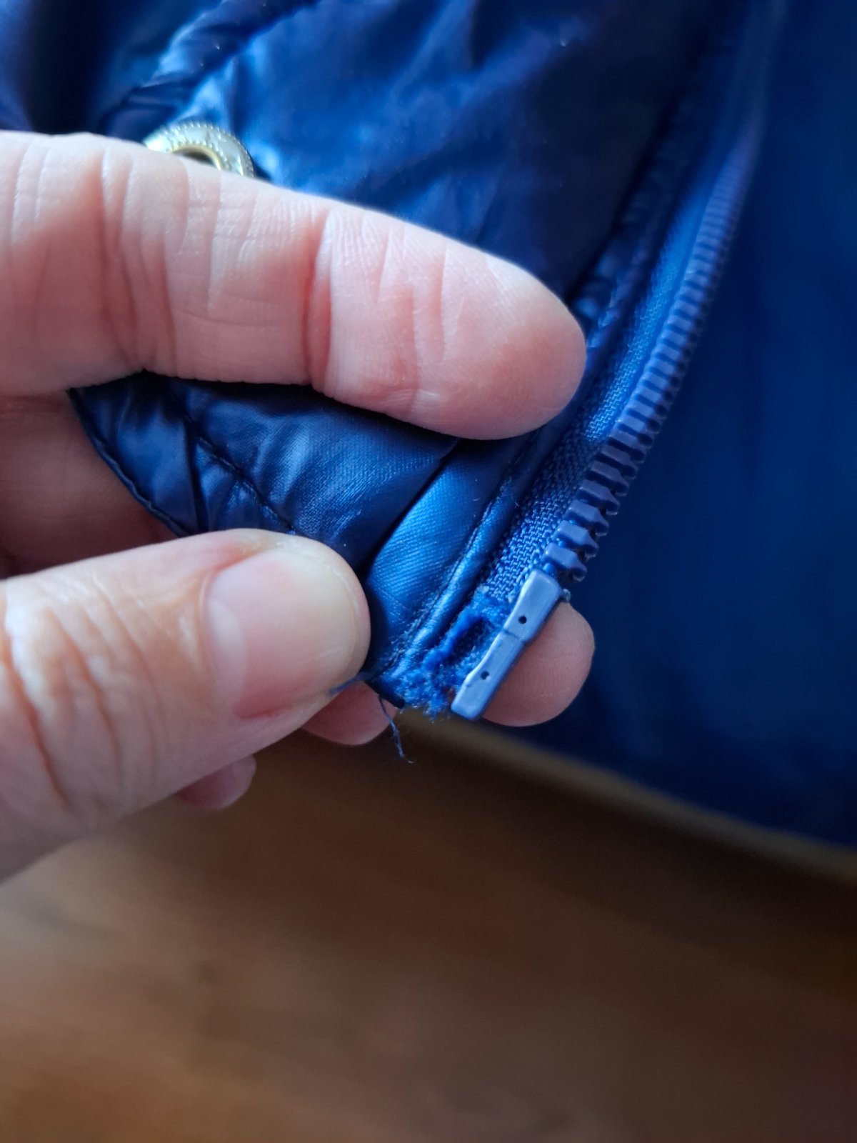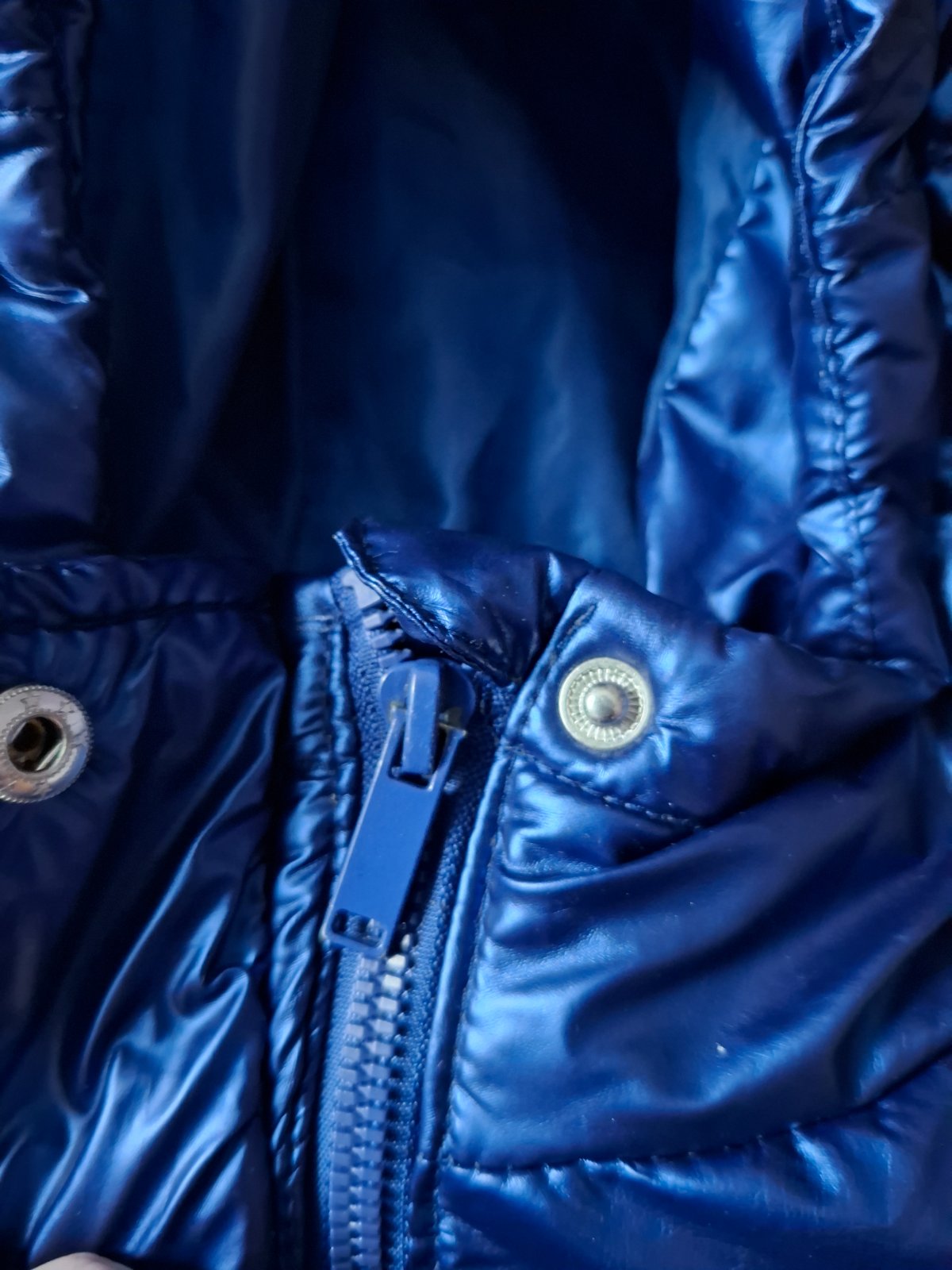 Bunda je v peknom nosenom stave, trošku ošuchaná farba na bežci, zips funguje ako má. Na spodku zipsu na jednej strane je rozstrapkana látka na kúsocku, nie je to natrhnuté, tak sme už kúpili - nafotené. Na manžetách rukávov sa robia už trochu minižmolky, iné poškodenia som nenašla.