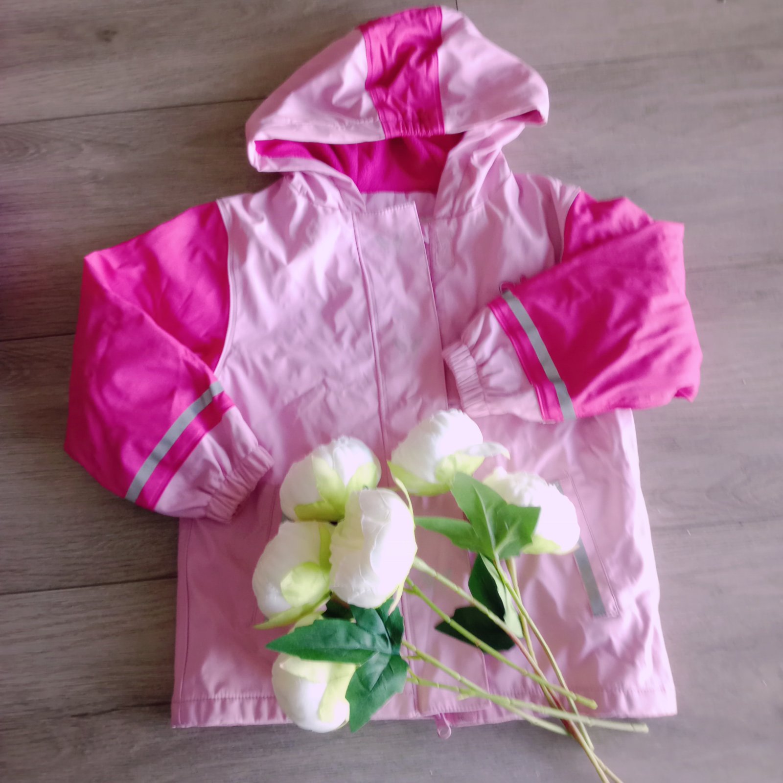 Na 4-6 rokov, vhodná na von ale aj do škôlky..má mini drobné chybičky, ako sú bodky, alebo na kusocku pri rukávoch je trosilinku zosuchana , chybičky sú minimálne viditeľné..vhodná na ďalšie použitie