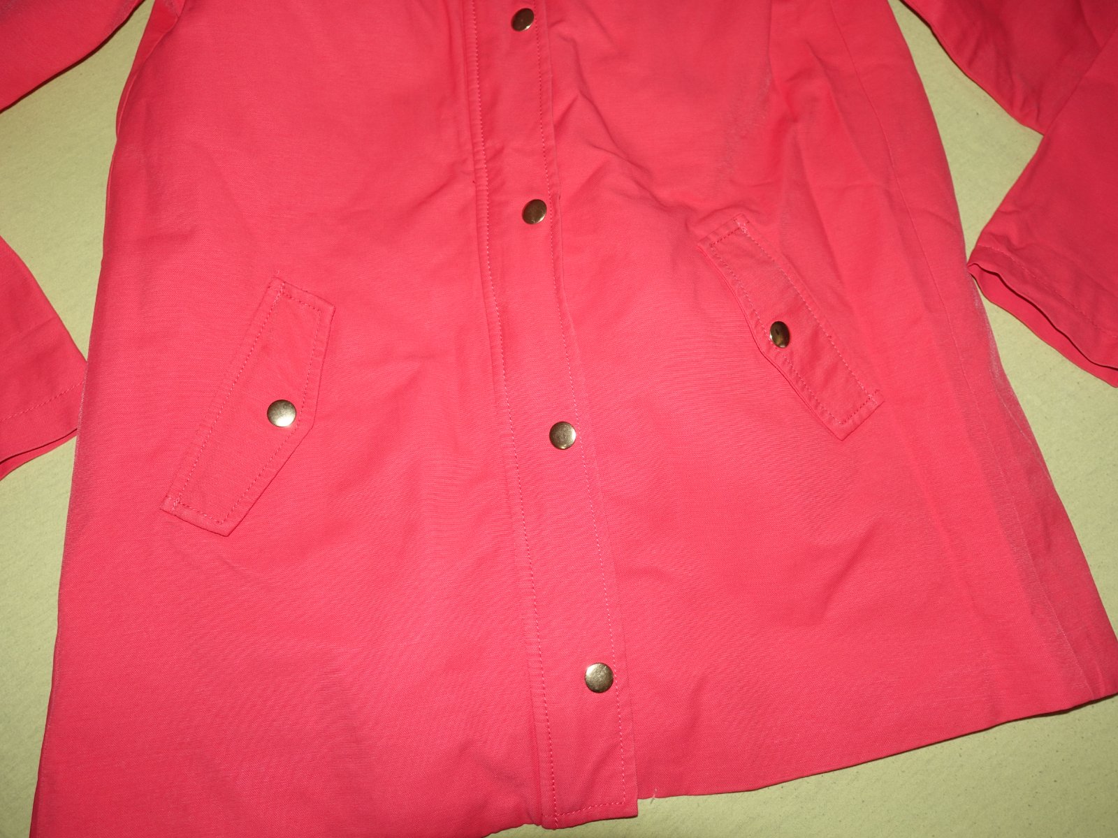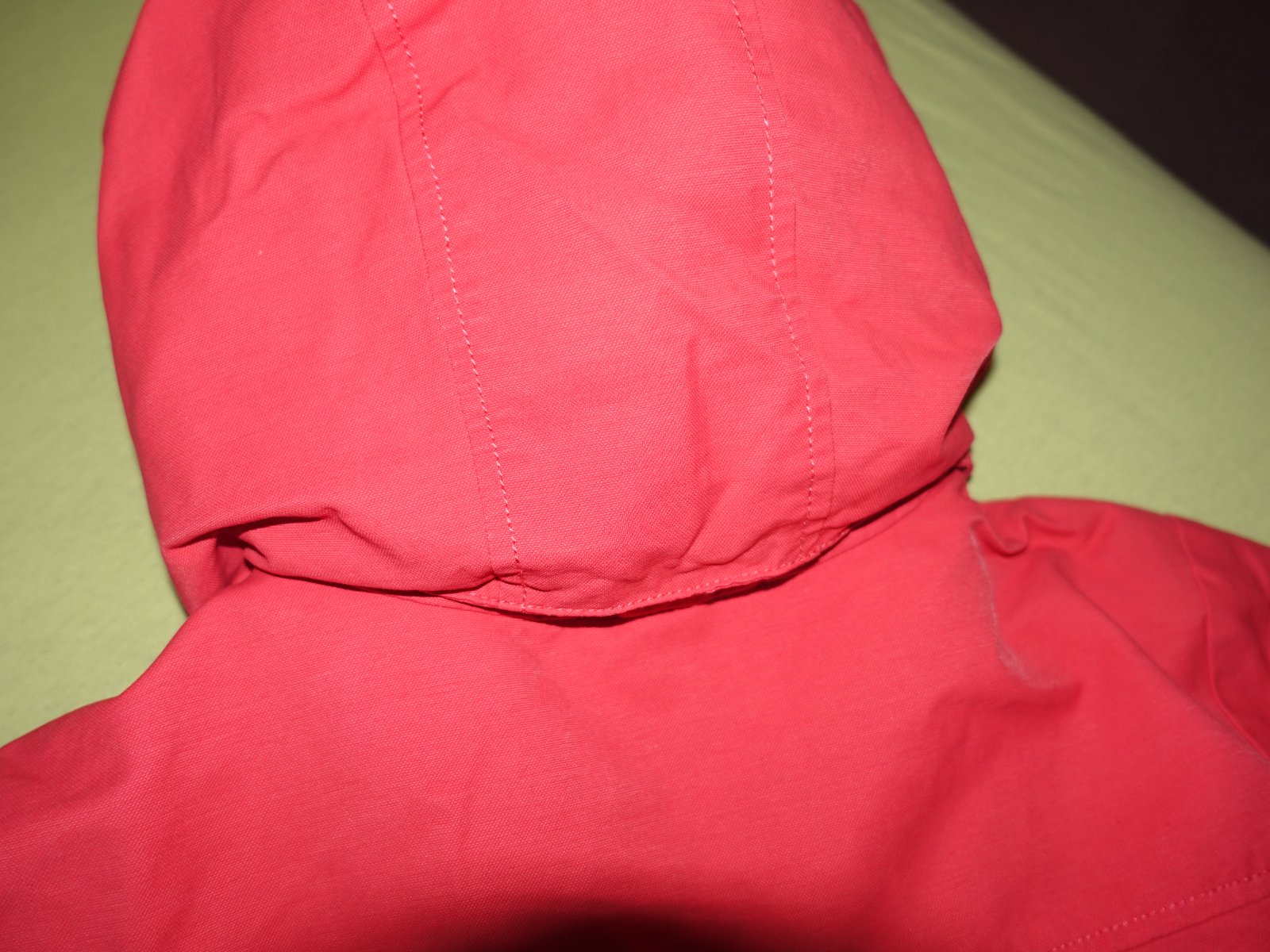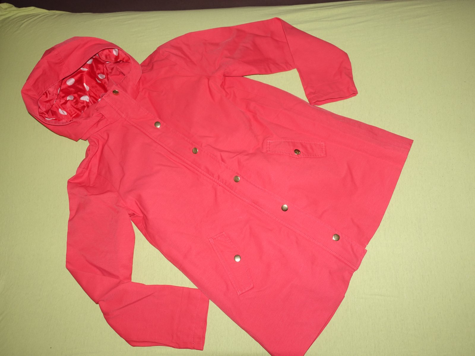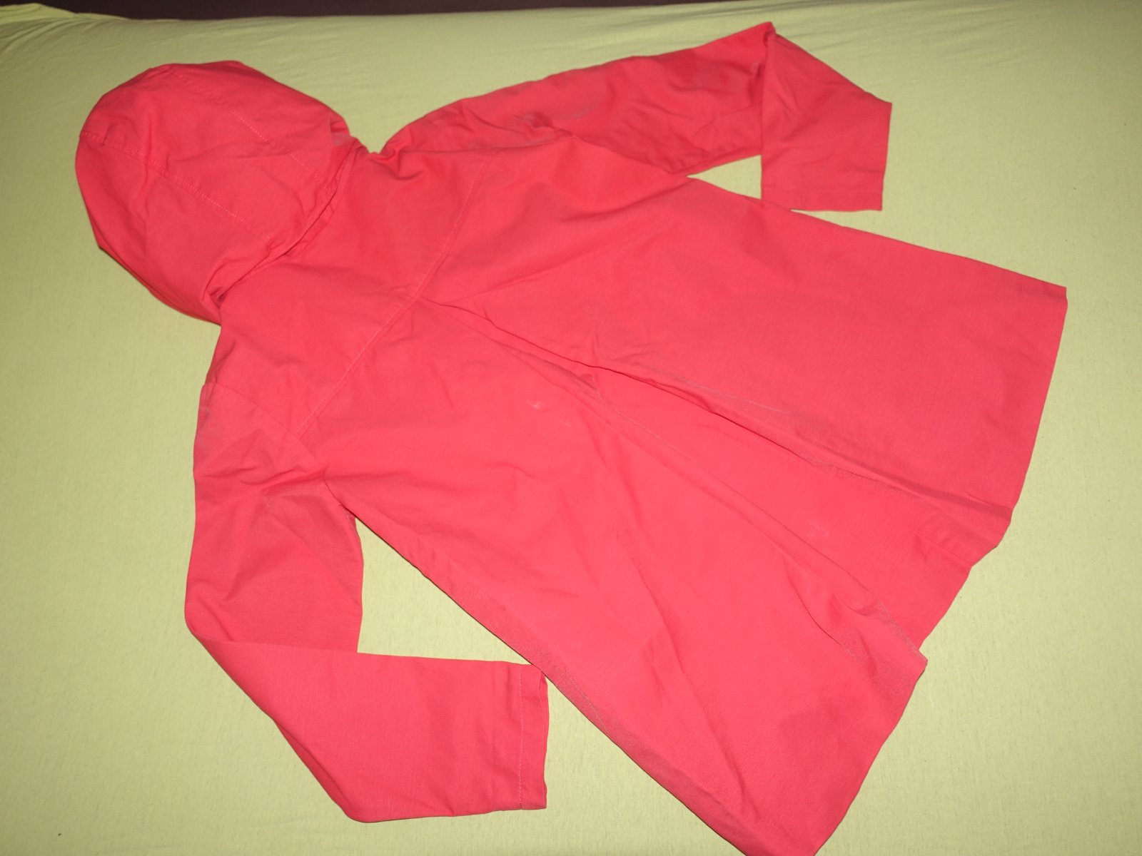 Pekna bundicka vo velmi dobrom stave. Je tenka, len podsita. Kapucna sa da odopnut, ma taku upravu proti premoknutiu. Je takej cervenej farby do ruzova.