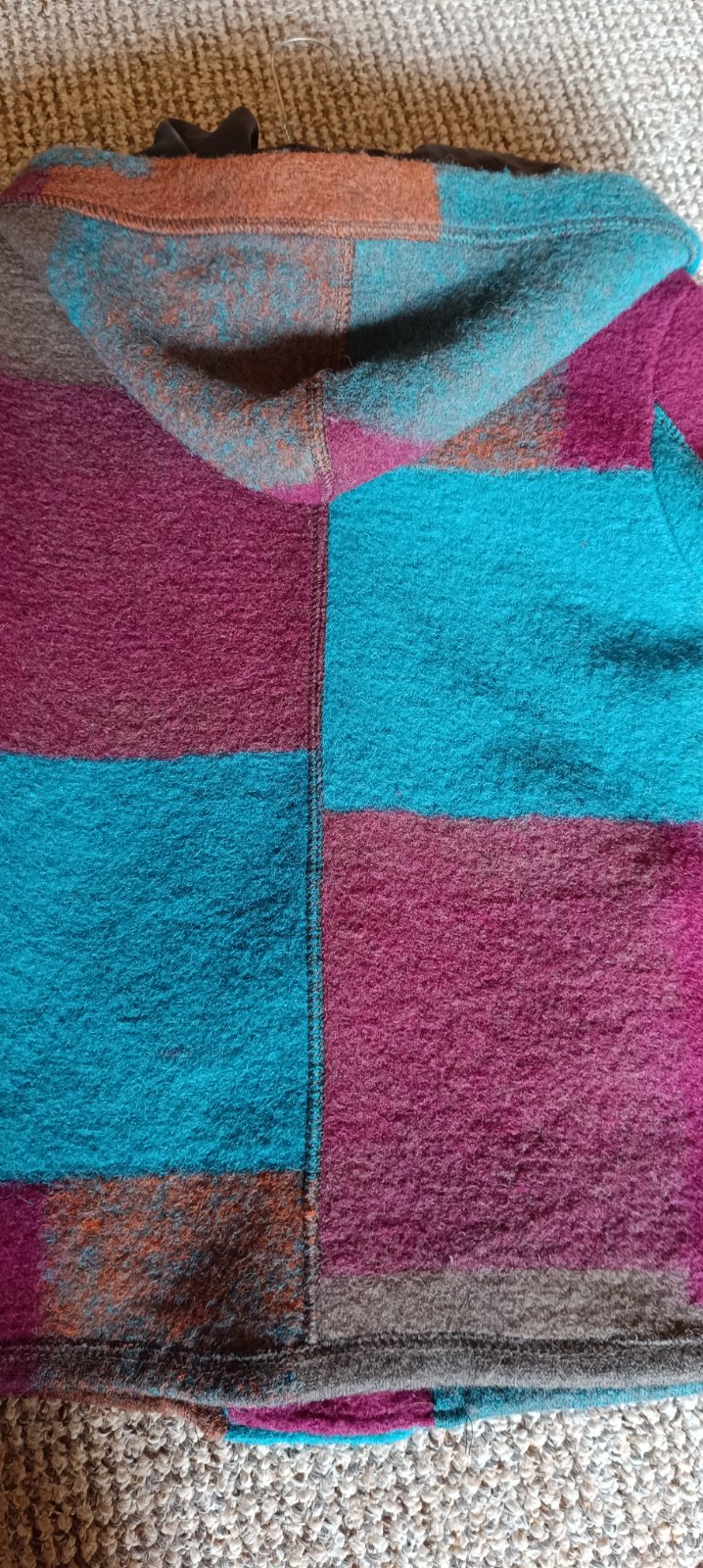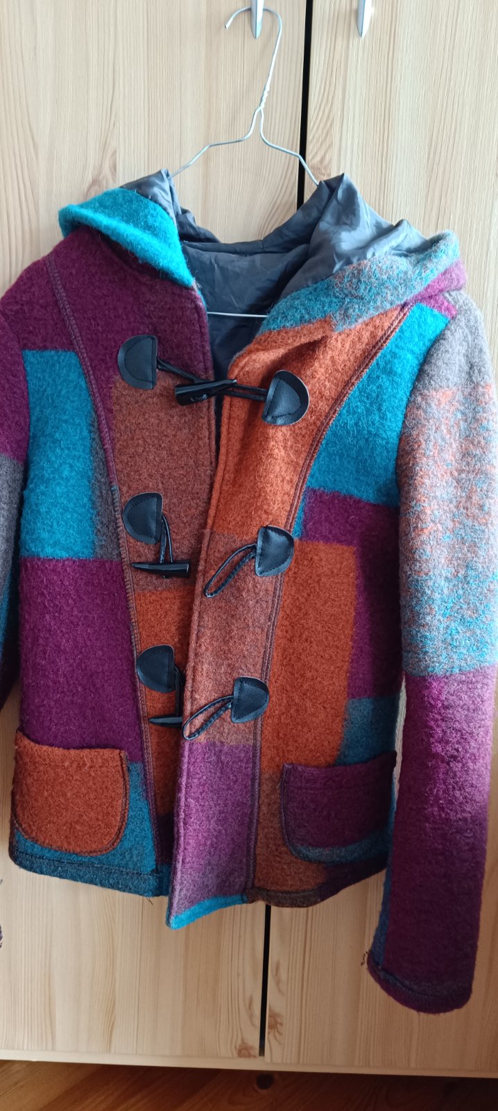 Krásny kabátik sýto červenej farby so zaujímavým zapínaním. Na Rukávoch malé poškodenie spôsobené podohnutím.
