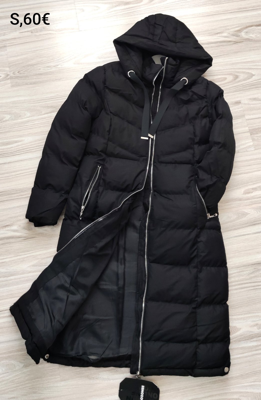 Čierna dámska bunda vo veľkosti S, cena 60€. Miery: prsia šírka 48, pás šírka 46, boky šírka 53, dĺžka 100, rukáv dĺžka 59.