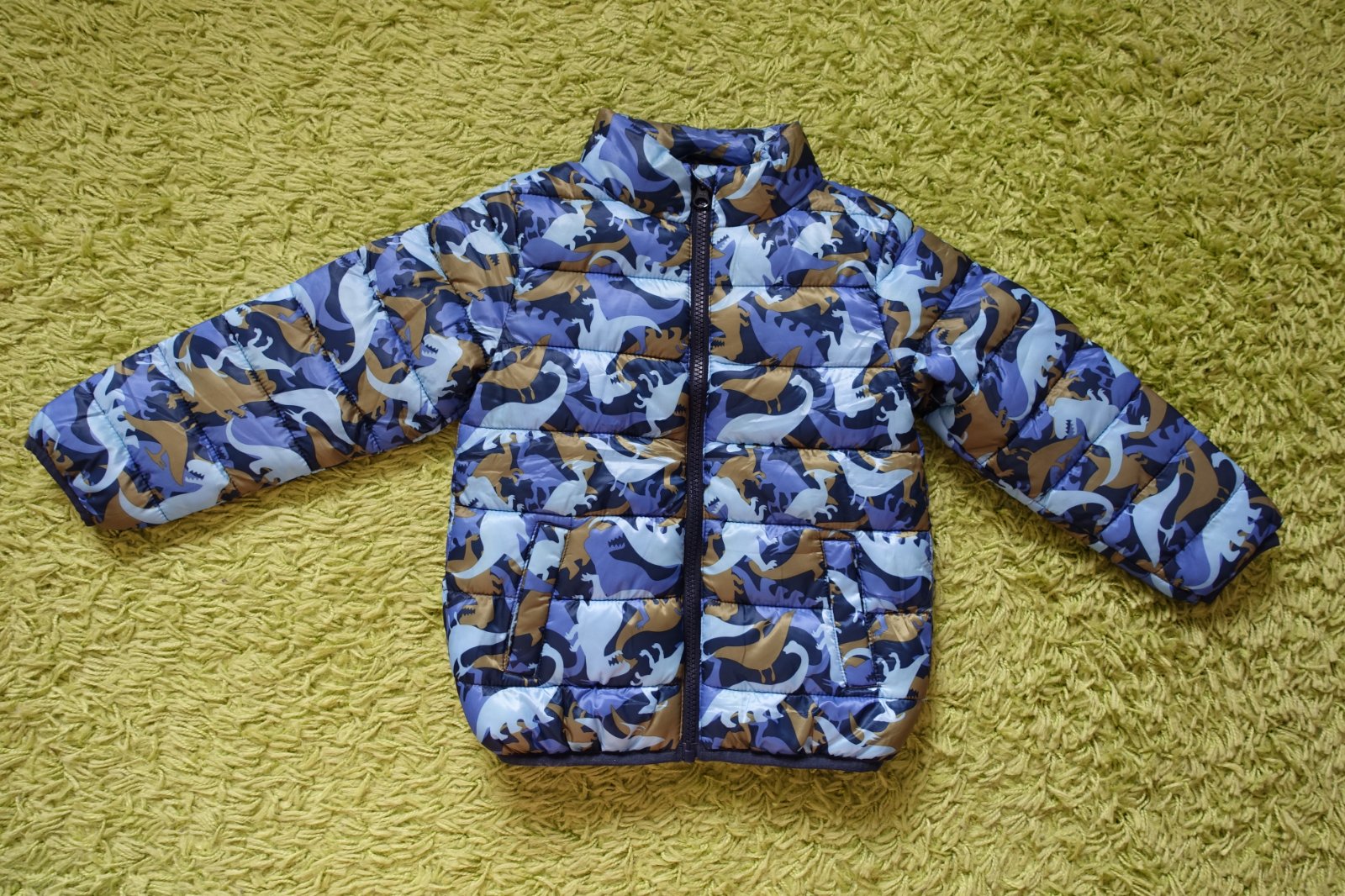 Predám krásnu bundičku s dinosaurami. Je ideálna na prechod, alebo miernu zimu. Sú na nej svetlo modré, tmavo modré a zlaté dinosaury. Je síce veľkosť 104, ale určite sedí na veľkosť 98. Riaďte sa prosím rozmermi. Bola použitá iba 1x, ale je top stav. Nemá žiadne poškodenia. Zips je plne funkčný. Vpredu má 2 vrecká. Dĺžka 44 cm, šírka 35 cm. Dĺžka rukáviku od krku je 43 cm a od pliecka 36 cm.