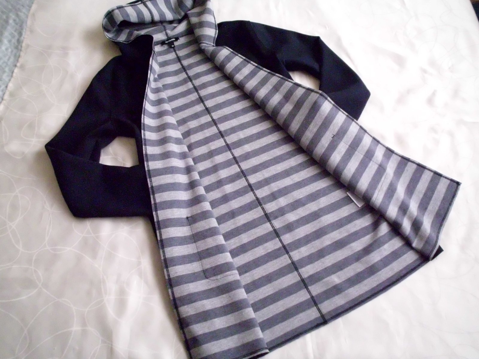 Predám kardigan More&More vel. 38-M , dĺžka 83 cm, šírka 50 cm, rukáv 61 cm od pleca, zloženie na foto , bez zapínania, 2 vrecká, kvalitný príjemný pružný materiál, tmavomodrá farba vnútro pásik, top stav