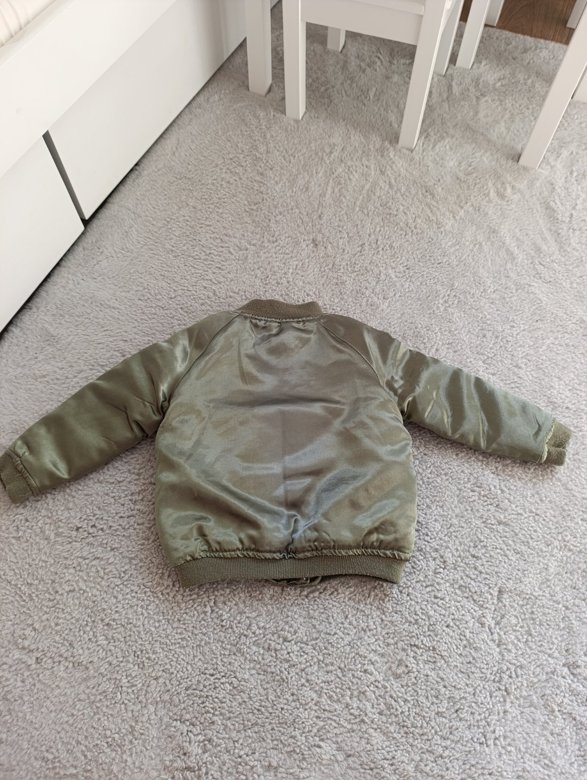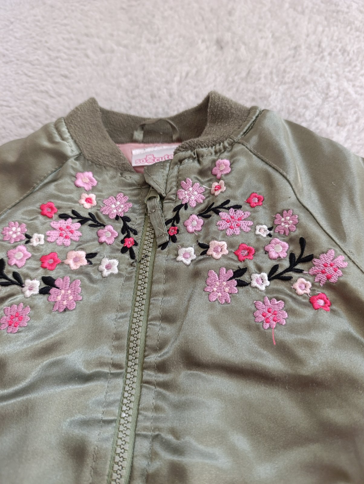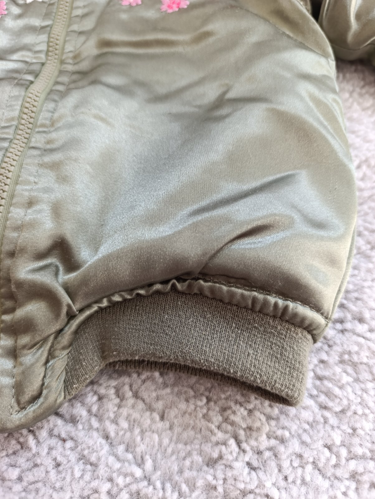 Zelená bunda má pár malinkých zatiahnutí, ktoré ani nevidno. Cena spolu 5€.
