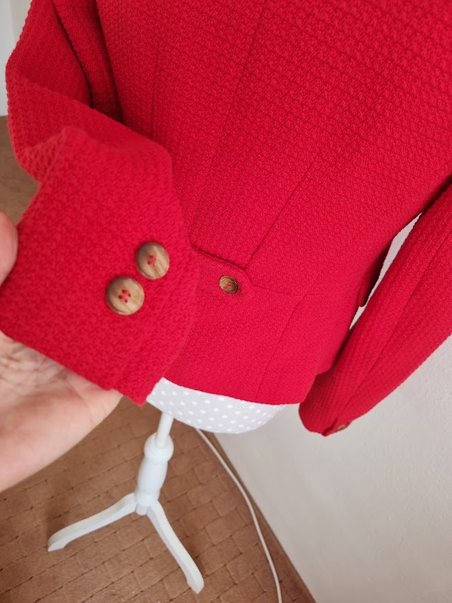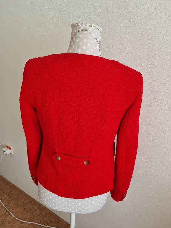 2x oblečené na hodinu....tmavšia červená v skutočnosti, zapína sa na jeden háčik v páse, dlžka 56, prsia 48-50x2, pás 42-44x2, rukáv od krku 72
