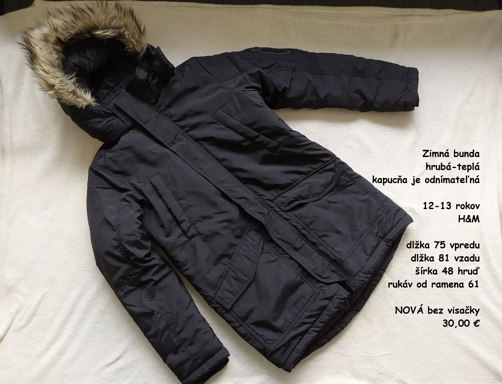 Dĺžka 75cm vpredu, dĺžka 81cm vzadu, šírka hruď 48cm, rukáv od ramena 61cm.