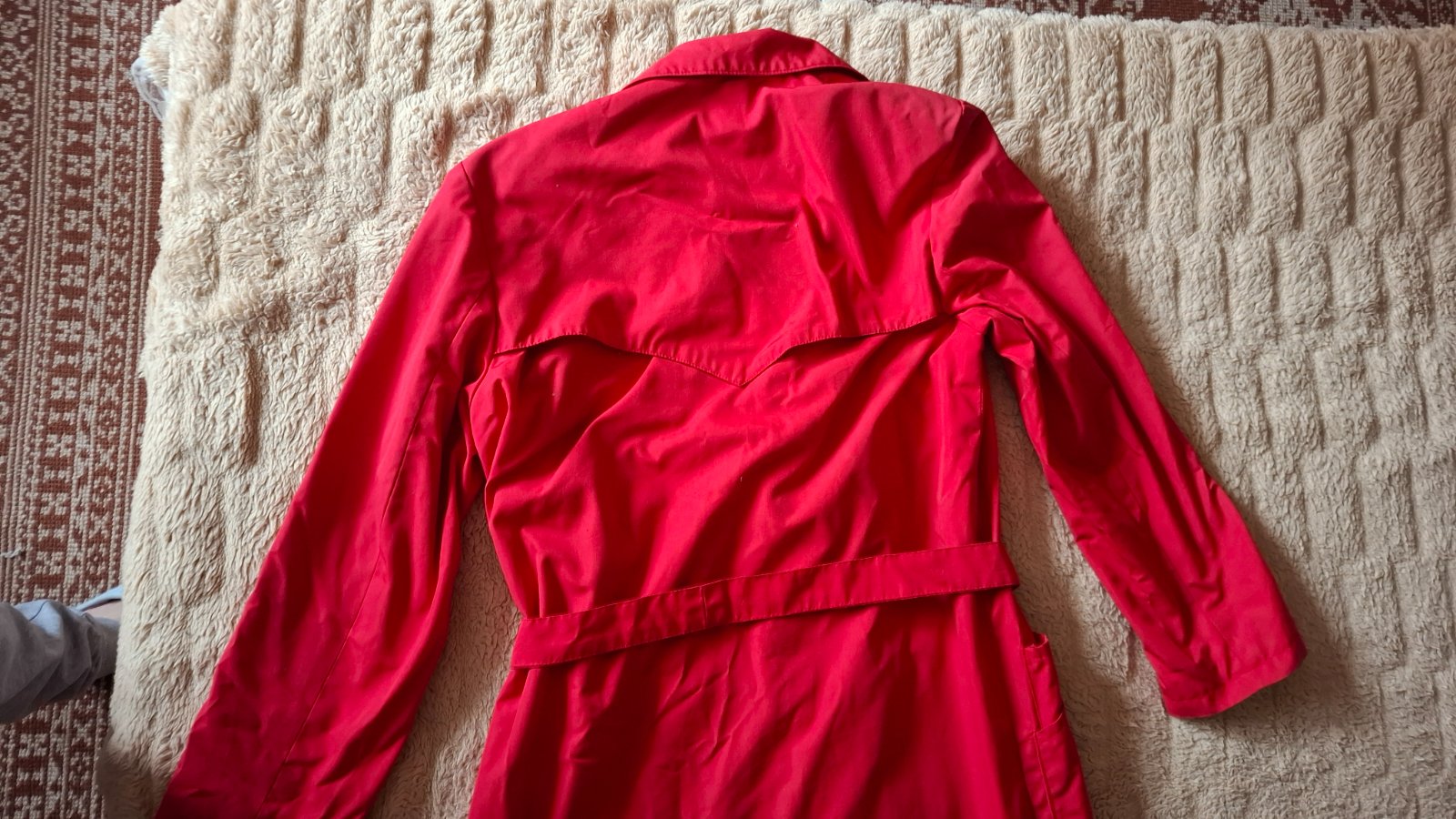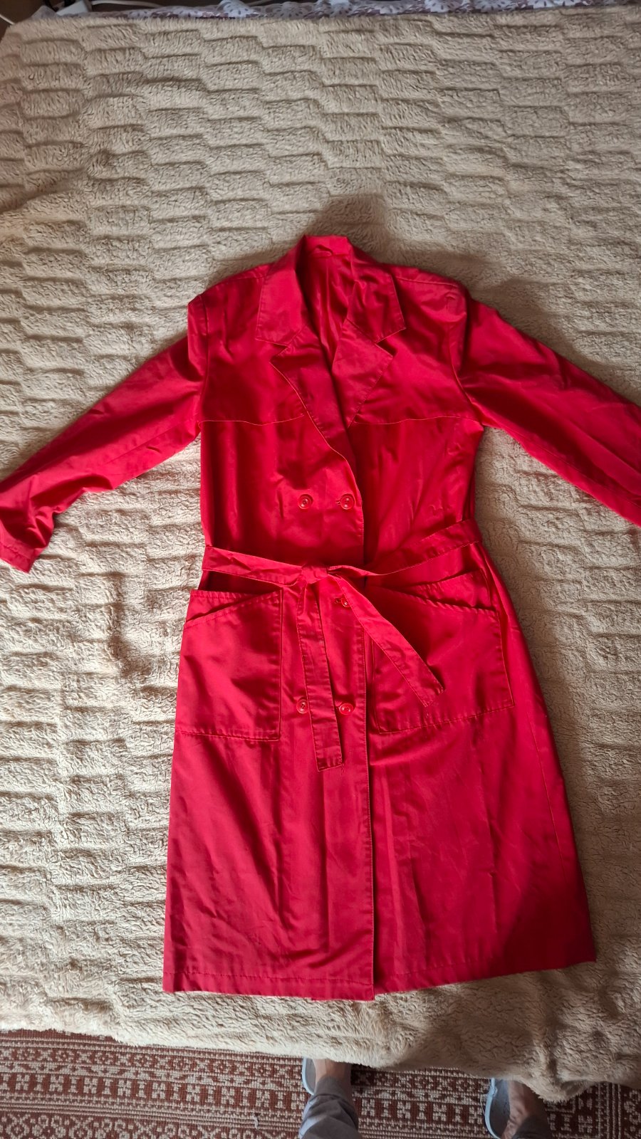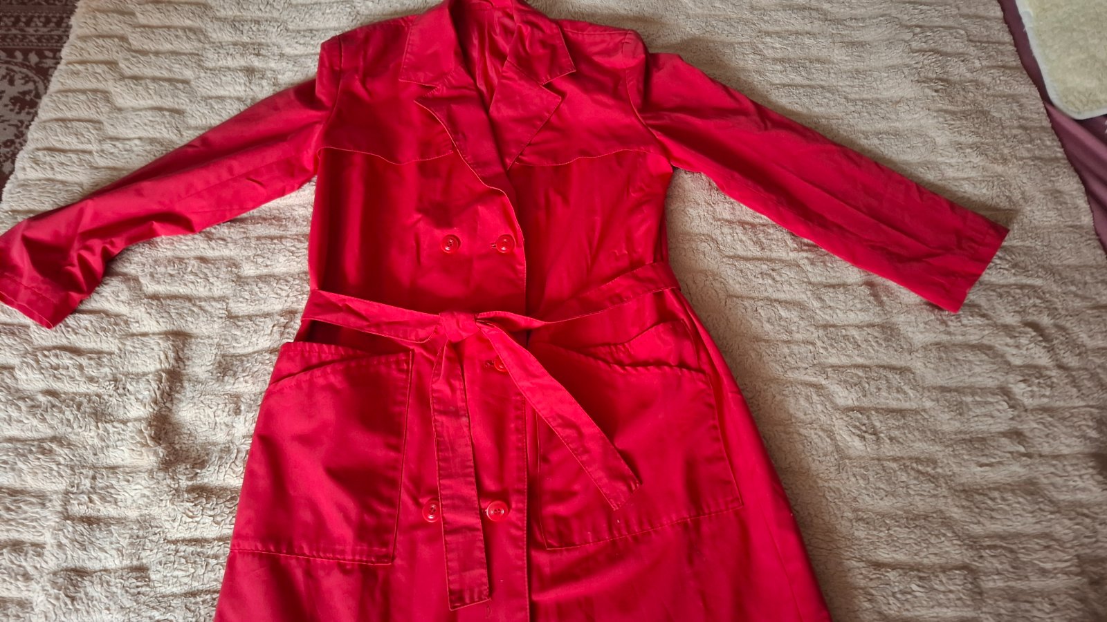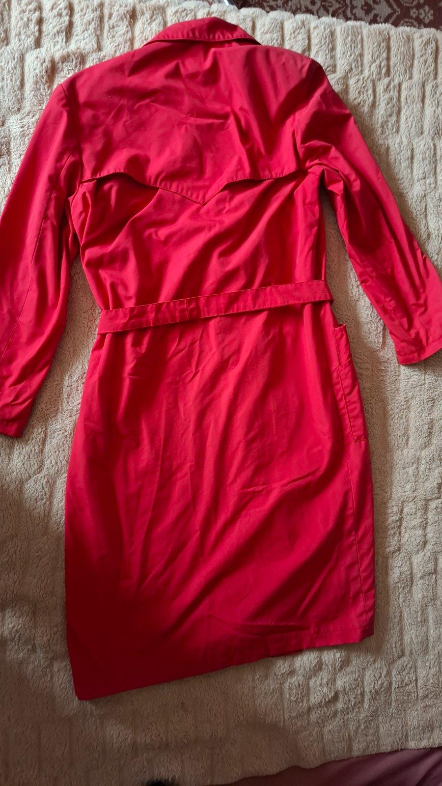 Dámsky kvalitný plášť vo veľ.i dobrom stave. Dĺžka 110 cm, obvod pod pazuchami 110 cm, obvod v páse 100 cm. Opasok, po bokoch 4 funkčné vrecká.