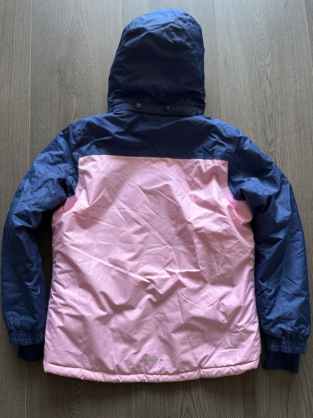 Tepla bundicka, 146. Na rukáve poškodená, vidndeta foto. Inak plne funkčná, zipsy, vrecka v poriadku. Po jednom dievčati.