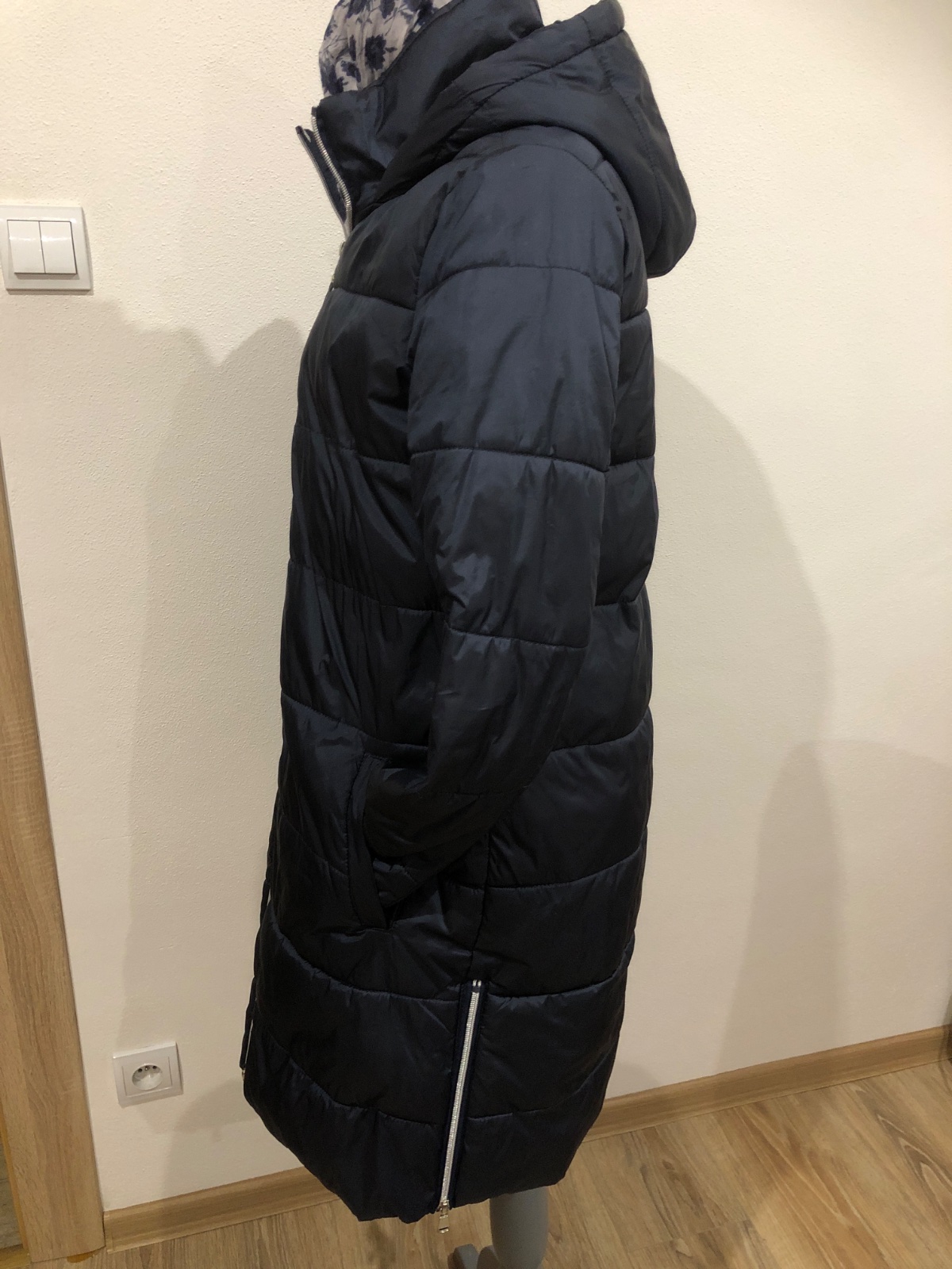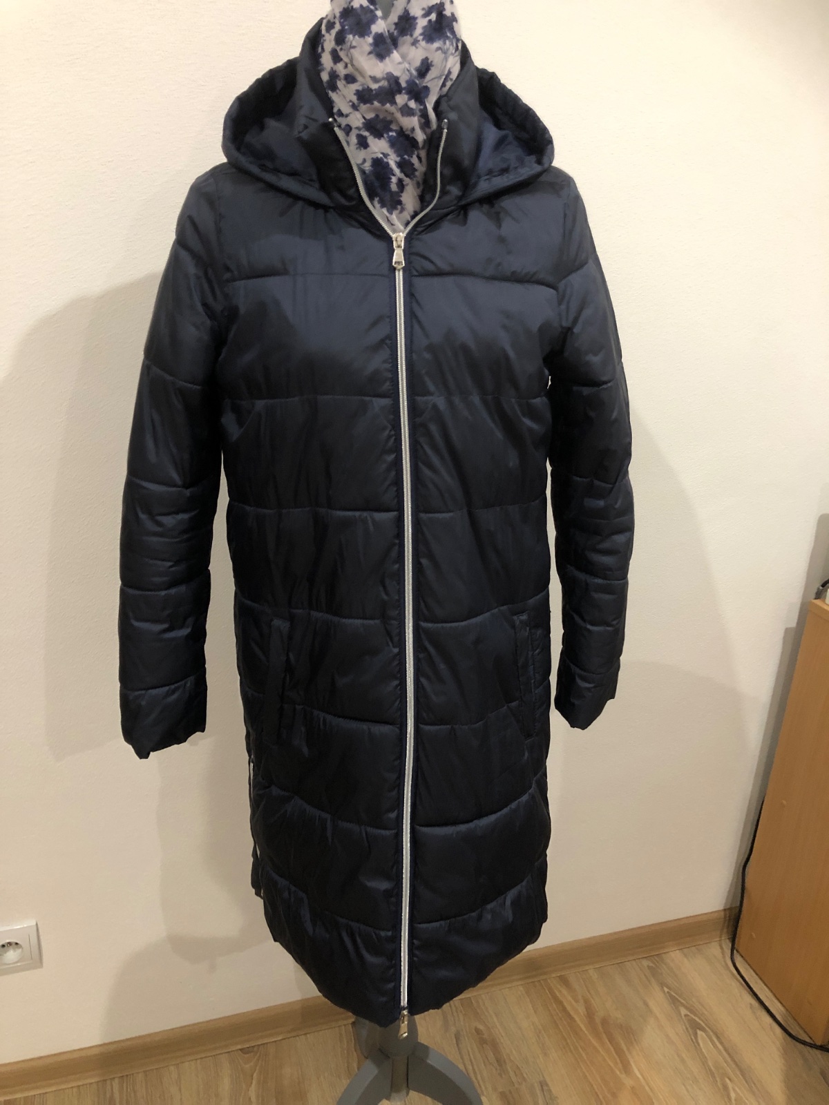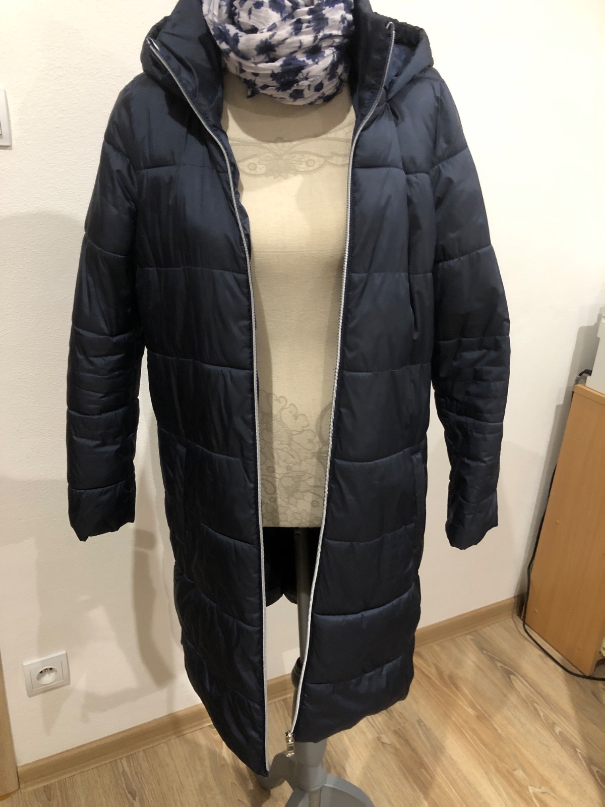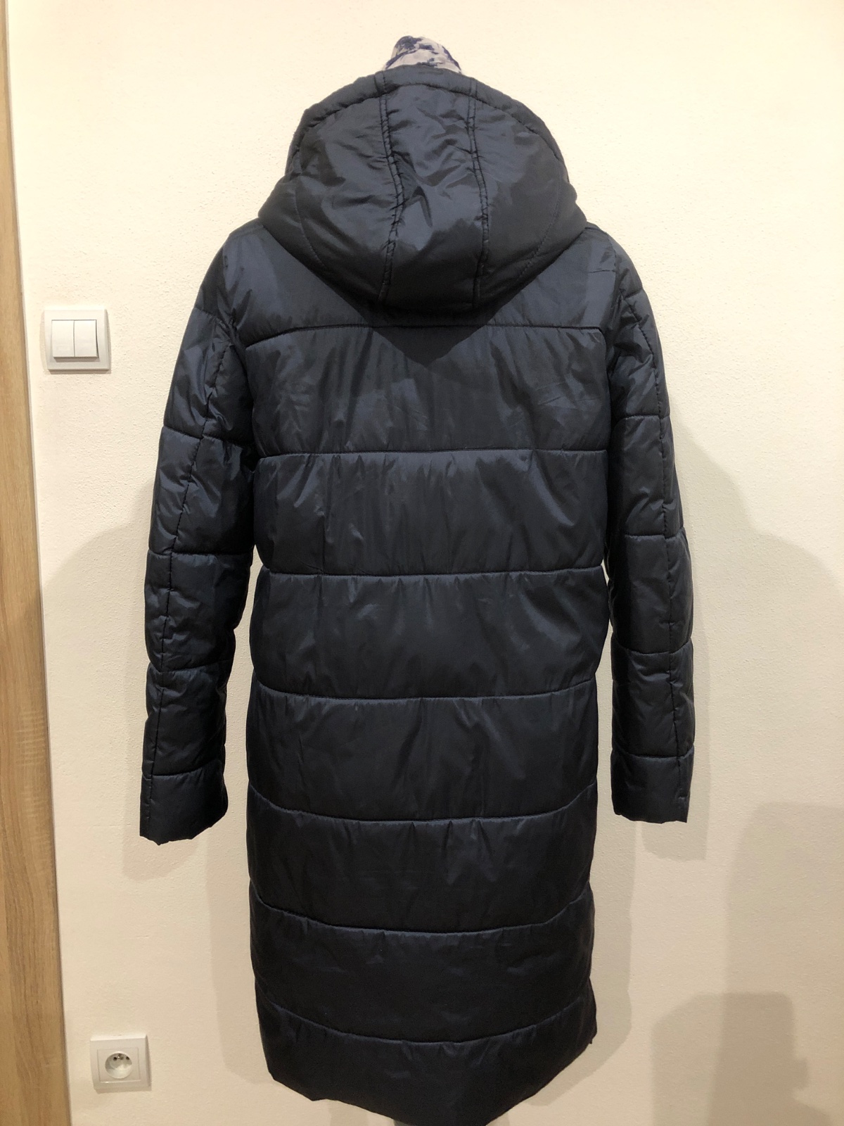 zimna bunda s kapucňou vo veľmi dobrom stave vhodná na miernu zimu alebo prechodne obdobie, zips plne funkčný, celková dĺžka 93cm, šírka v podpazuší 50cm, dĺžka rukáva 62cm