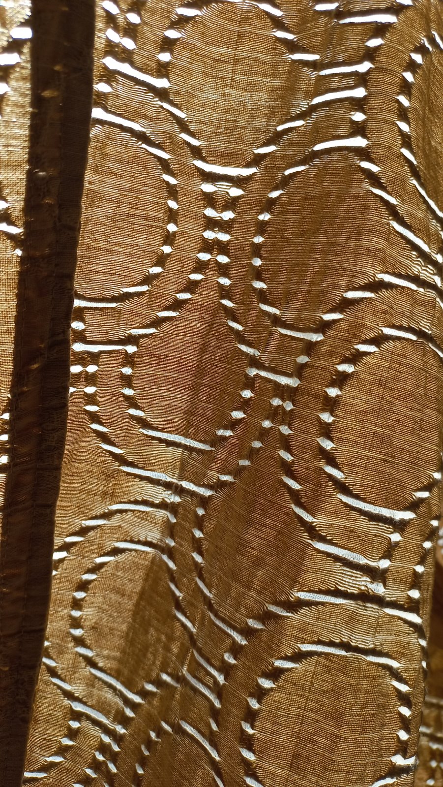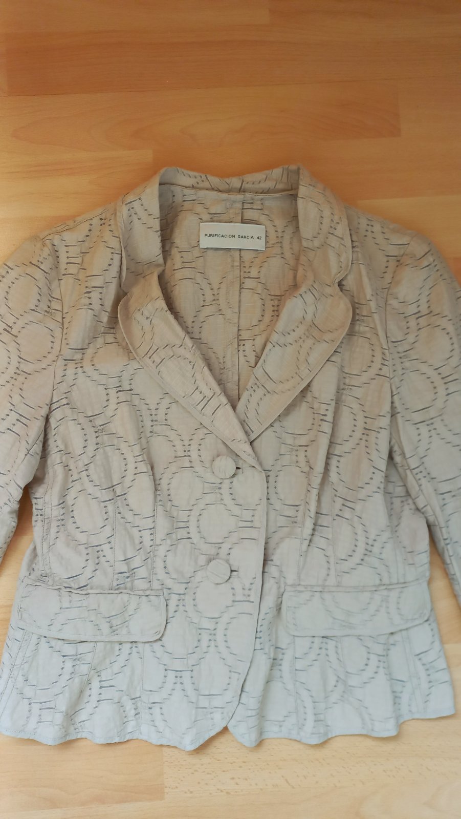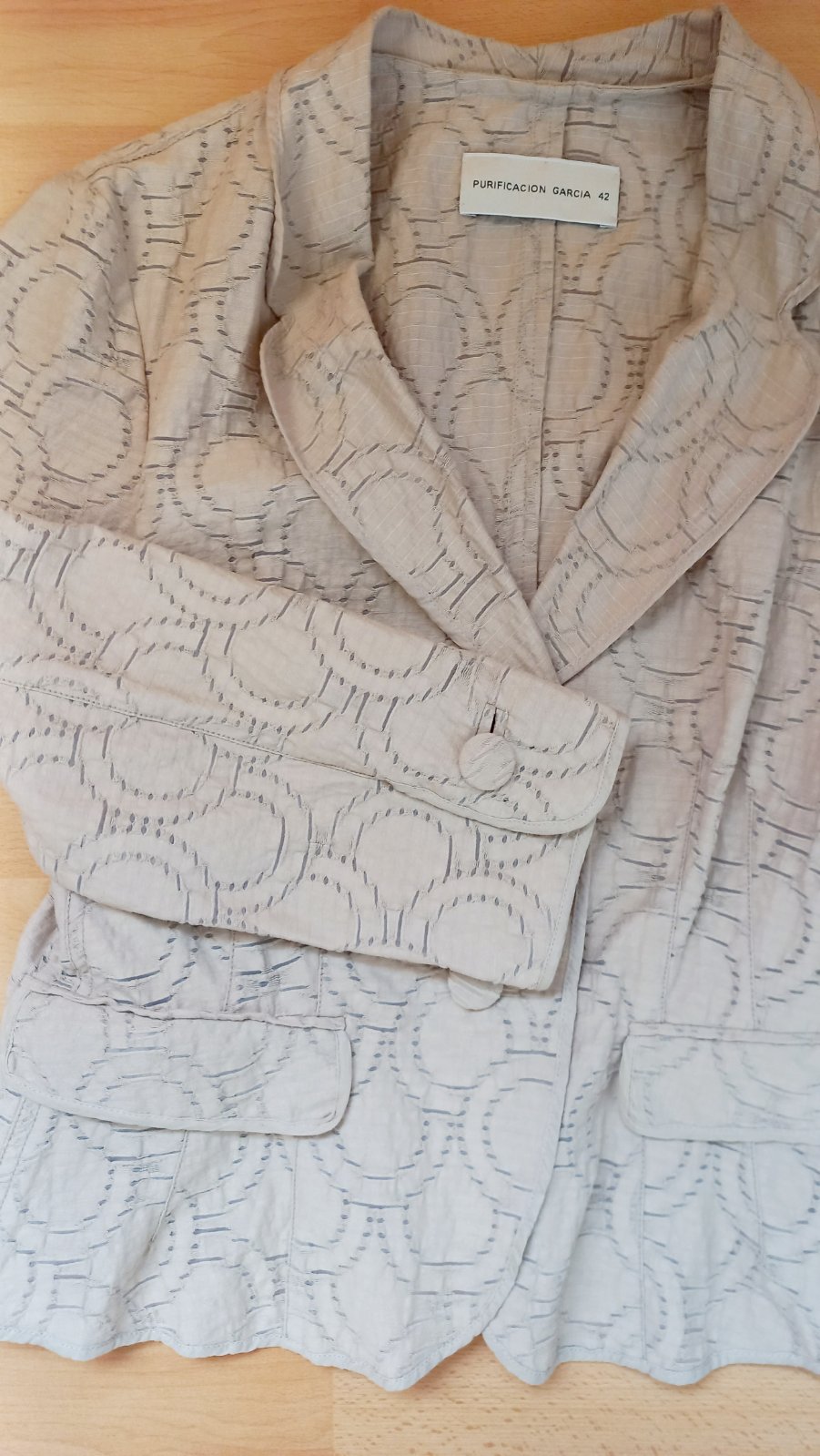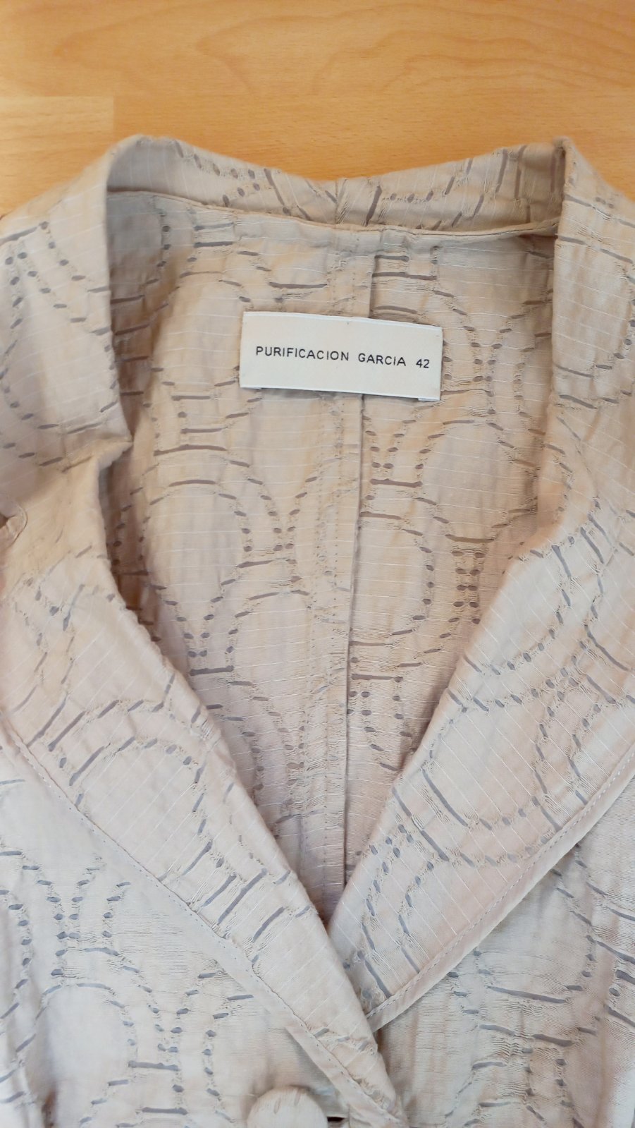 Úplne netradičný a netuctový kúsok. Sako bez podšívky, originálne prevedenie. Fotka je aj oproti svetlu, pôsobí ako madeira. Lahulinké, pohodlné. 49 šírka, 57 dĺžka. Dovezené z Portugalska, je aj štítok na saku. ZN:PURIFICATION GARCIA. na štítku je veľkosť 42 , no treba sa zmerať. Rukávy sú 3/4. Vhodné pre M/L. Da sa aj okolo krku dvihnut golier, vid foto. Je strihana vrchná časť v celku okolo krku. Otázky zodpoviem