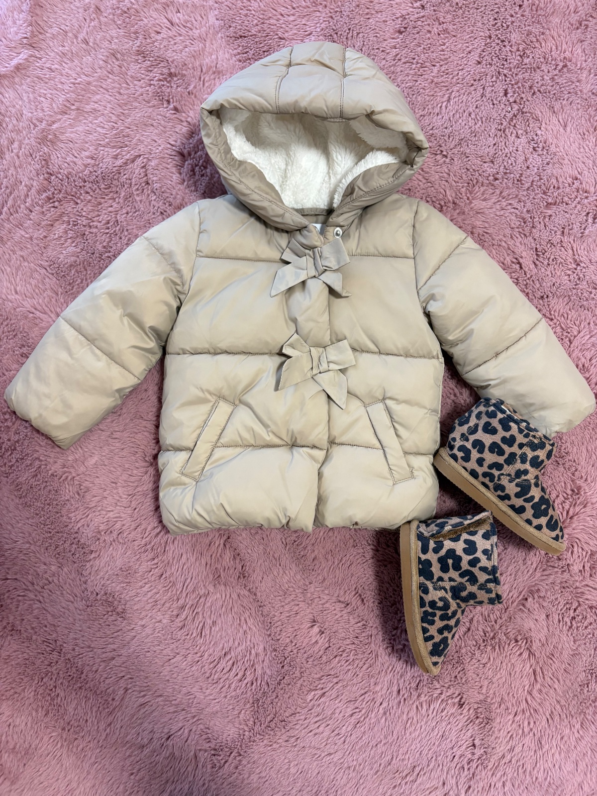 zimná bundička s kapucňou, zvnútra zateplené kožušinou, uvádzaná veľkosť 86 ale kľudne vynosíte aj ako 92, okolo rukávov sú patenty, neppdfukuje preto pod rukaviky. Na bundičke je zapínanie zips +...