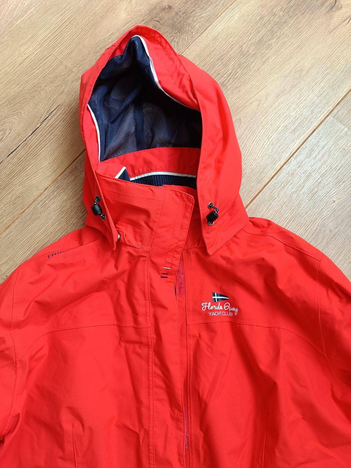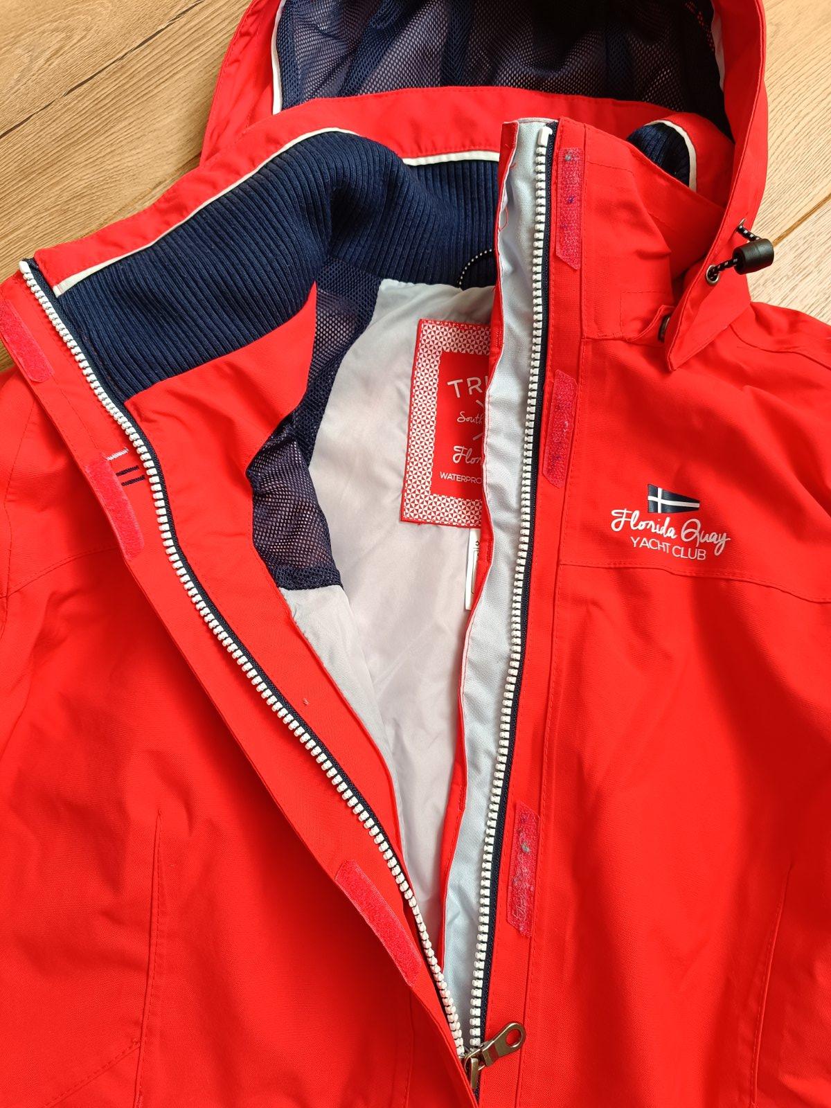 Vetrovka je vyrobena z nepremokavej latky v cervenej farbe, so zappinanim na zips a suchy zips. Vetrovka ma kapucnu a funkcne vrecka.