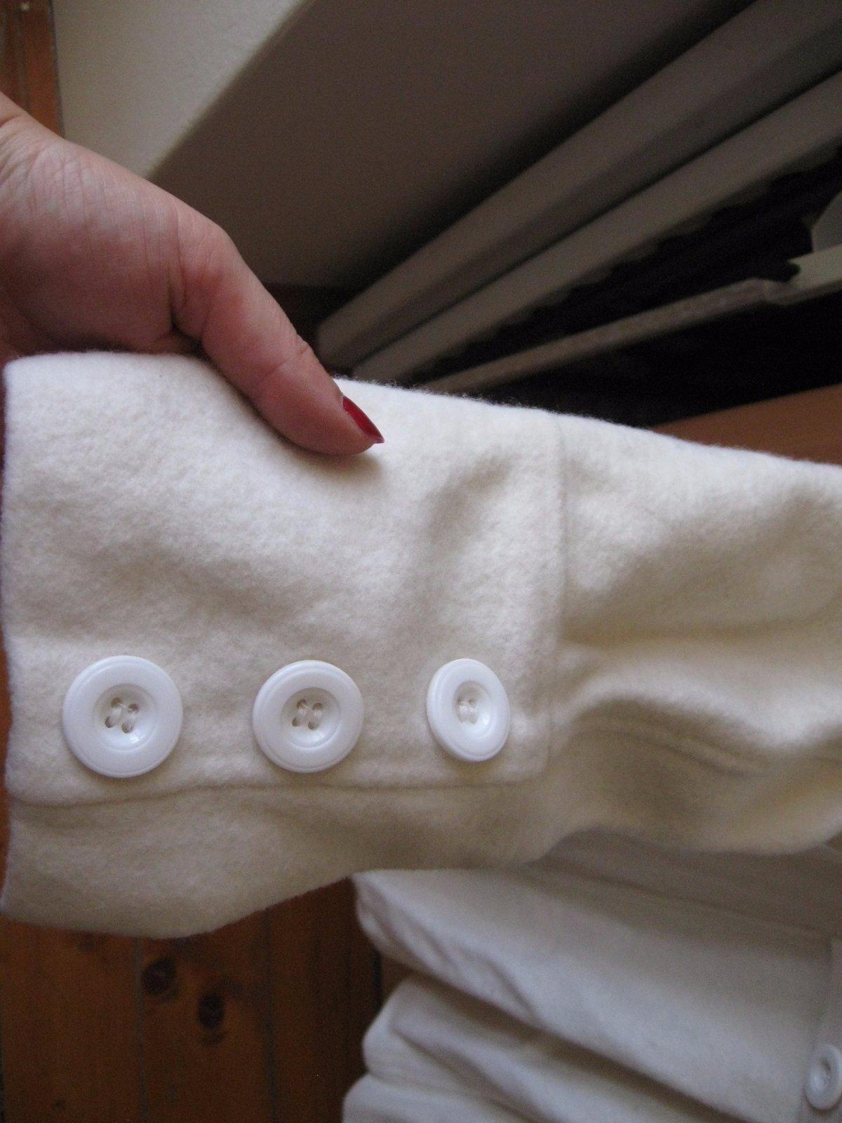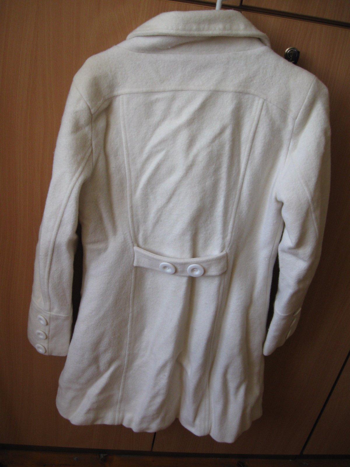 Zachovalý dámsky kabát, veľkosť S/M, biela farba, ale skôr taká smotanová, celková dĺžka 81 cm, rukáv 57 cm, šírka 2x41 cm