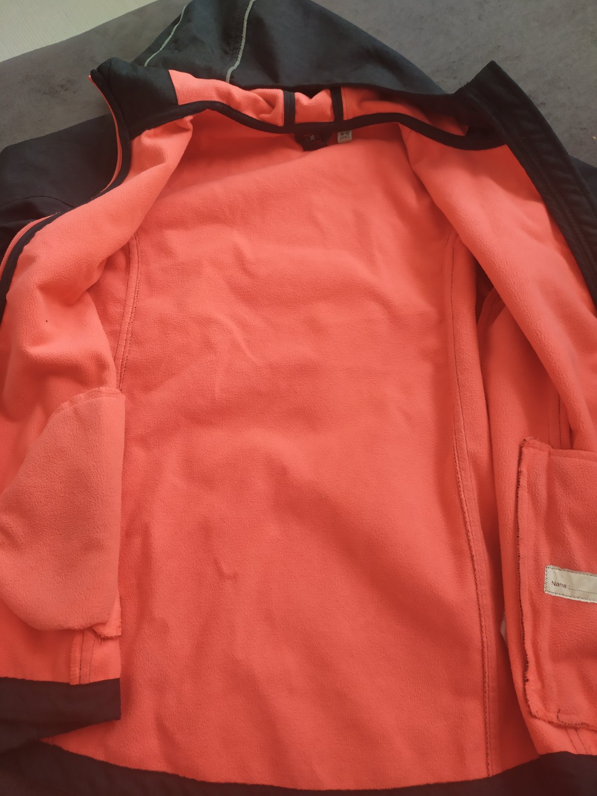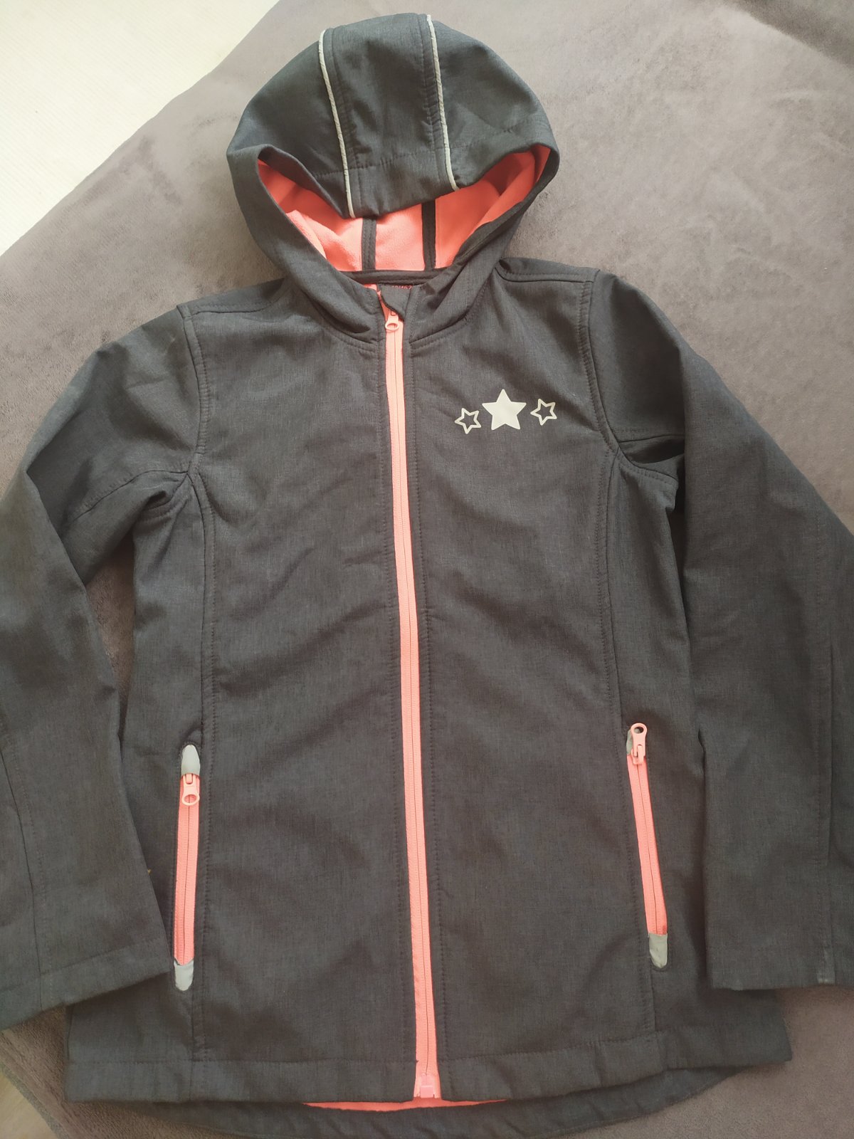 Zachovalá bunda po mojej dcérke tmavošeda s lososovou dekovinou vo vnútri aj zipsami.