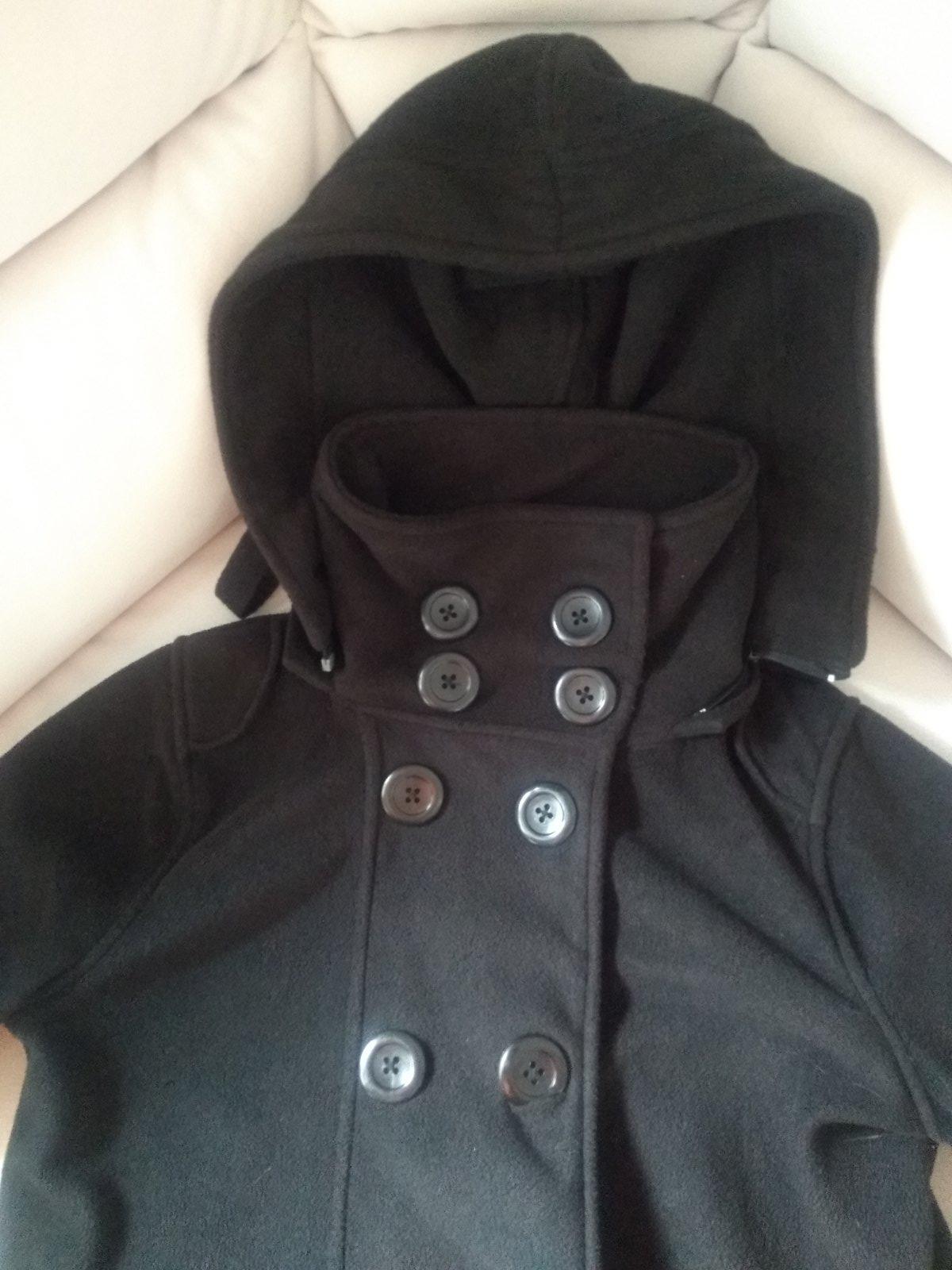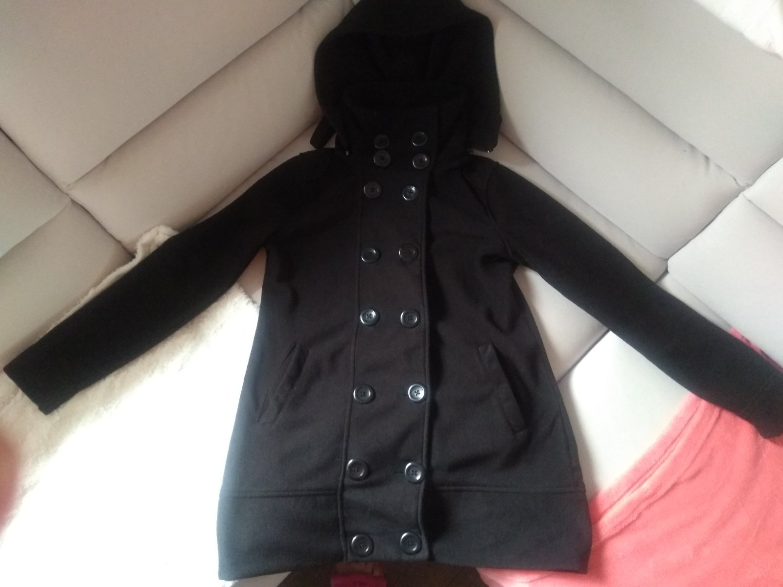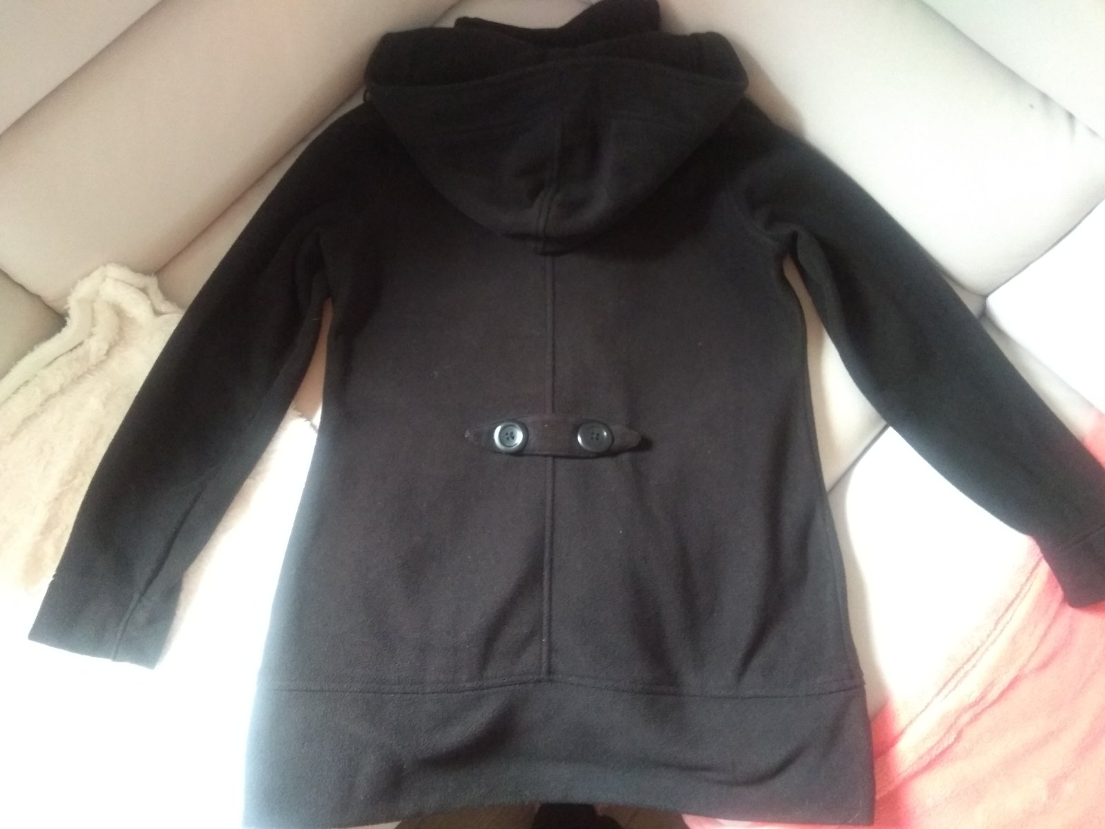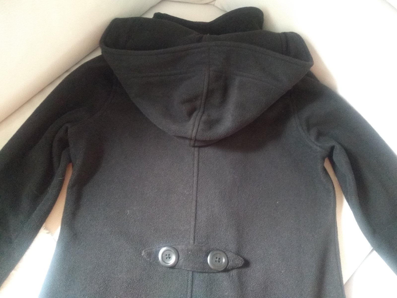 Pekny prechodny kabatik s kapucou a kozusinkou. Bez poskodeni. Noseny velmi malo. Zapinanie na gombiky, viazanie okolo pasu. Dlzka 64 cm, sirka v pase 39x2, dlzka rukavu 59 cm.