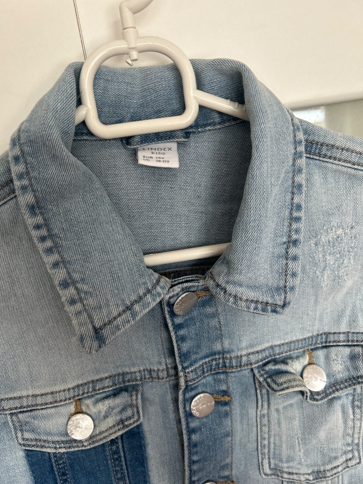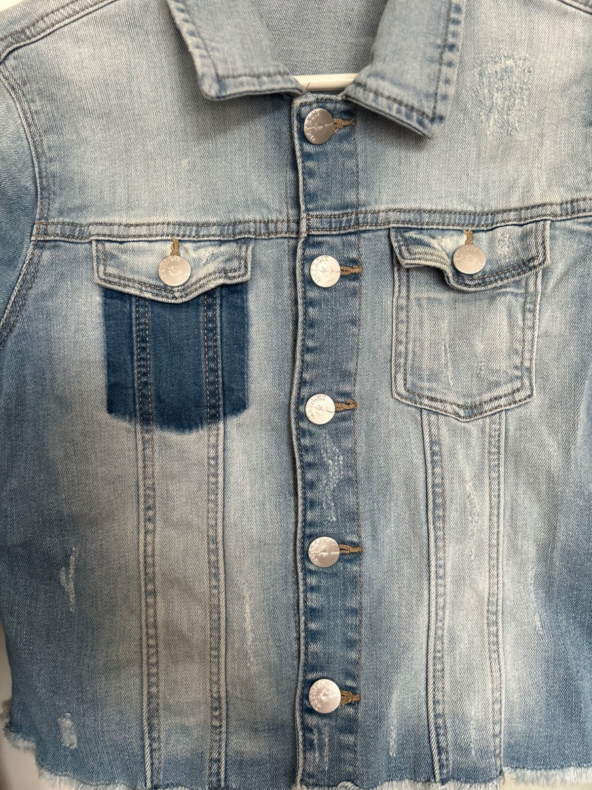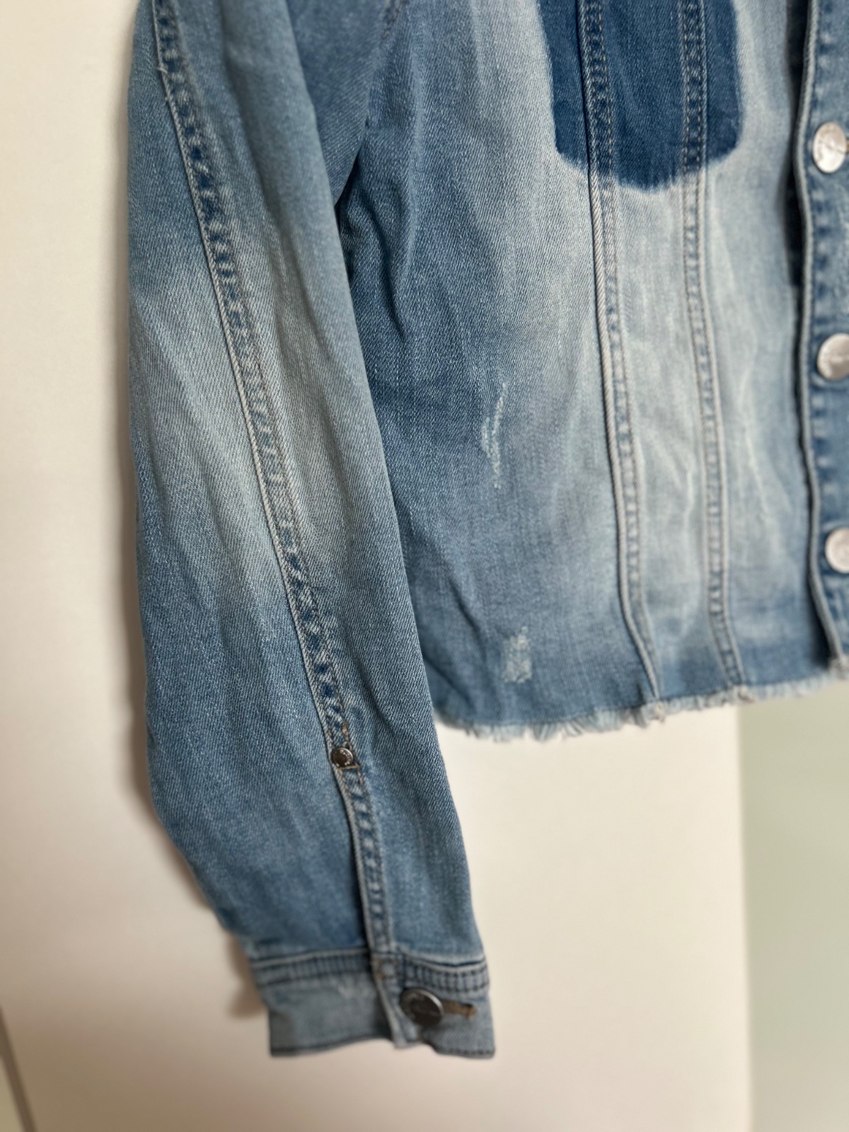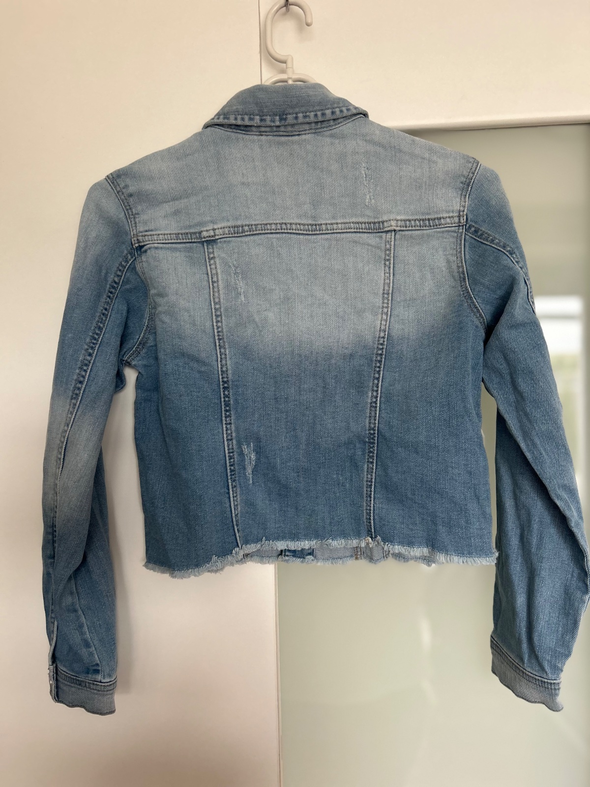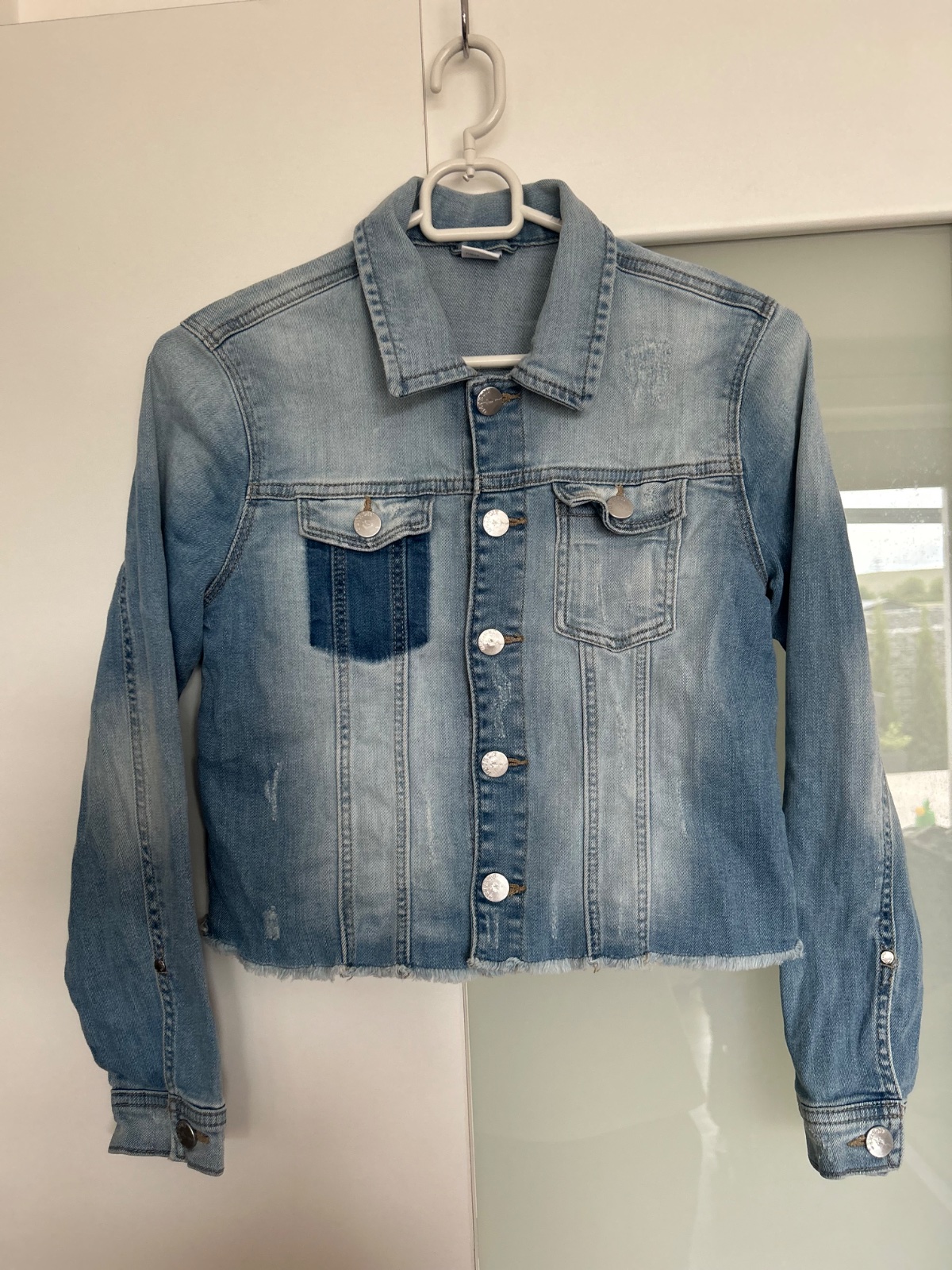 Top stav, krásna farba, tenšia ale pevná rifľovina, spodok rozstrapkaný, vzadu na spodku malý žltý fliačik, je ale tak slabý, že nešiel ani nafotiť, dl. 40, š.40, rukáv 12+52