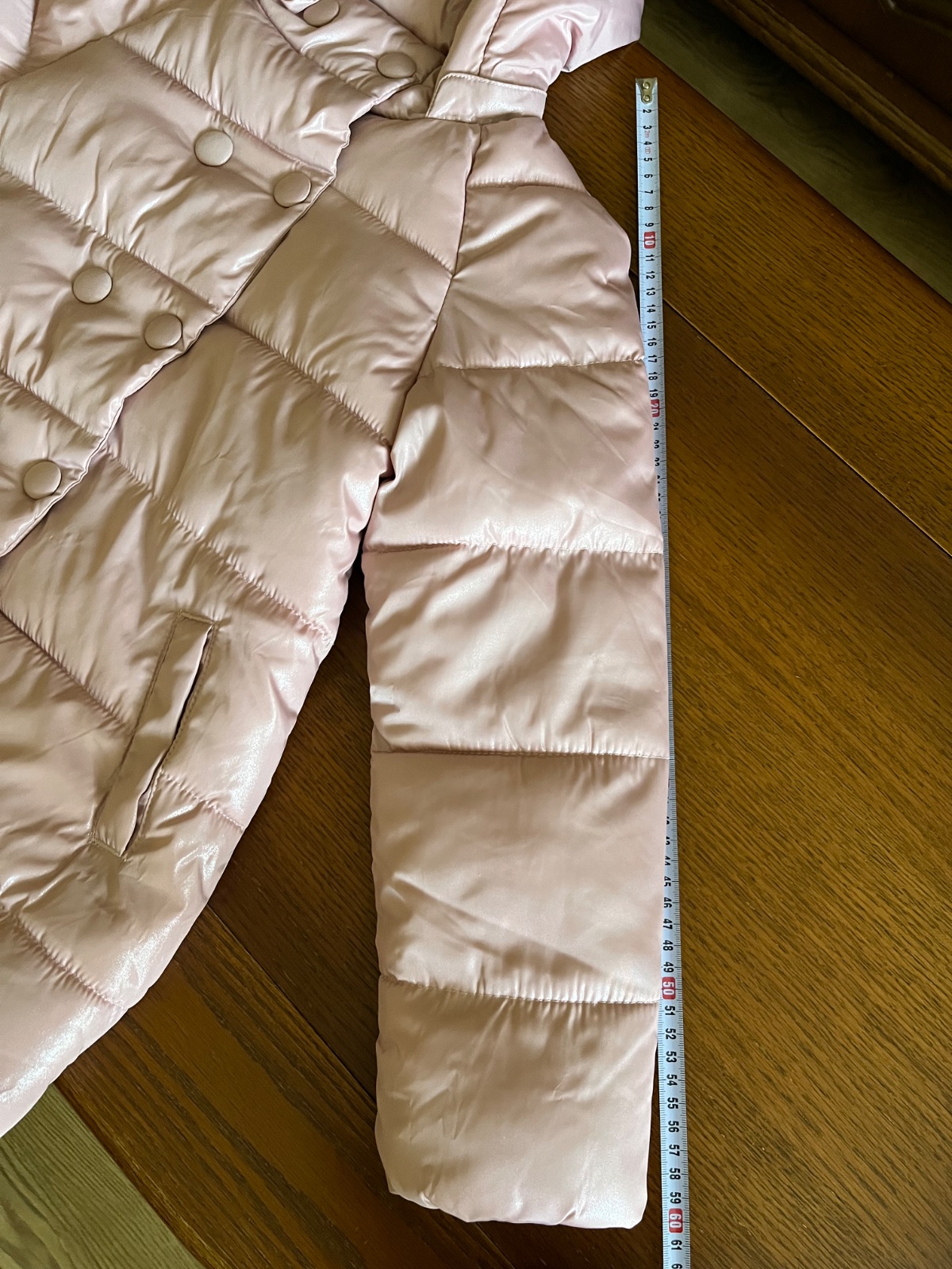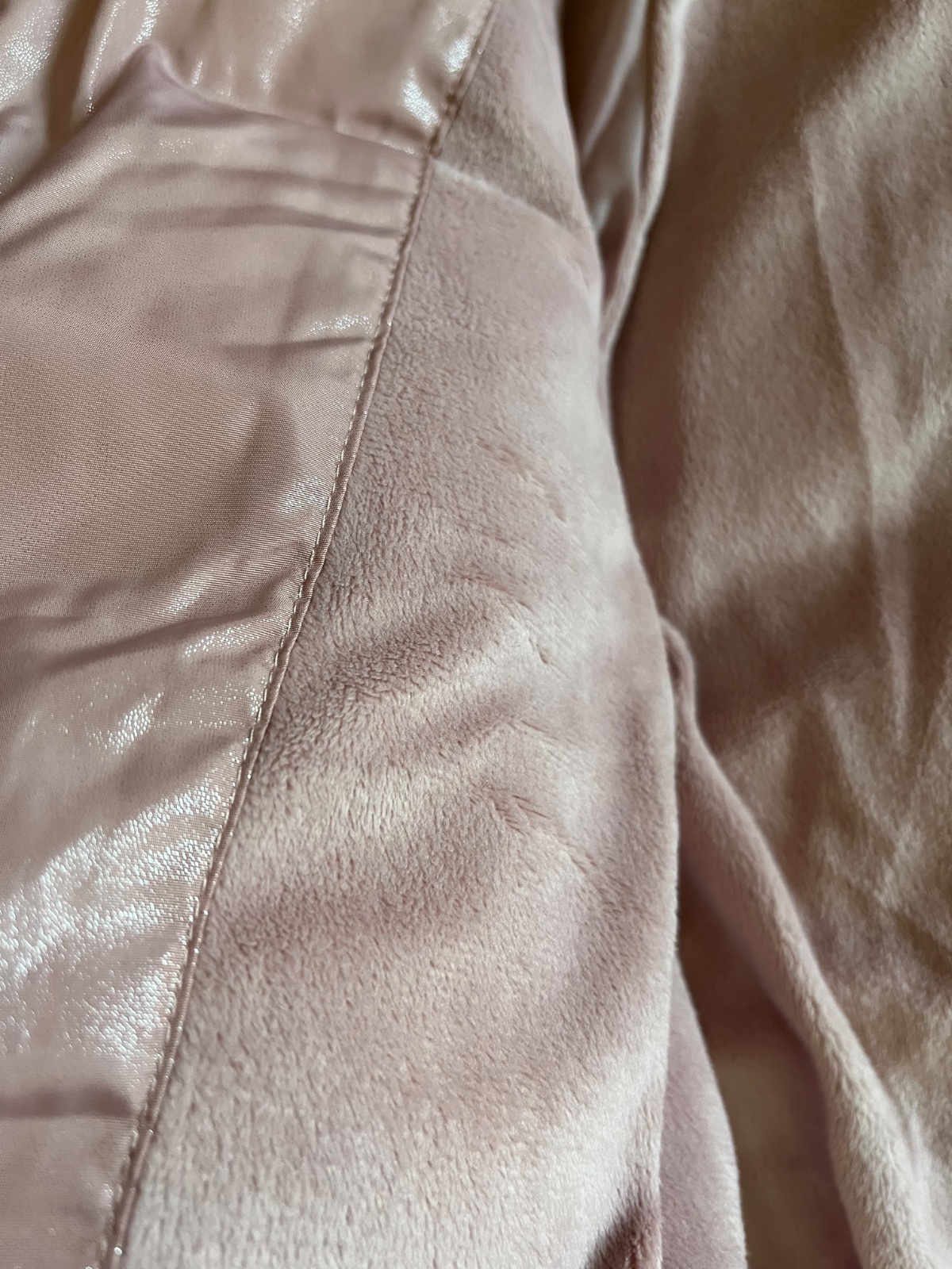 Krásna baby pink farba s elegantnou zlatou perleťou, kombinovaná so zlatými prvkami na bunde (zips, bežec, nity).